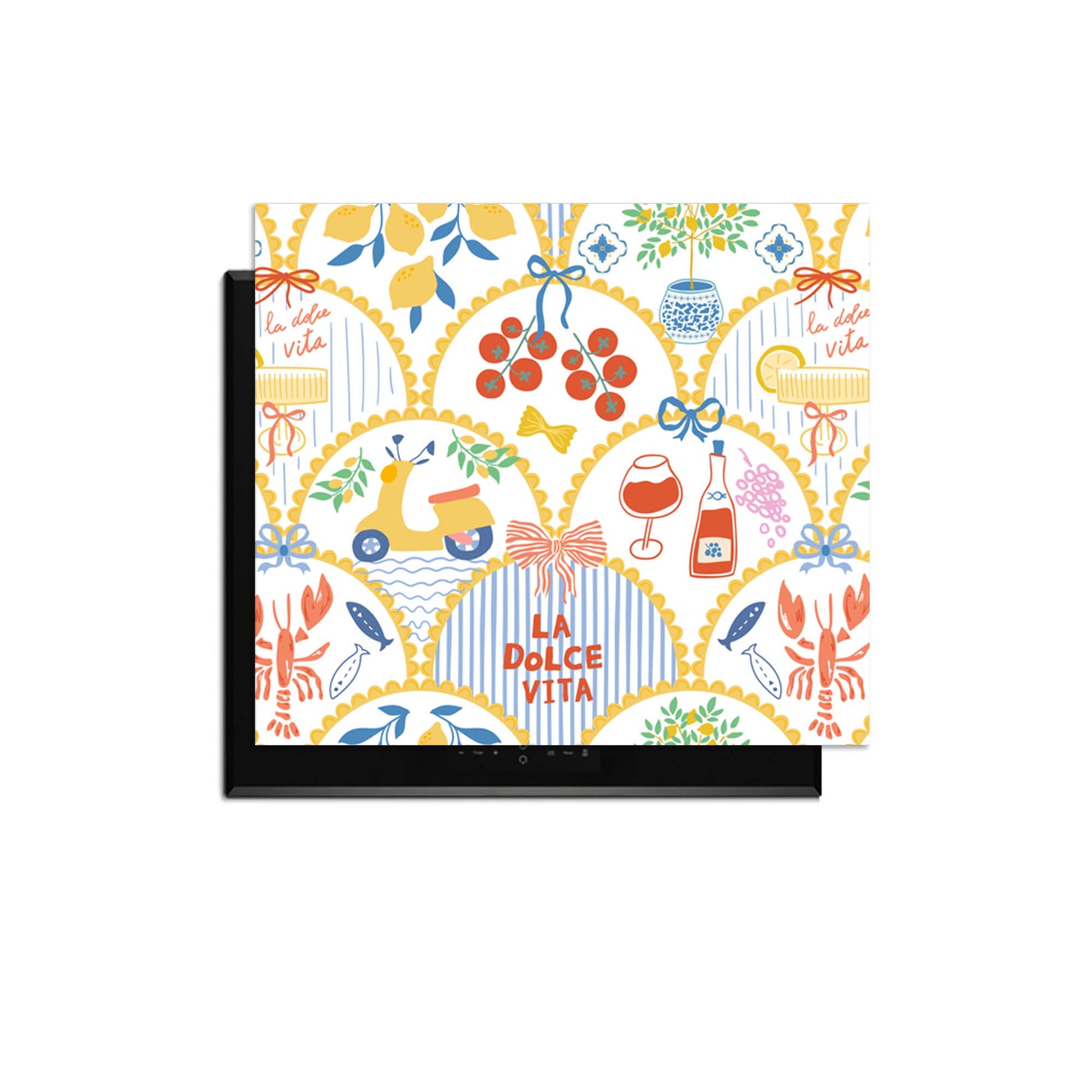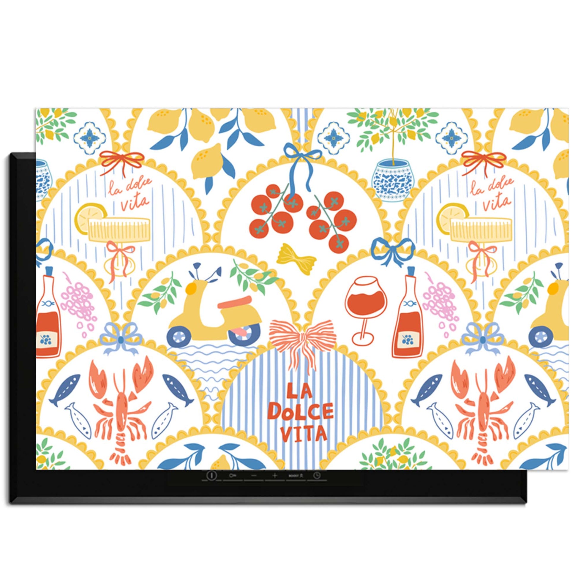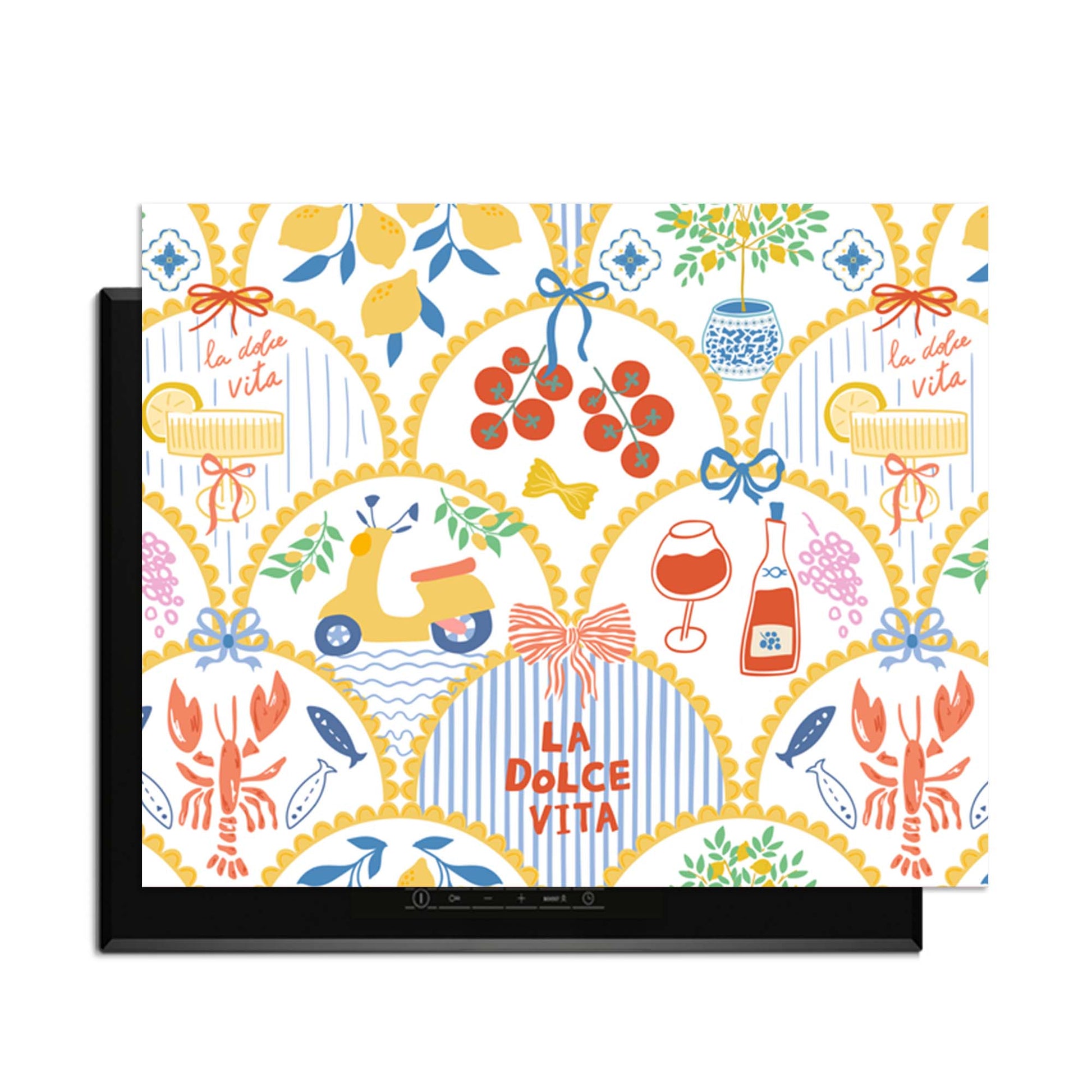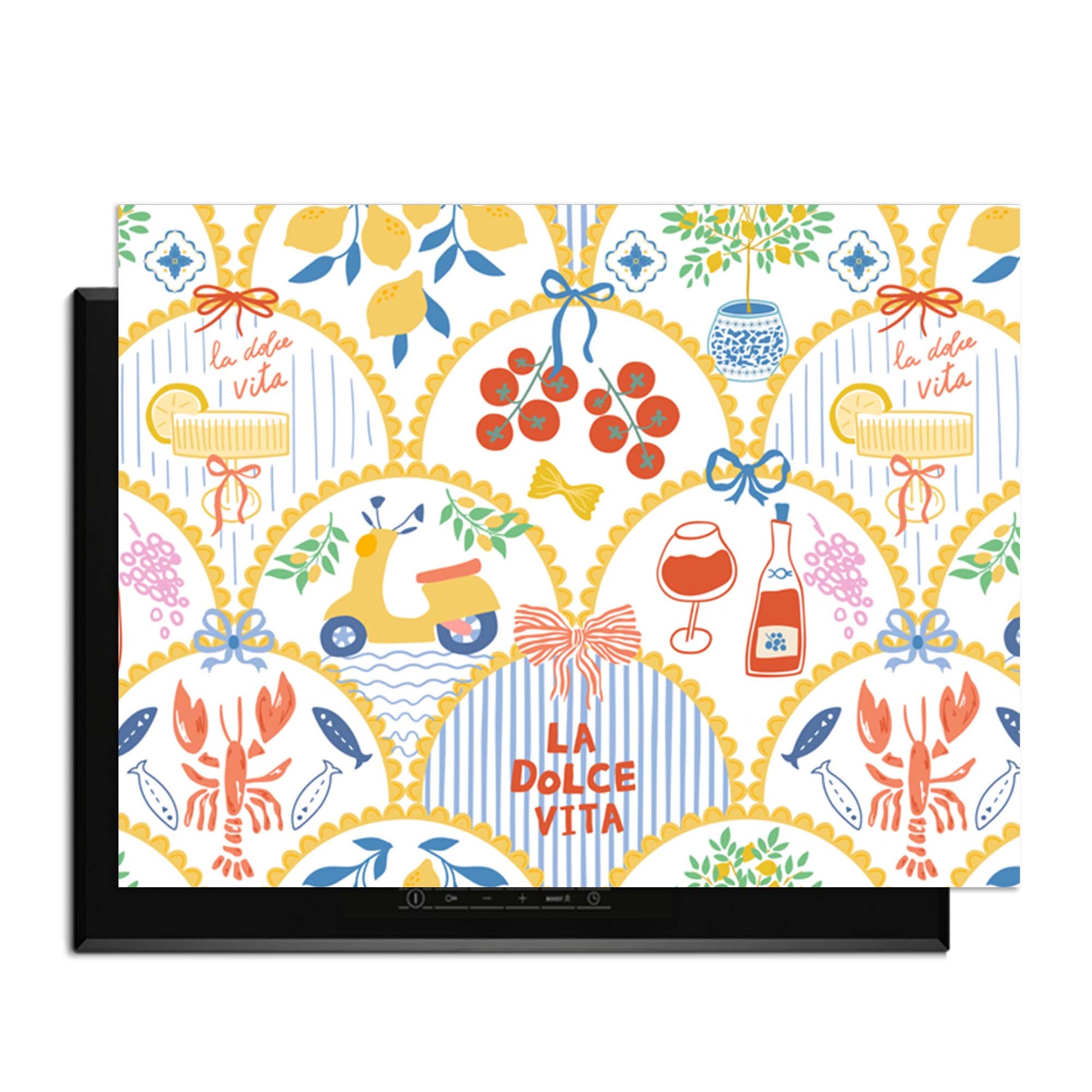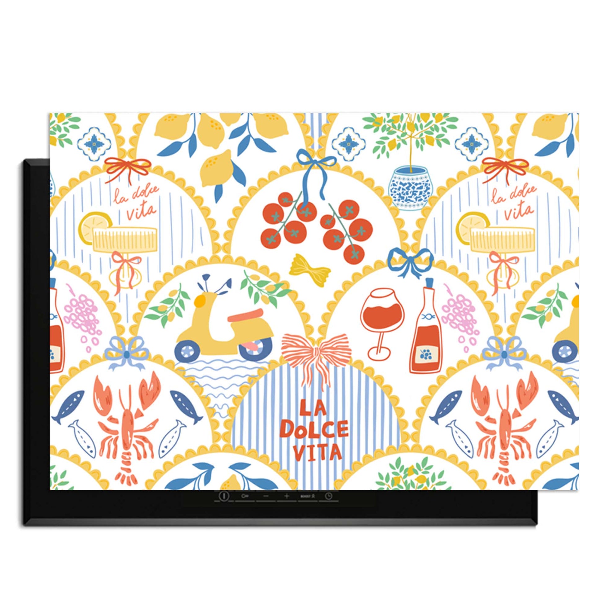 Dolce Fans bringt die sonnige, italienische Atmosphäre in Ihre Küche. Zitronen, Tomaten, Wein und Vespa-Details bilden ein verspieltes Design, das Ihr Induktionskochfeld fröhlich schützt.