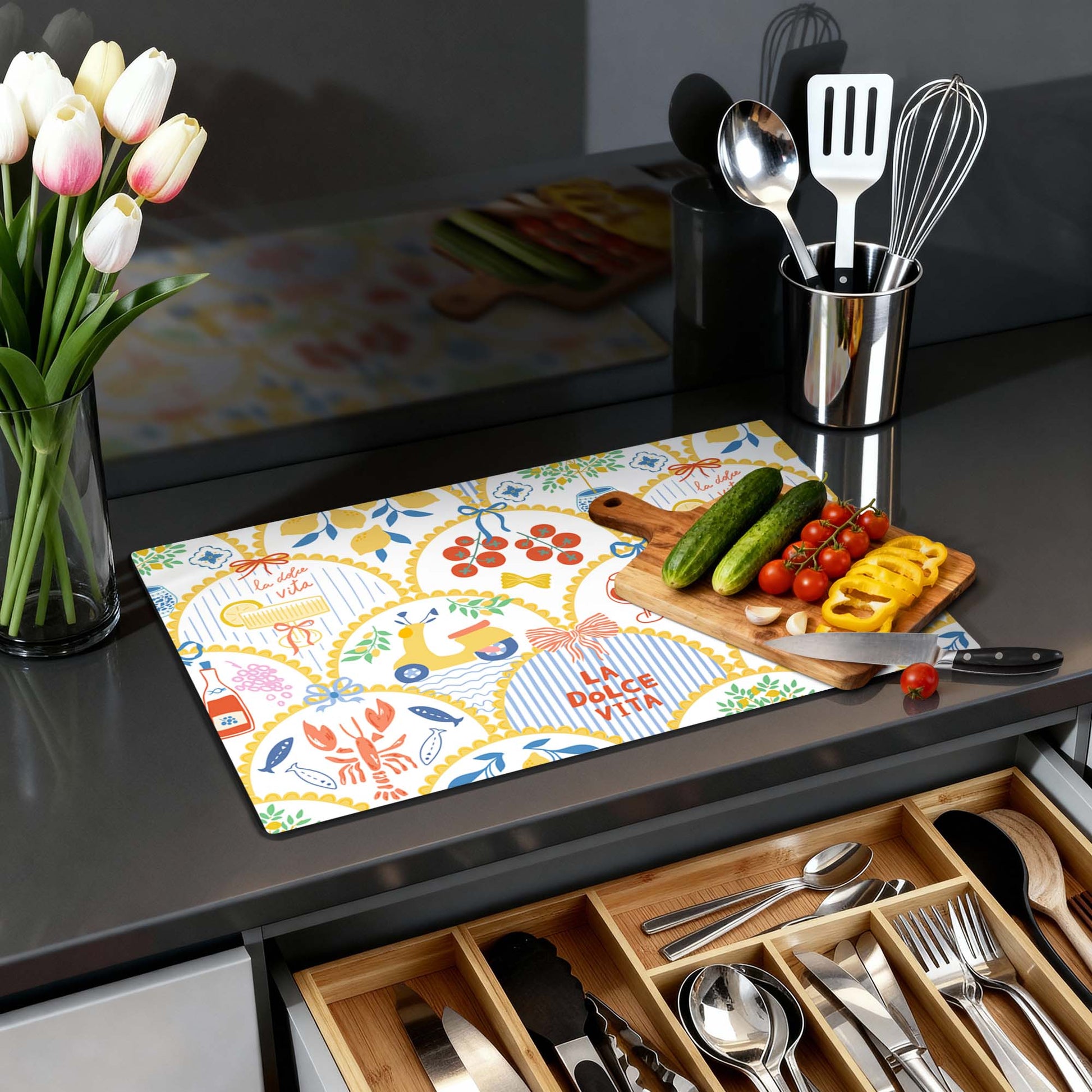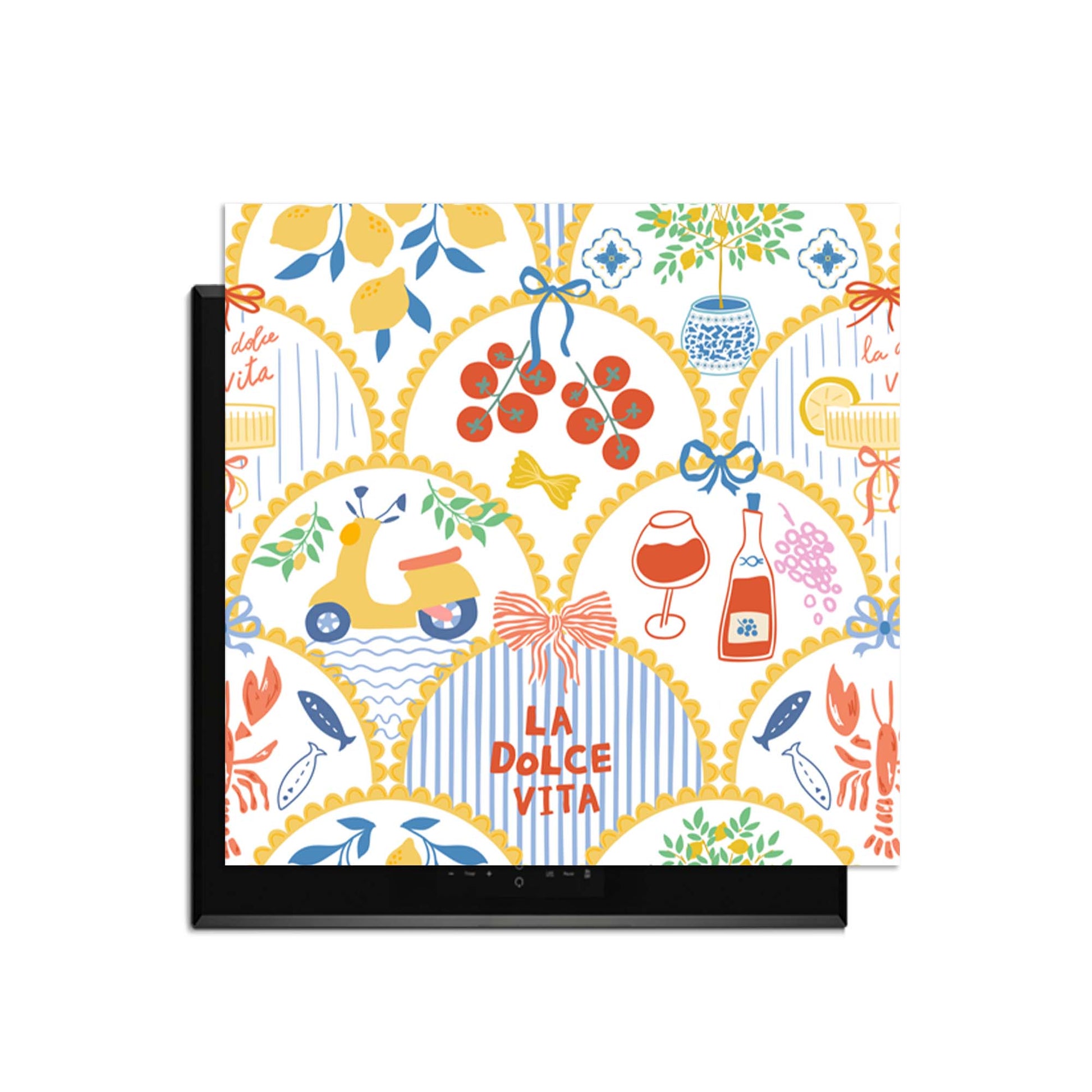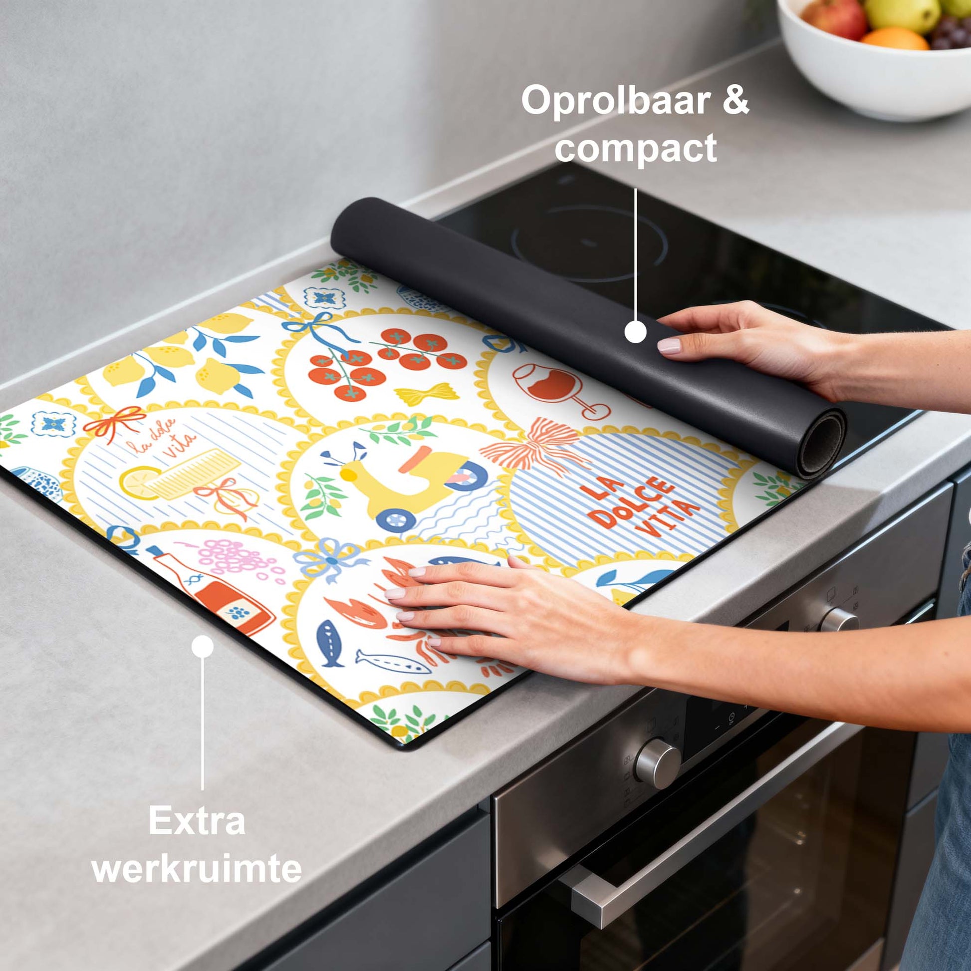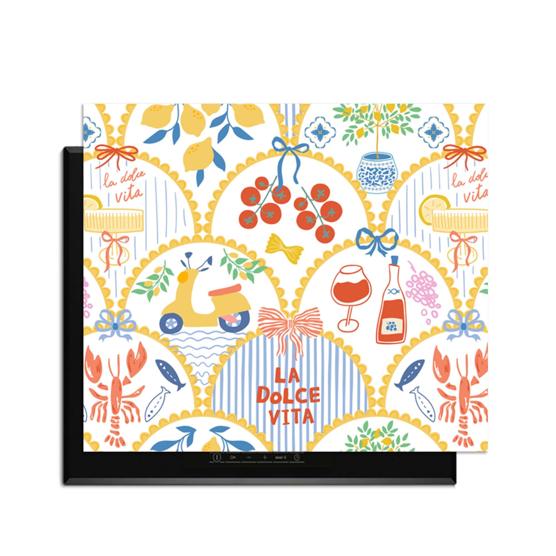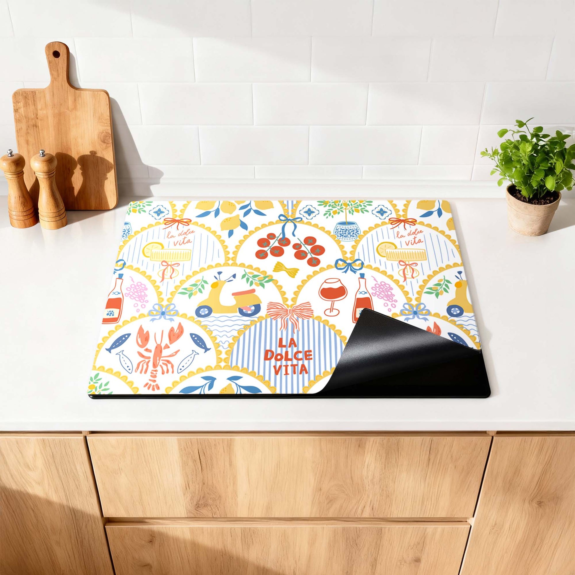 Dolce Fans bringt die sonnige, italienische Atmosphäre in Ihre Küche. Zitronen, Tomaten, Wein und Vespa-Details bilden ein verspieltes Design, das Ihr Induktionskochfeld fröhlich schützt.