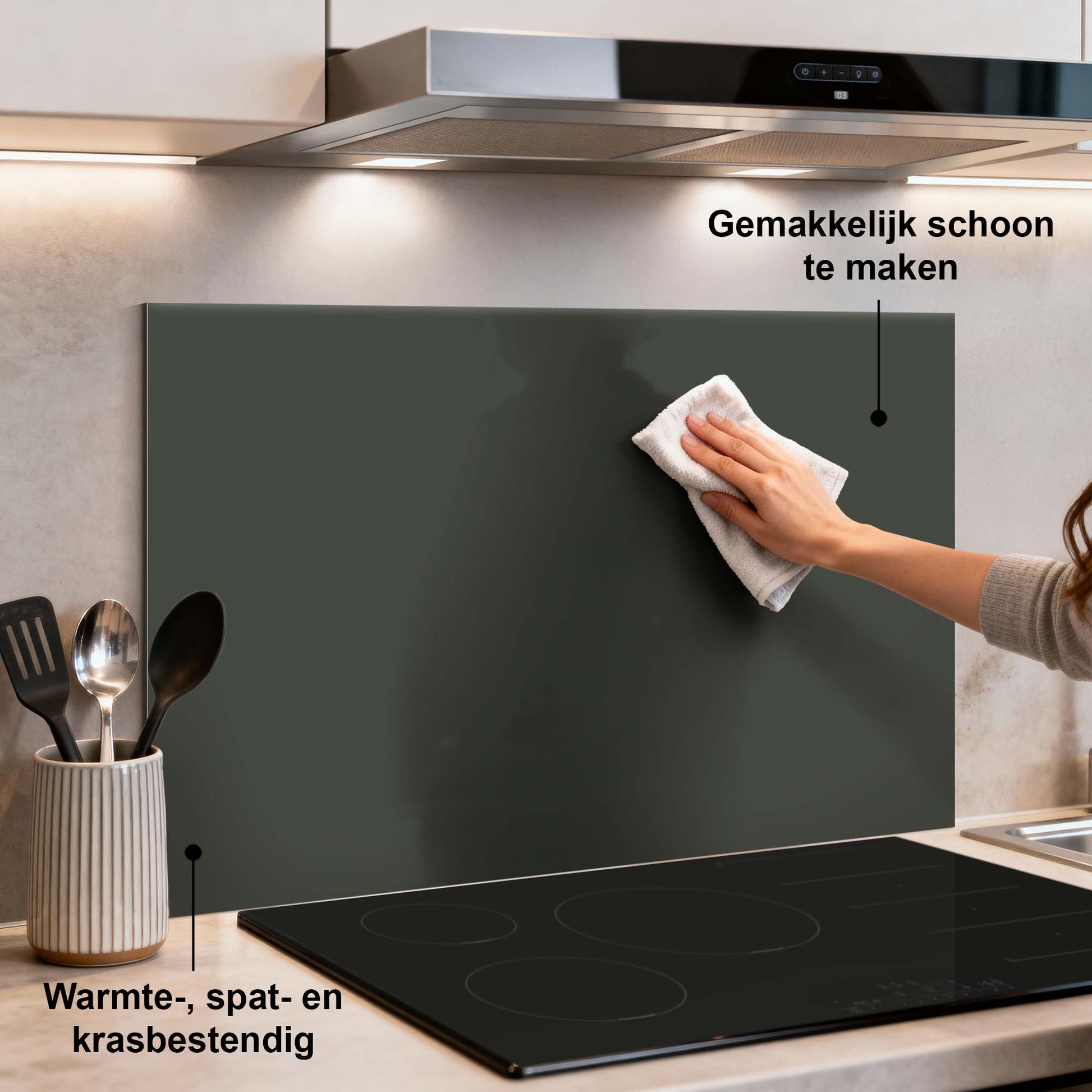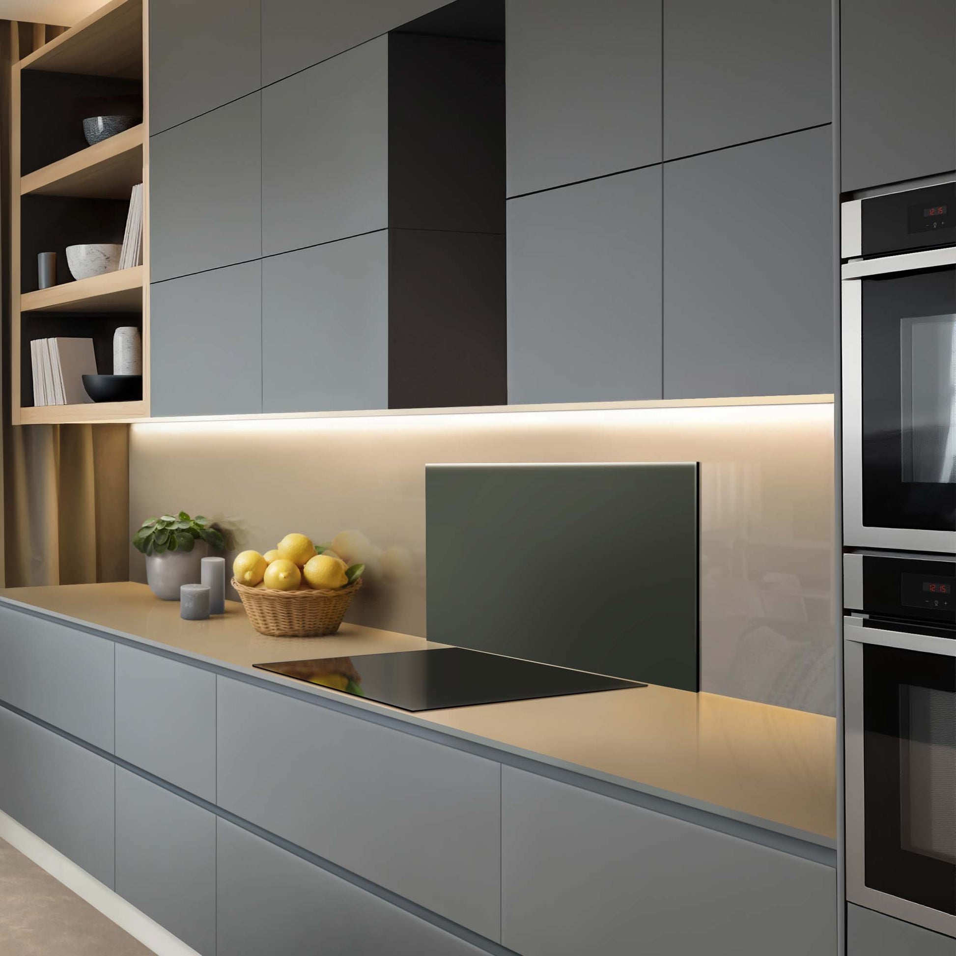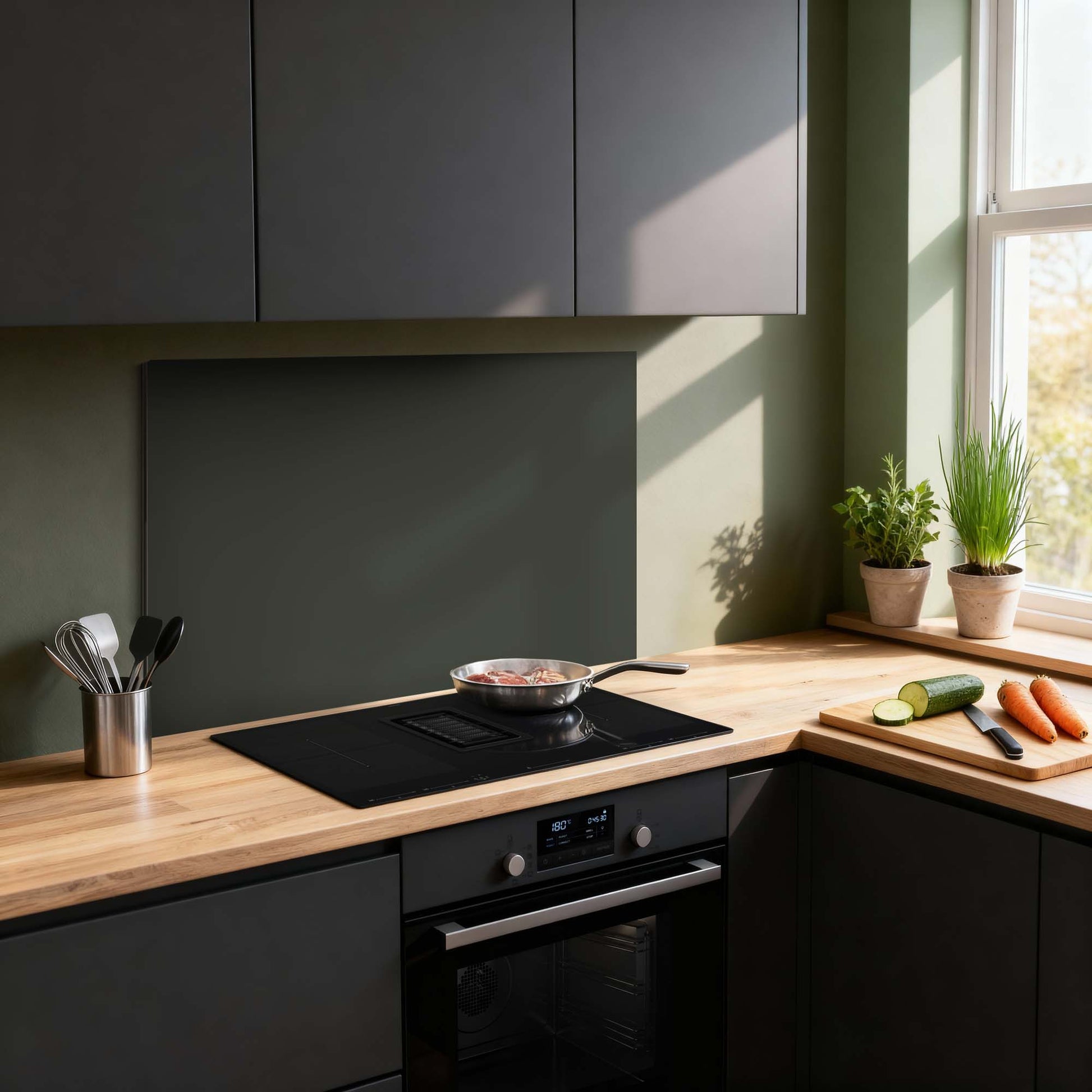 Climbing Ivy is een diepe, natuurlijke groentint die de keuken een kalme, moderne en luxe uitstraling geeft. Het effen spatscherm beschermt je muur en past prachtig bij hout, zwart en aardse kleuren.