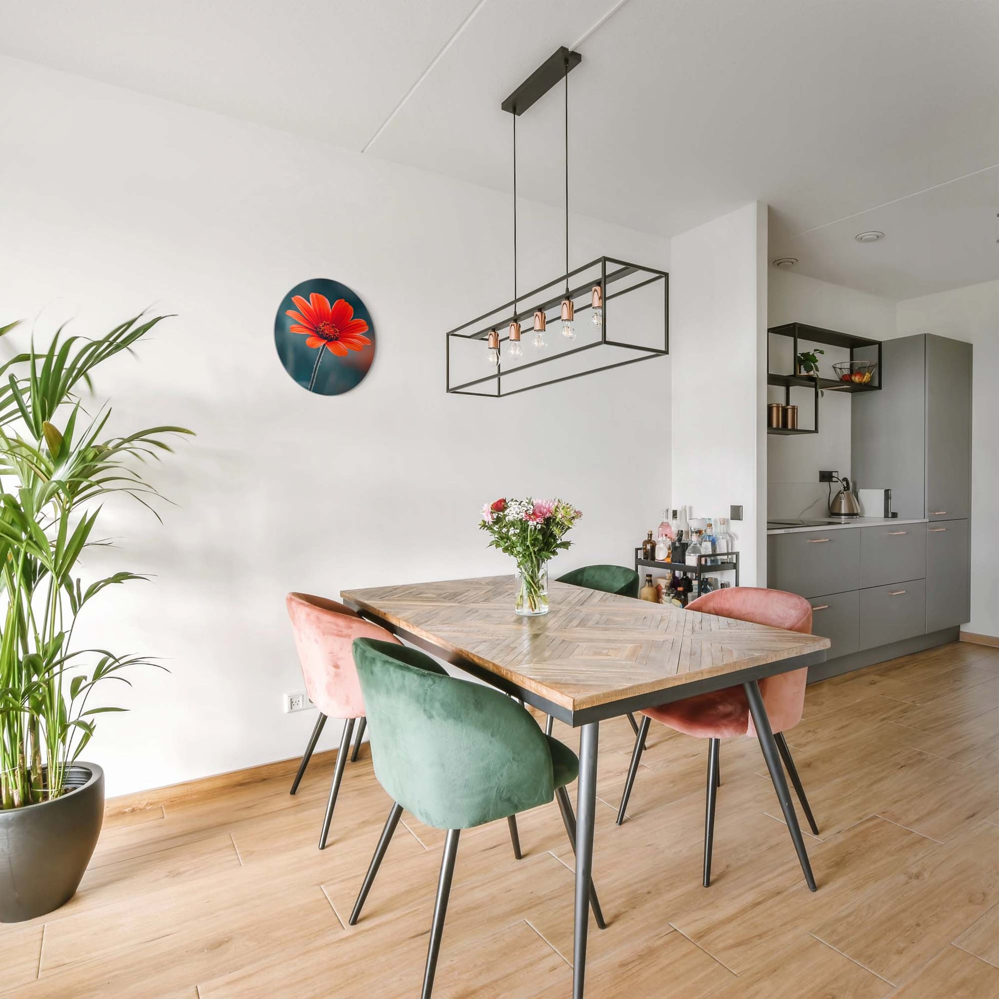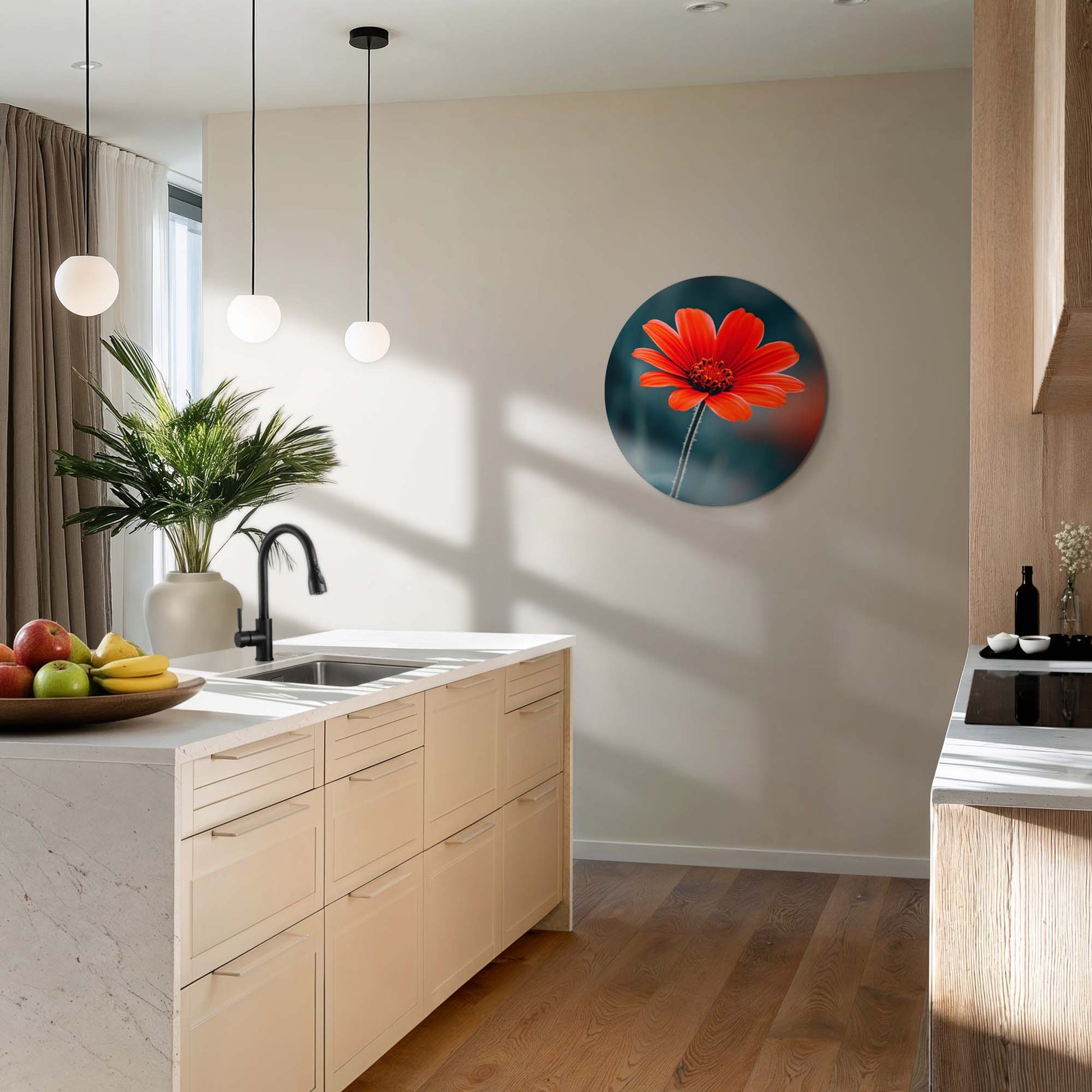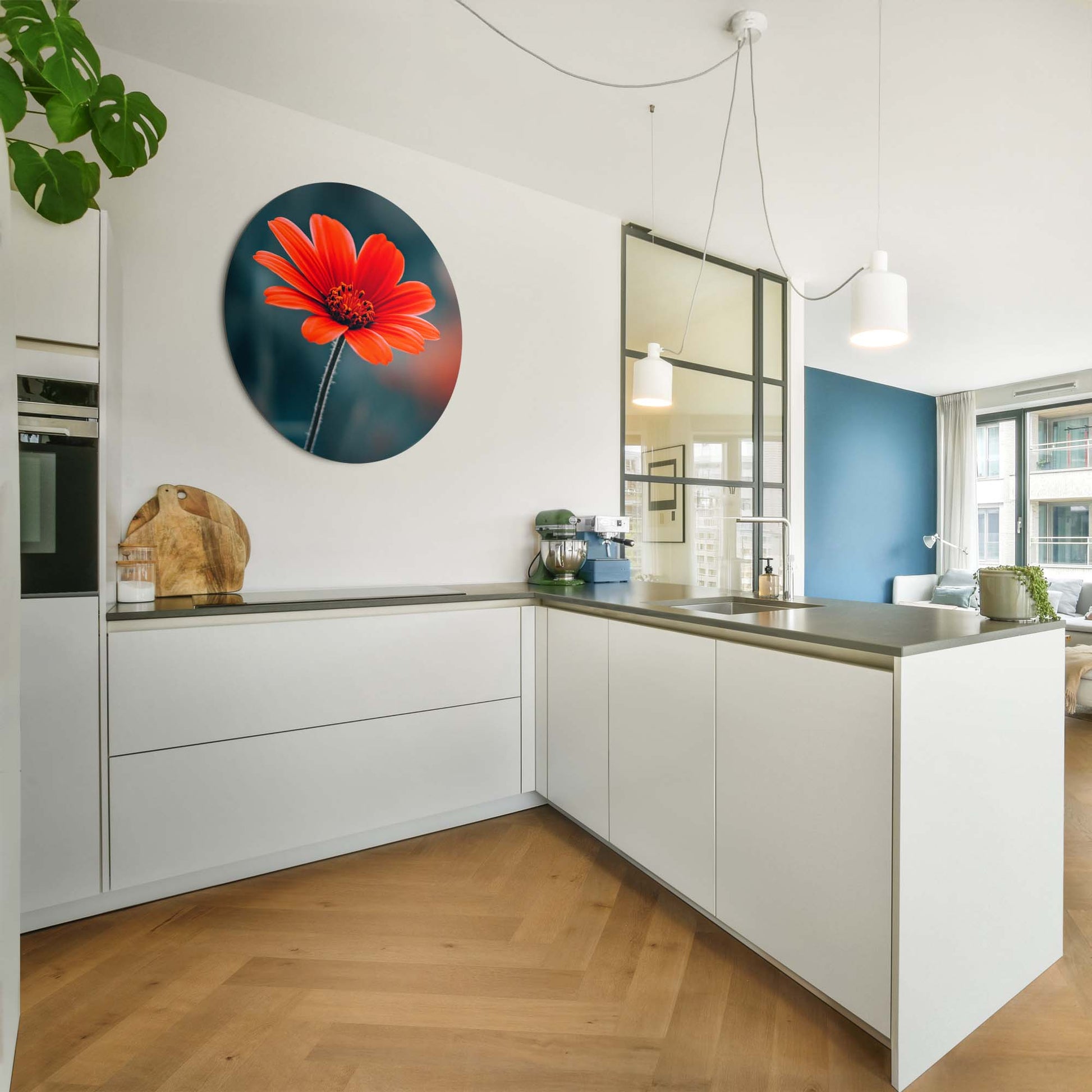 Een vurige rode bloem op een mysterieuze achtergrond. De Crimson Grace muurcirkel brengt warmte, contrast en verfijning in je interieur.