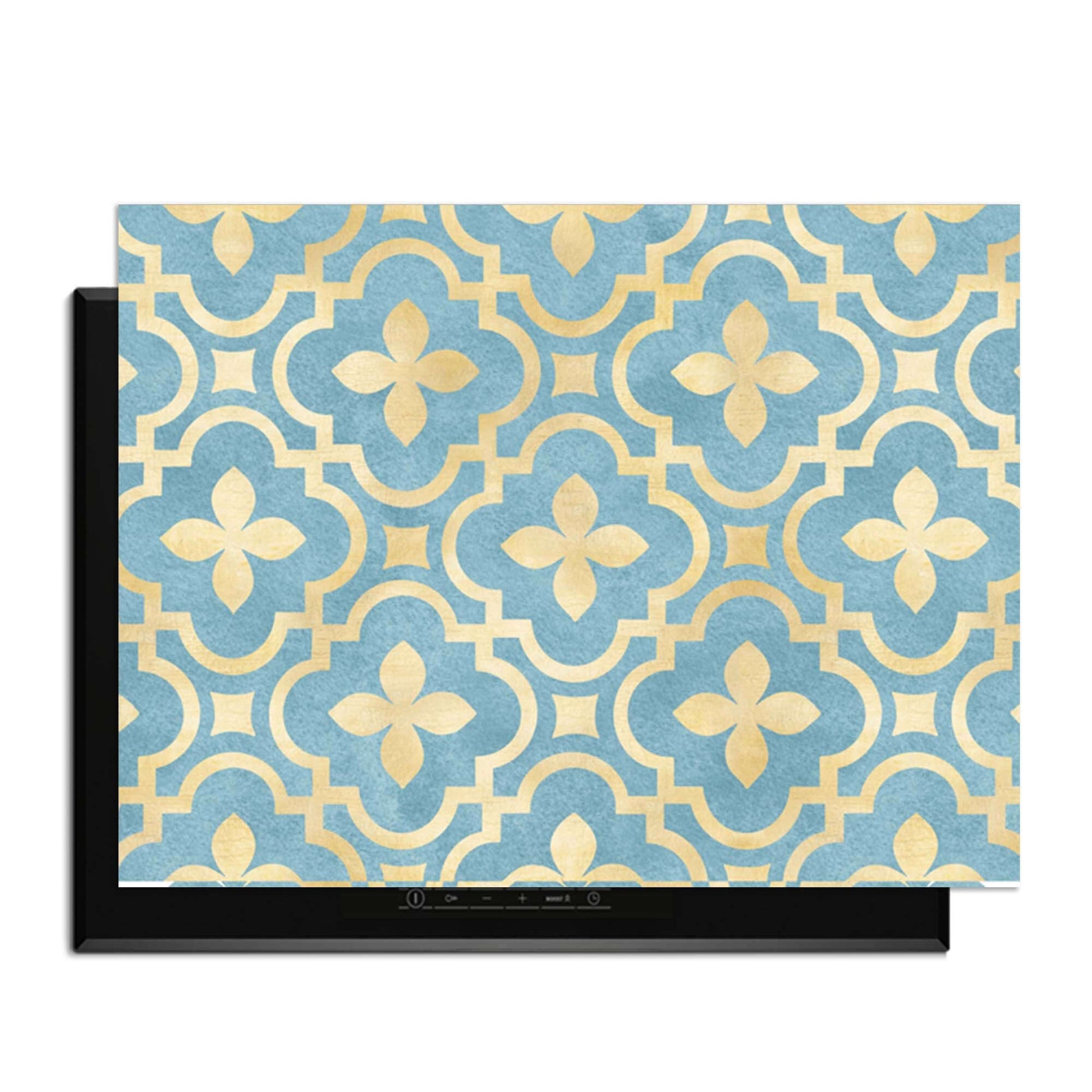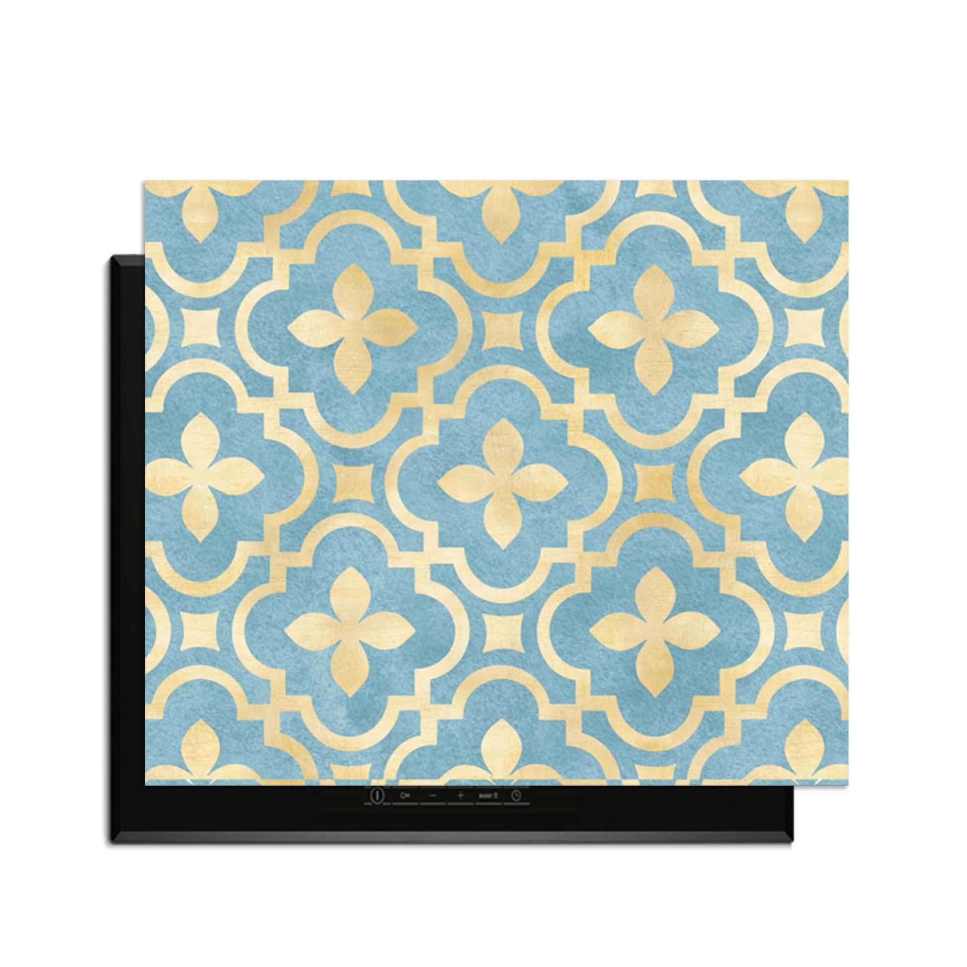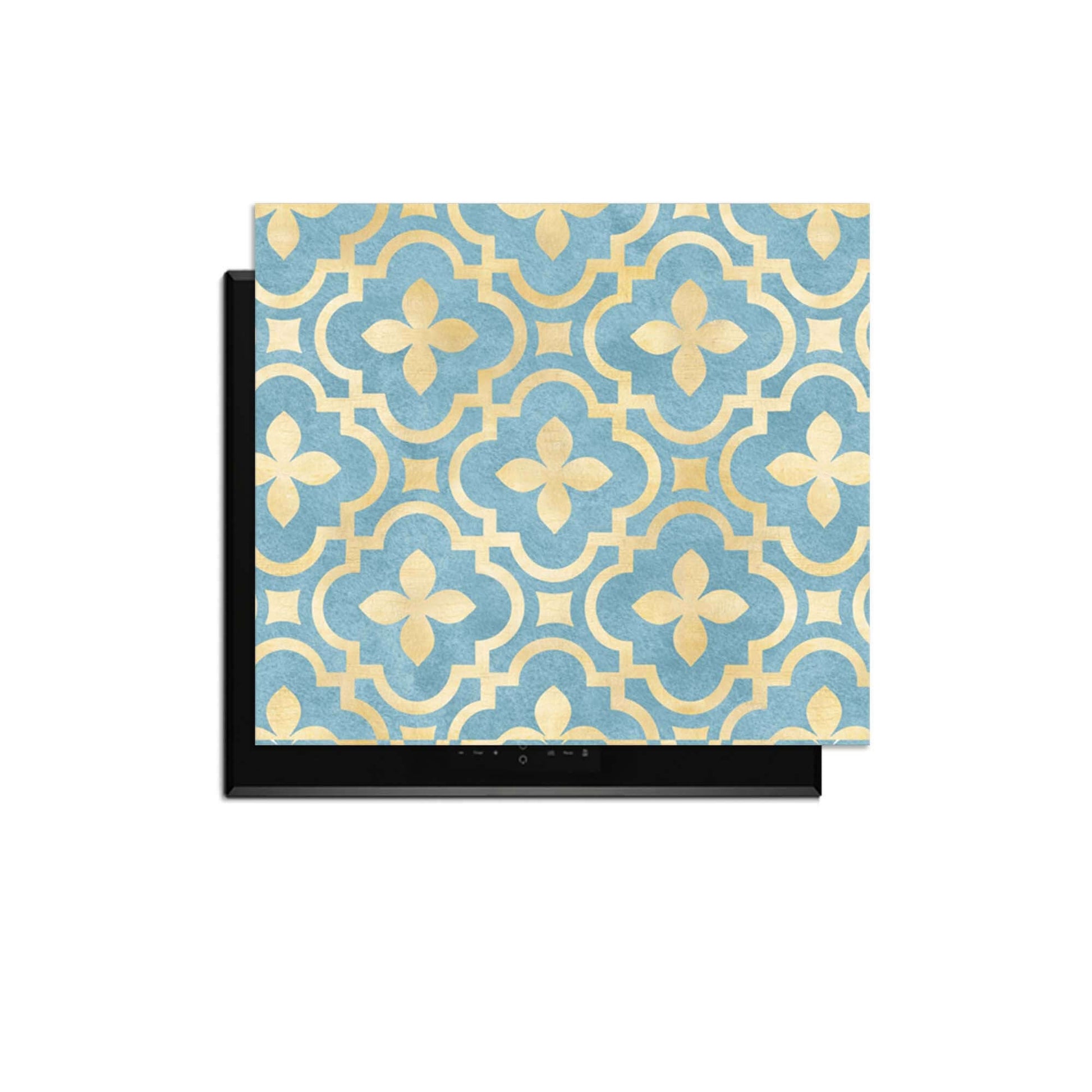 De Deep Azure Blossom inductiebeschermer combineert rijke blauwtinten met goudaccenten in een klassiek tegelmotief. Een elegante en sfeervolle toevoeging aan je keuken.