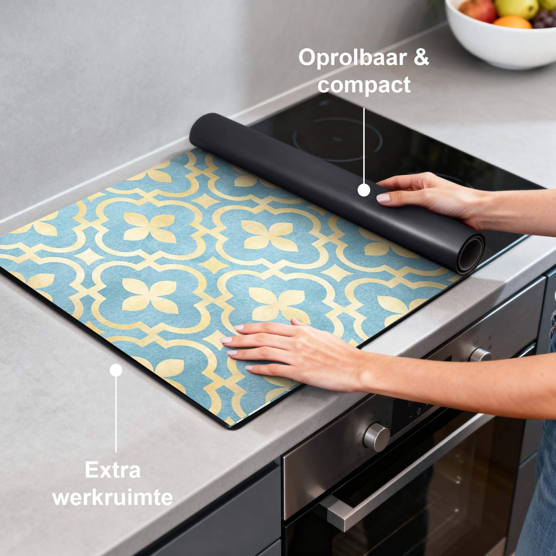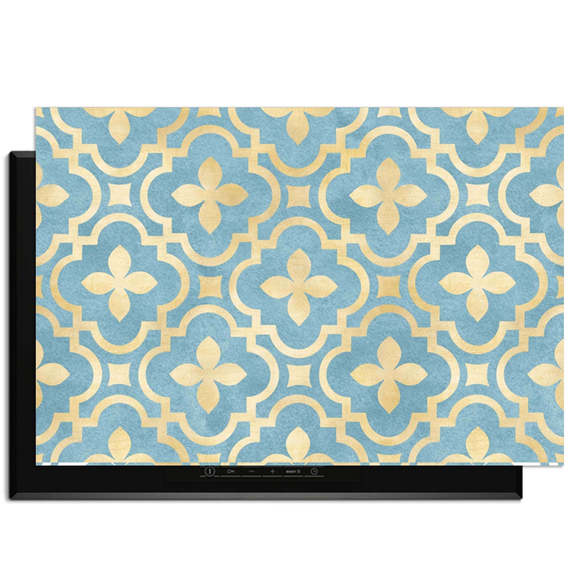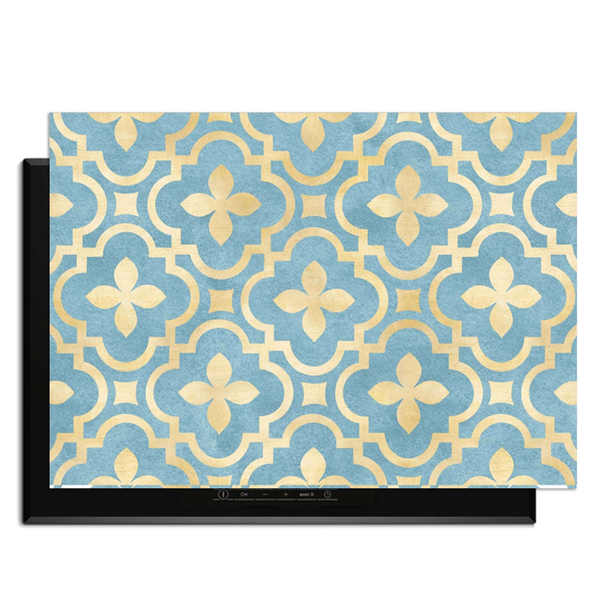 De Deep Azure Blossom inductiebeschermer combineert rijke blauwtinten met goudaccenten in een klassiek tegelmotief. Een elegante en sfeervolle toevoeging aan je keuken.