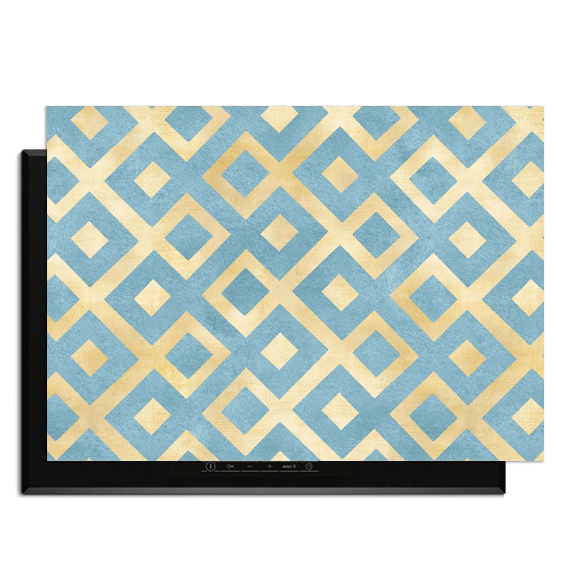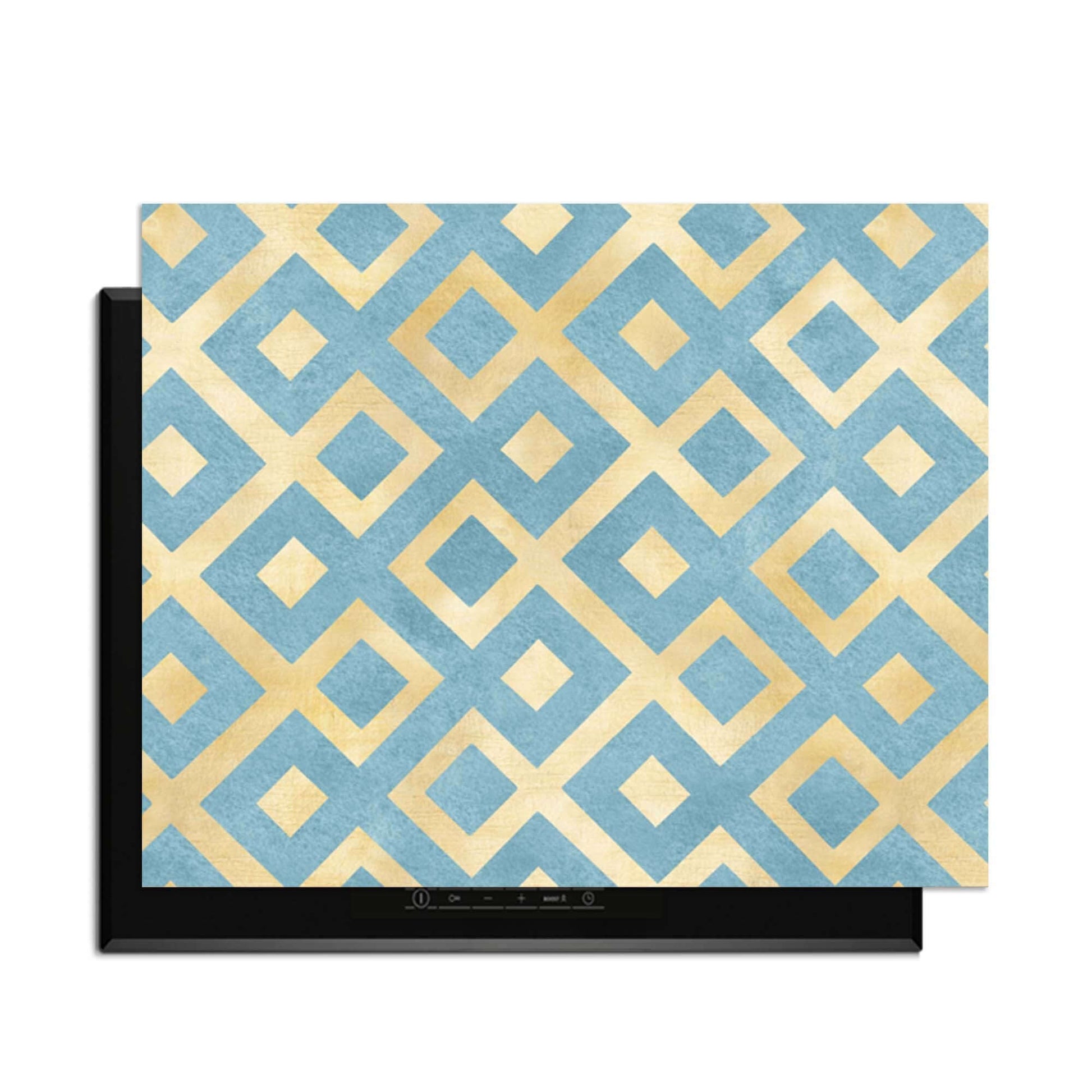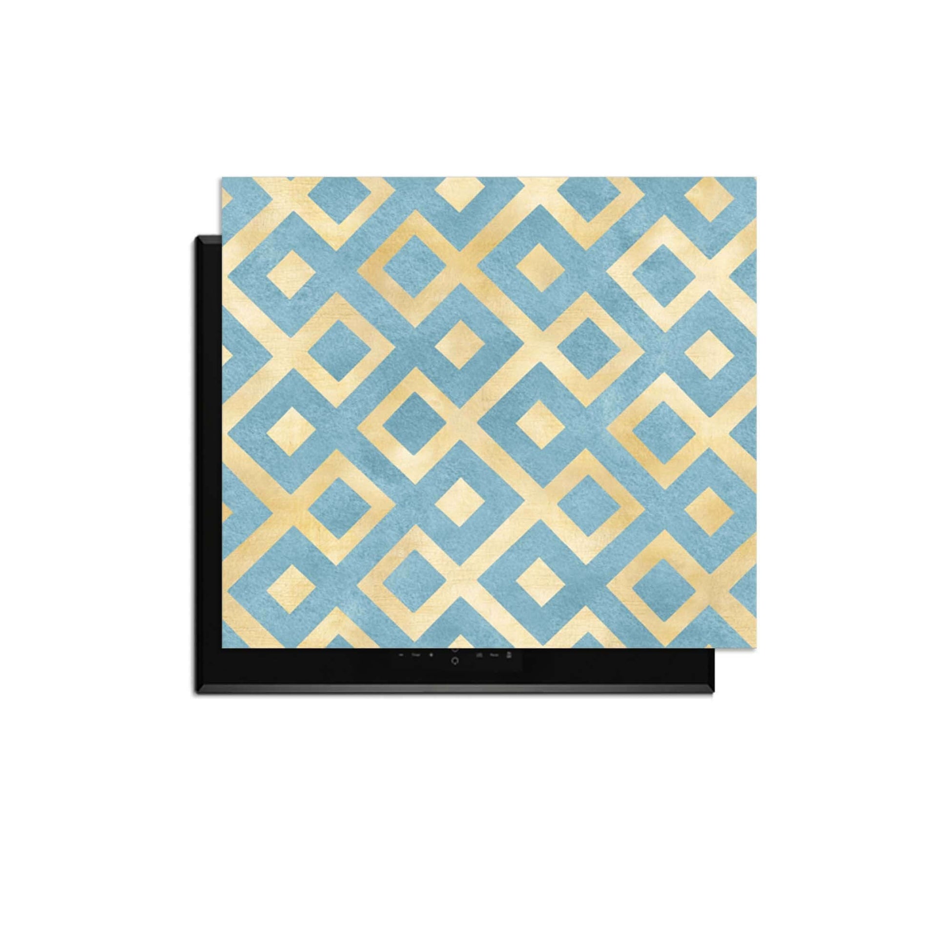 De Deep Diamond Grid inductiebeschermer heeft een opvallend geometrisch patroon in warm goud en diep azuurblauw. Een stijlvolle en moderne blikvanger voor je keuken.