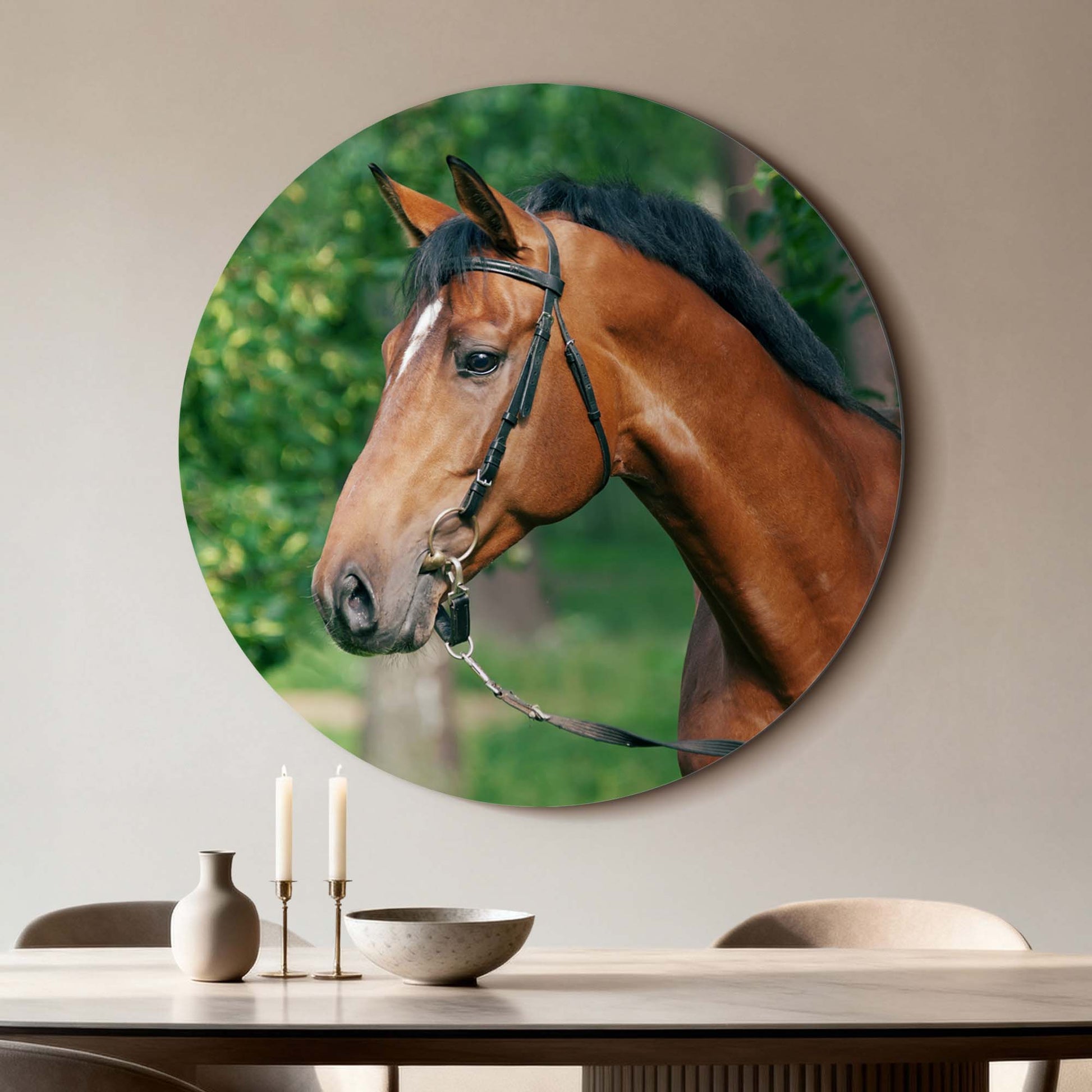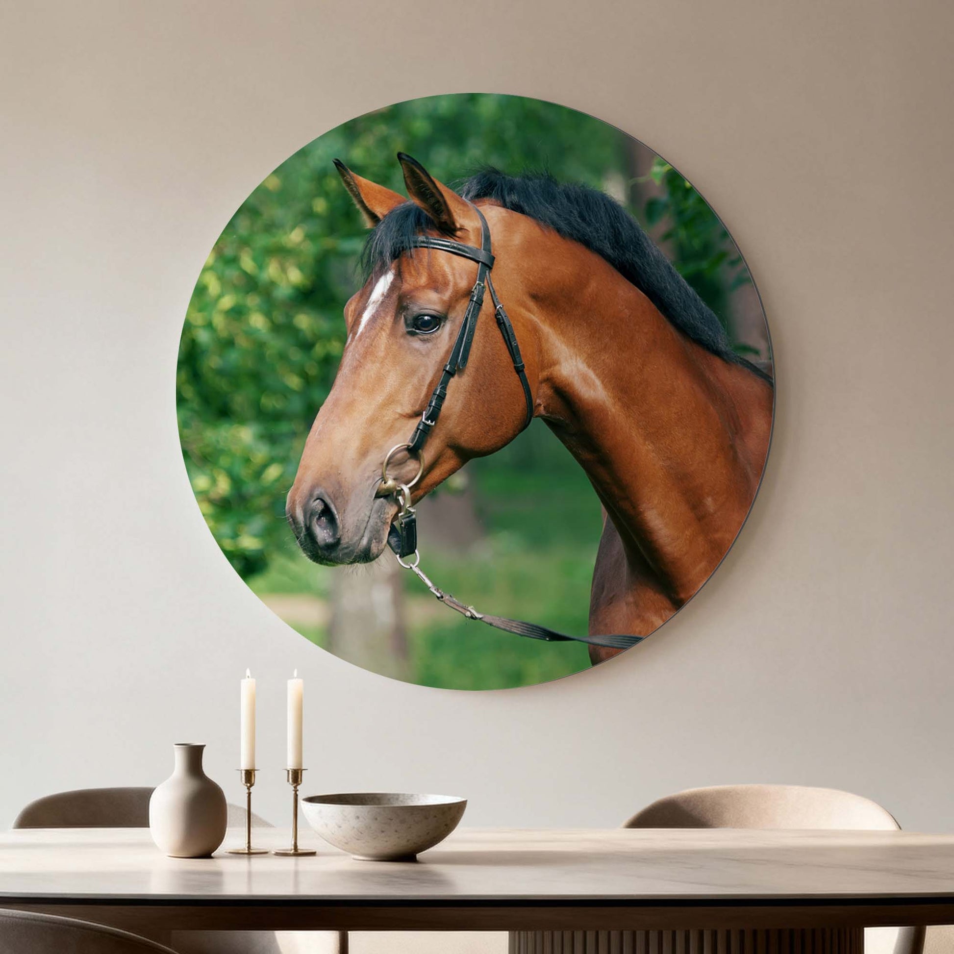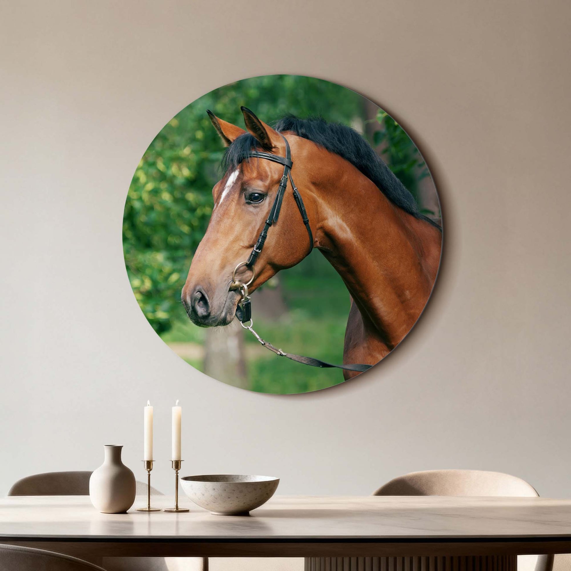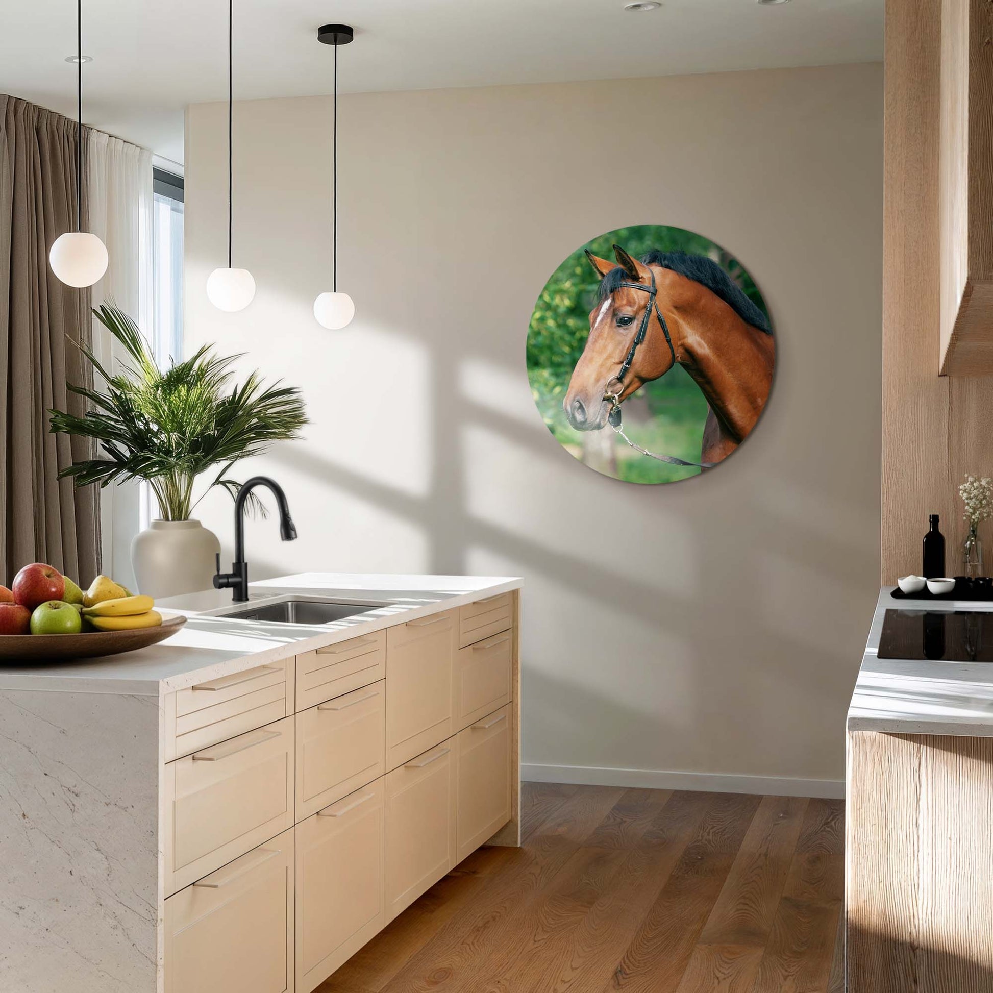 Ervaar de kalme kracht van Gentle Strength: een stijlvolle muurcirkel waarop een edel paard wordt vastgelegd in zacht, natuurlijk licht. Een ode aan rust, schoonheid en evenwicht. Perfect voor keuken, eetkamer of woonkamer.