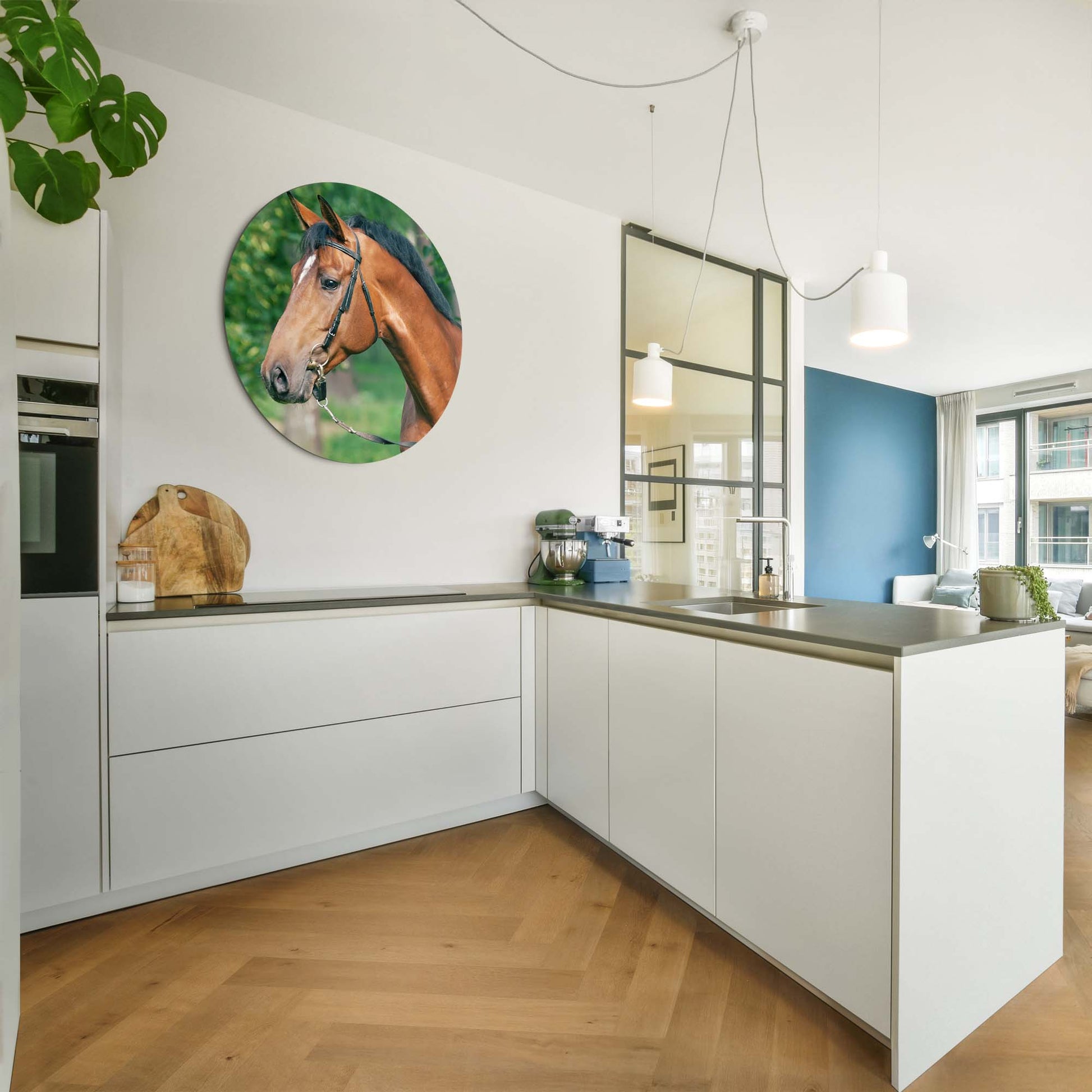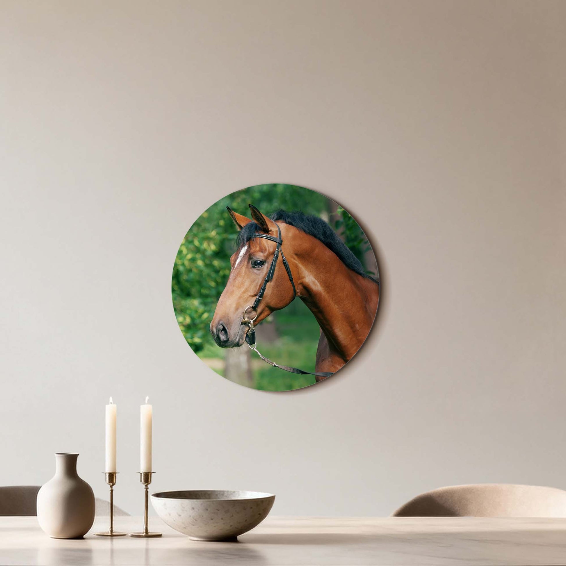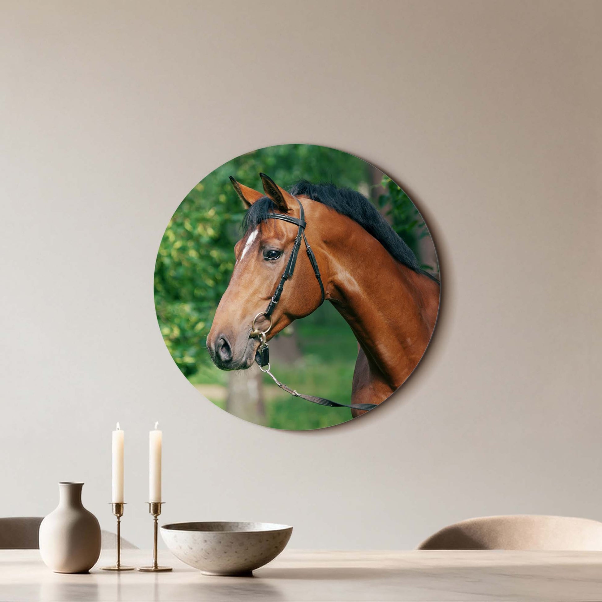 Ervaar de kalme kracht van Gentle Strength: een stijlvolle muurcirkel waarop een edel paard wordt vastgelegd in zacht, natuurlijk licht. Een ode aan rust, schoonheid en evenwicht. Perfect voor keuken, eetkamer of woonkamer.