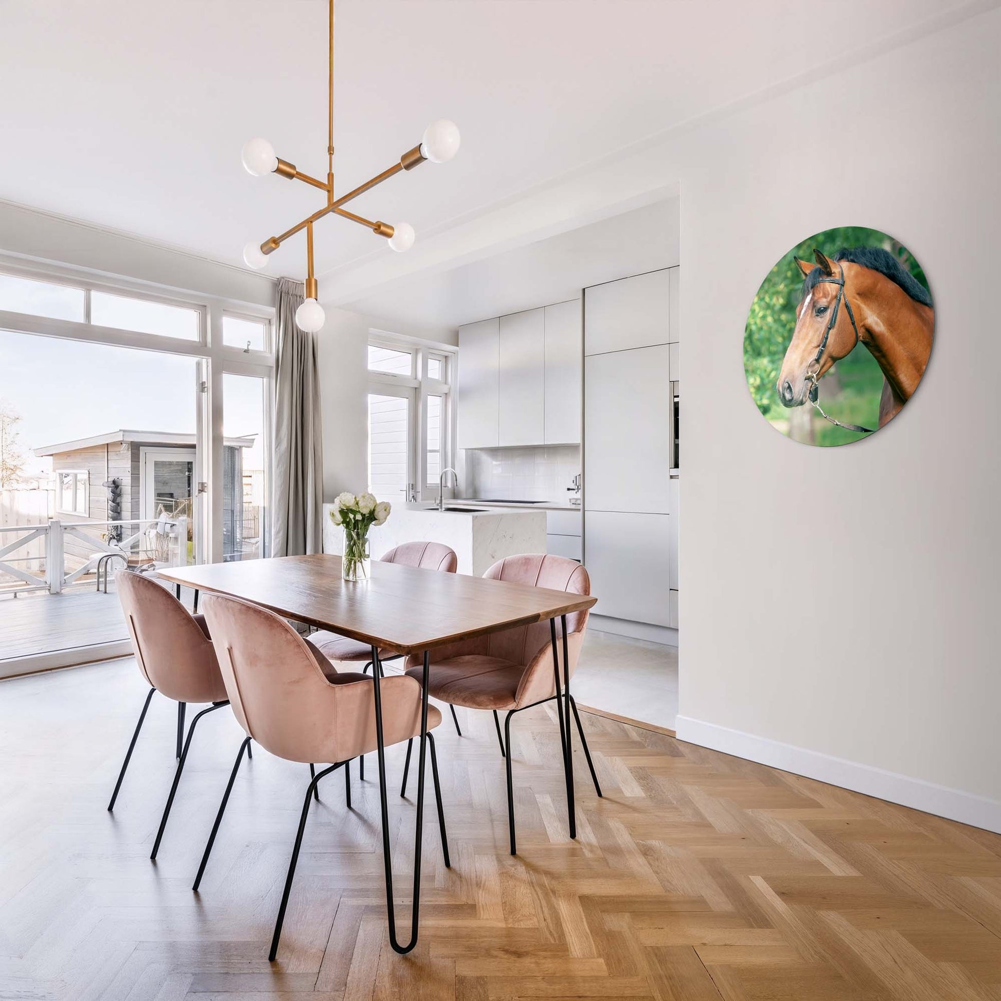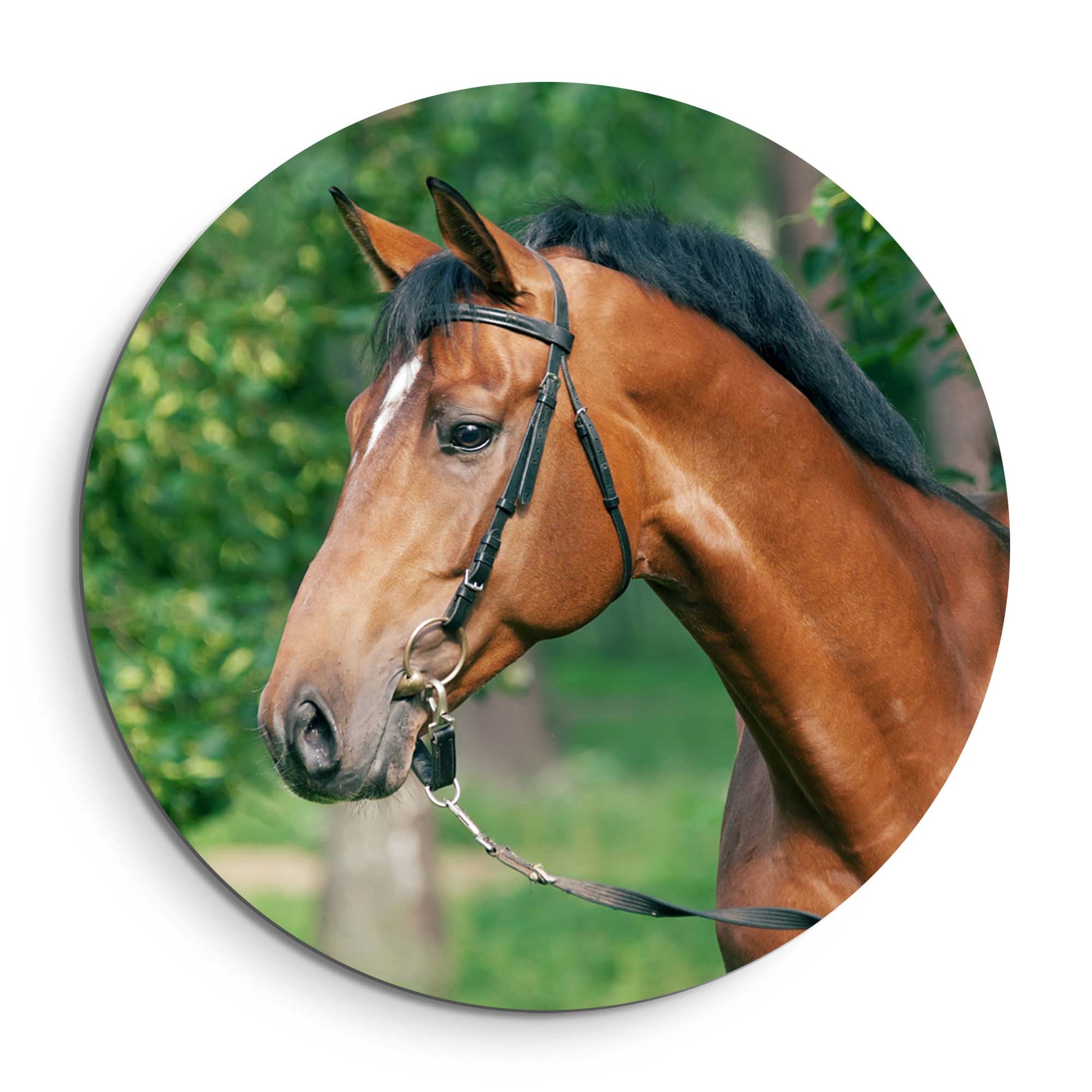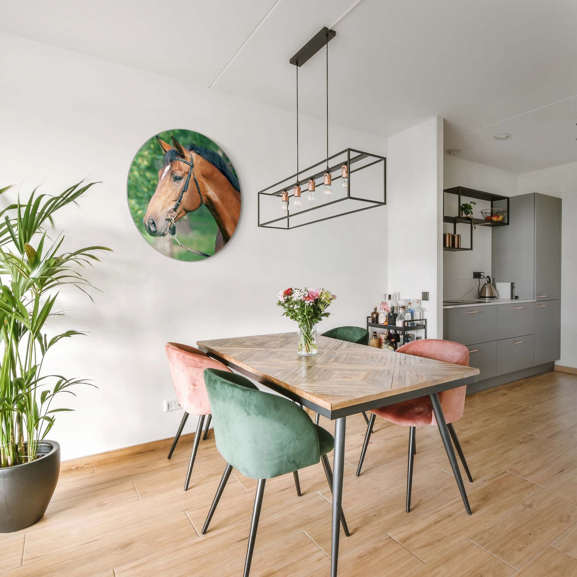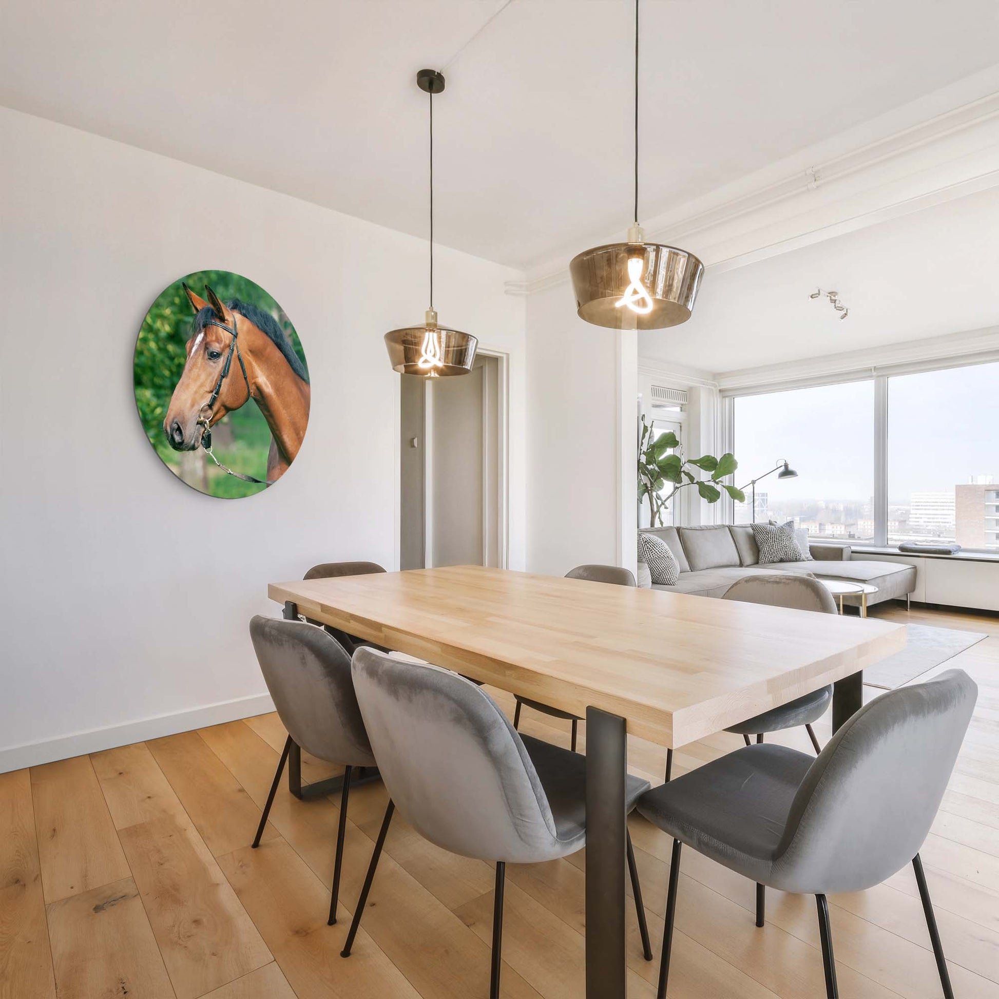 Ervaar de kalme kracht van Gentle Strength: een stijlvolle muurcirkel waarop een edel paard wordt vastgelegd in zacht, natuurlijk licht. Een ode aan rust, schoonheid en evenwicht. Perfect voor keuken, eetkamer of woonkamer.