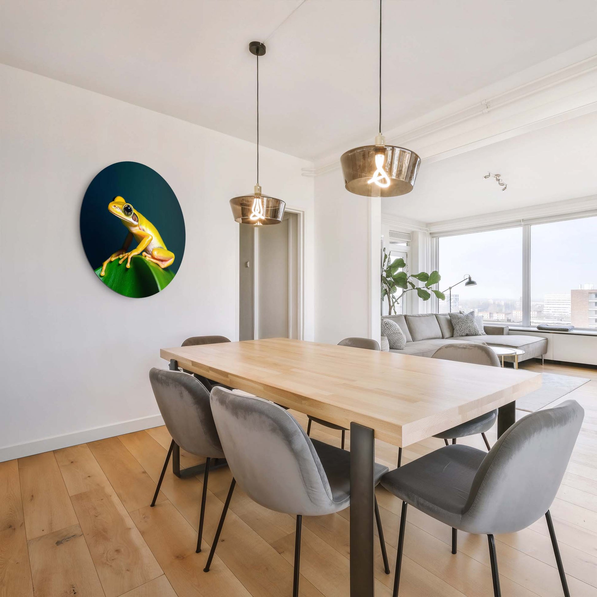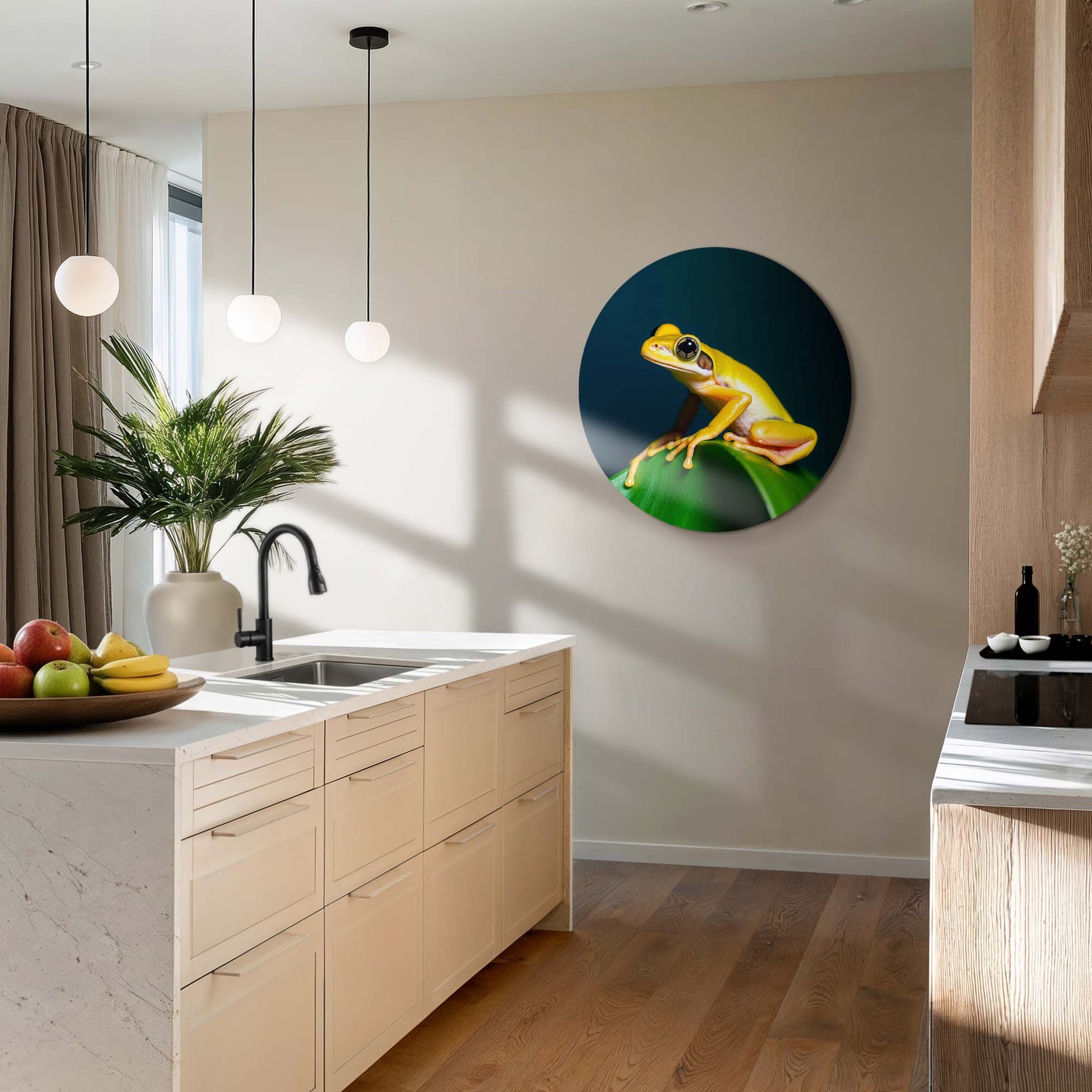 Golden Glow brengt een vleugje tropische energie in huis. De felgele kikker op een glanzend groen blad straalt warmte, speelsheid en elegantie uit — perfect voor wie durft te kiezen voor kleur.