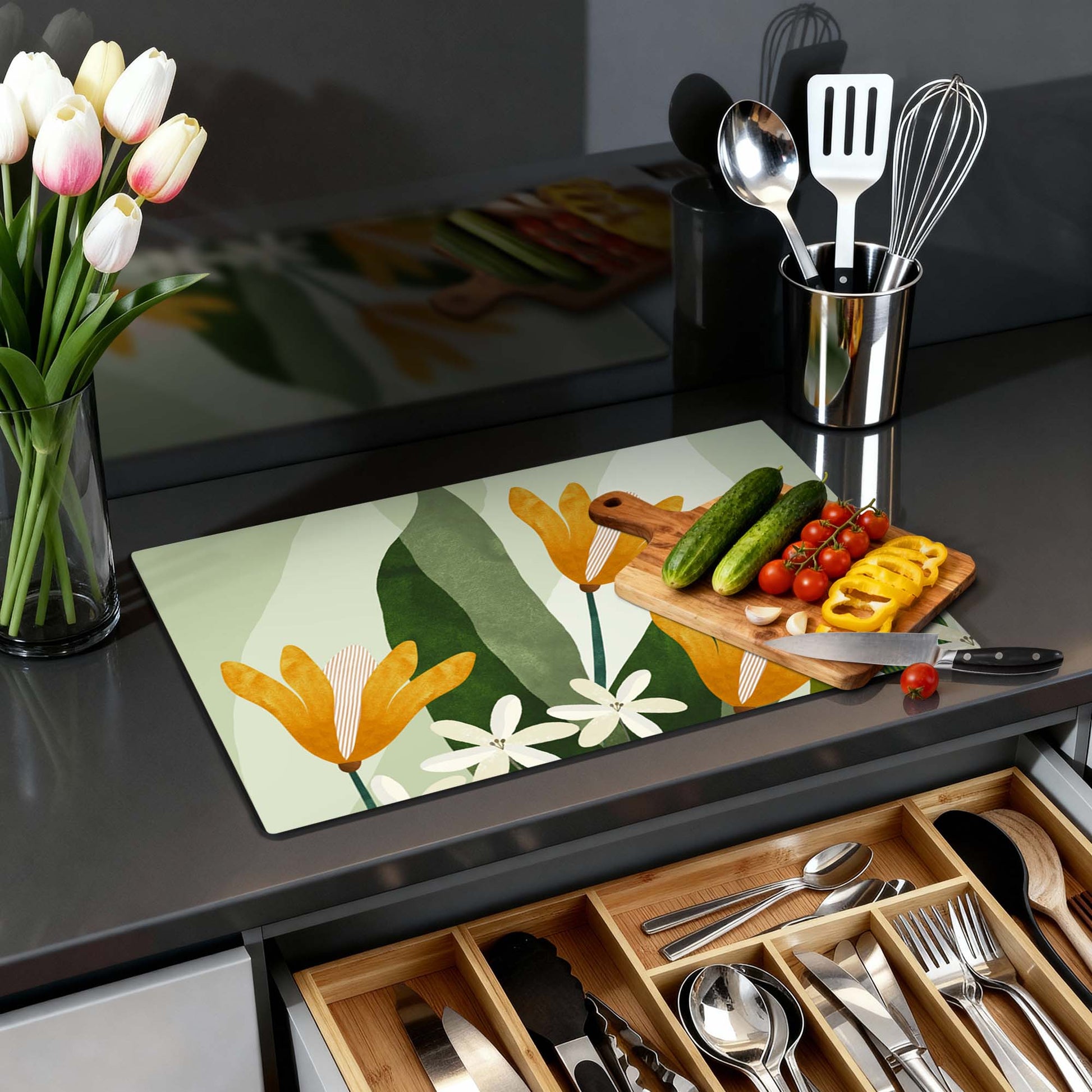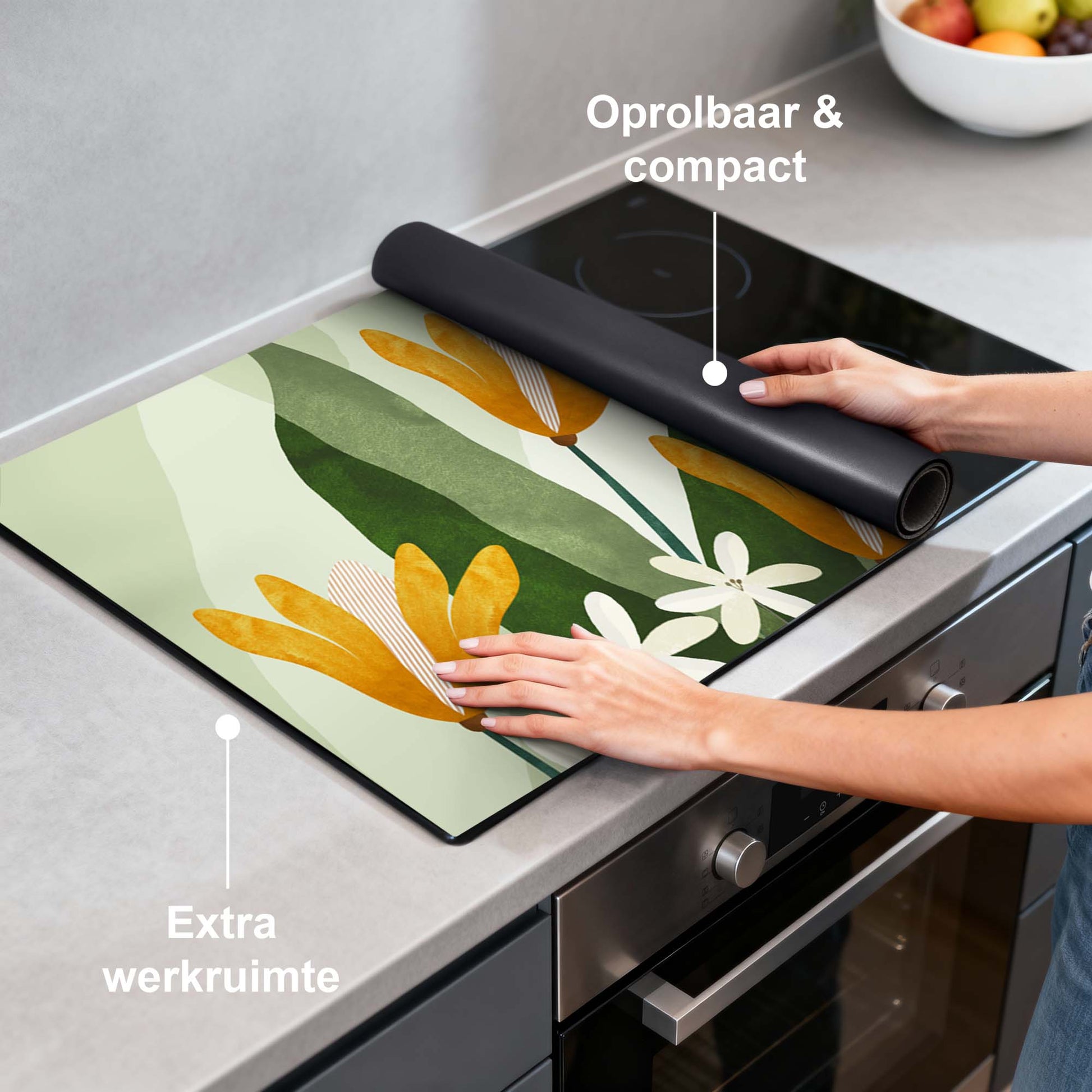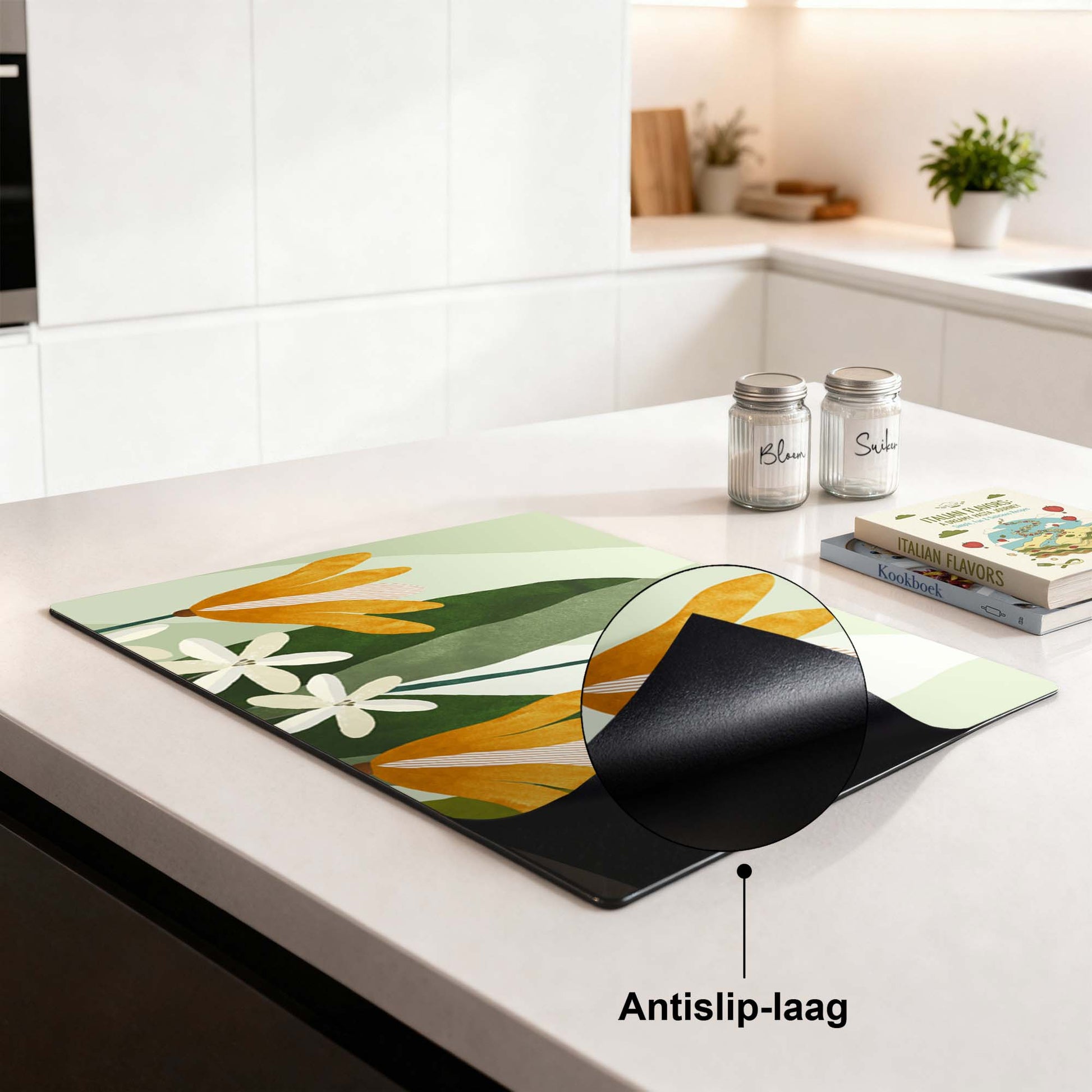 Golden Petals brengt warmte en elegantie in je keuken. Diepgroene bladeren en goudgele bloemen geven je inductieplaat een stijlvolle, natuurlijke uitstraling.