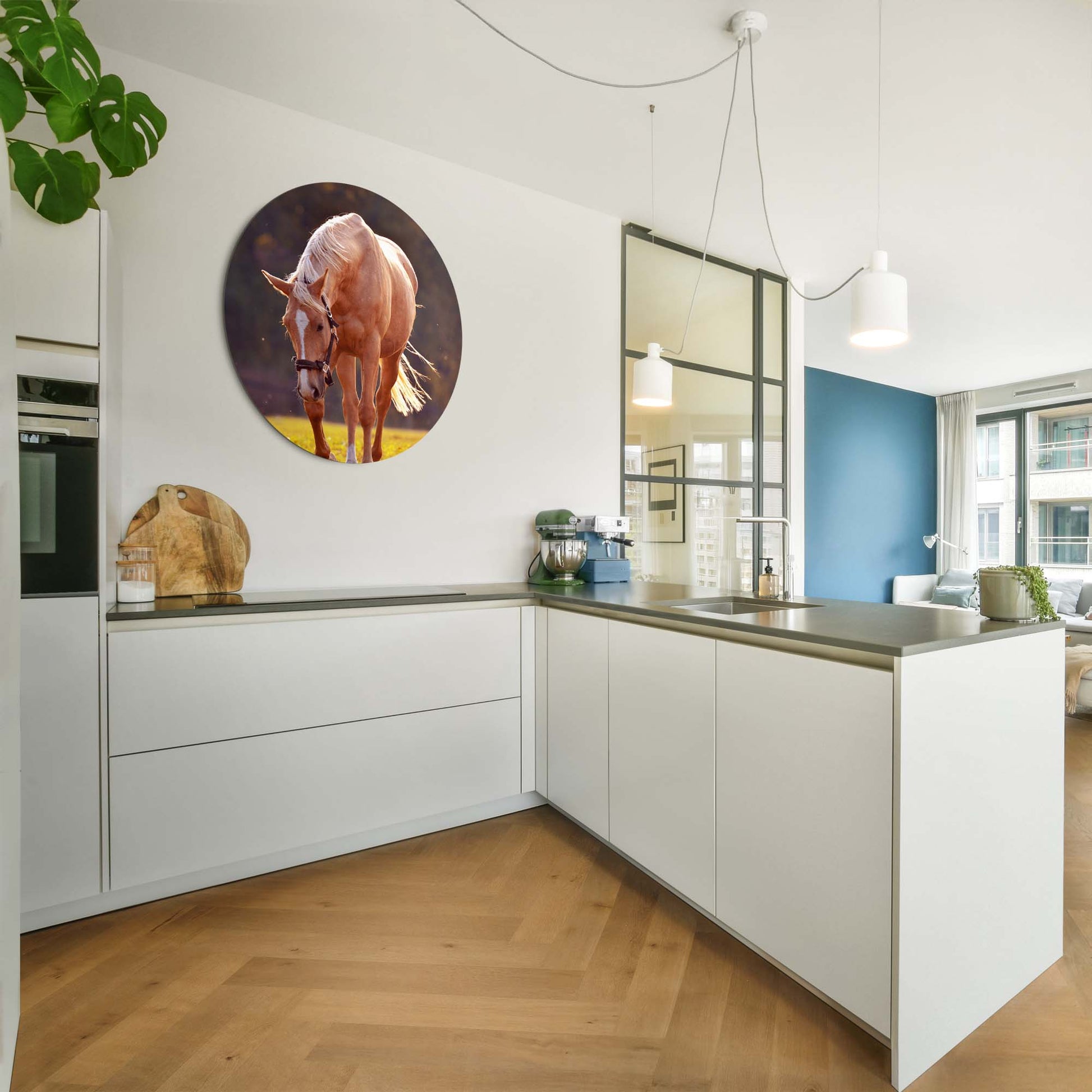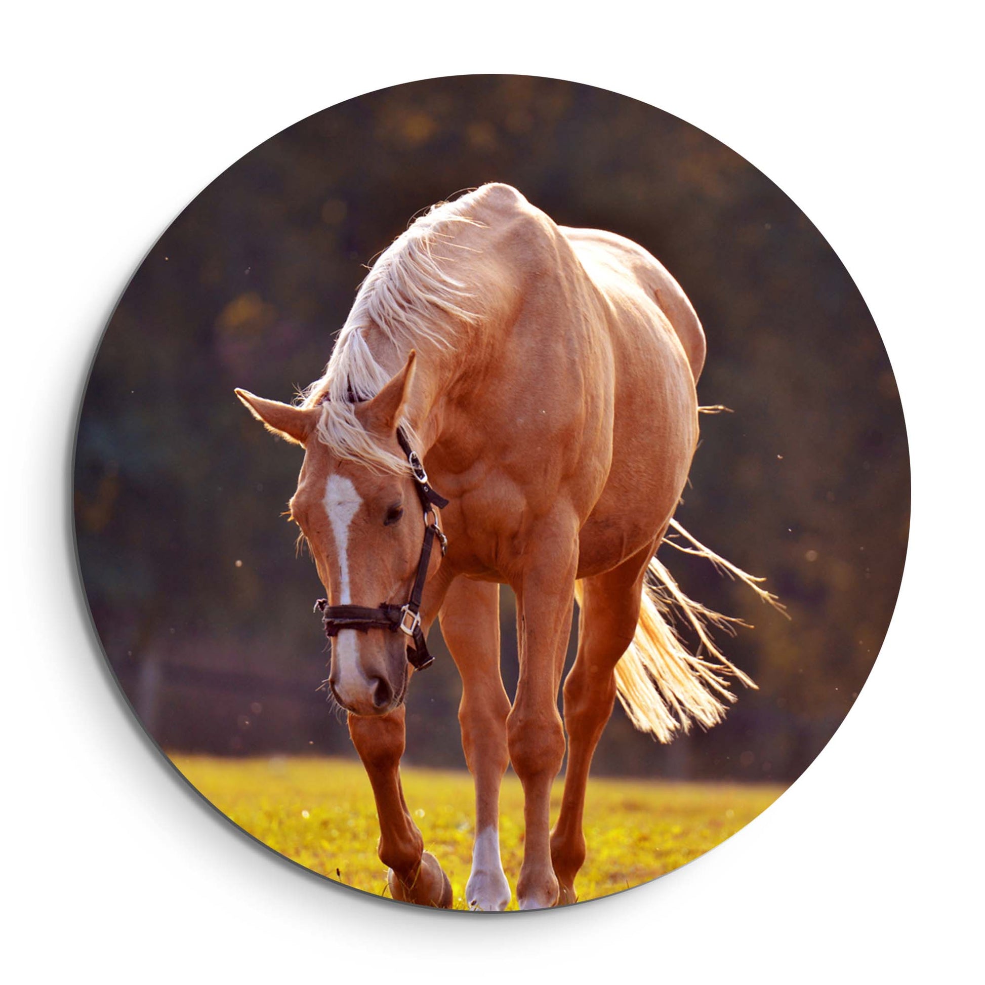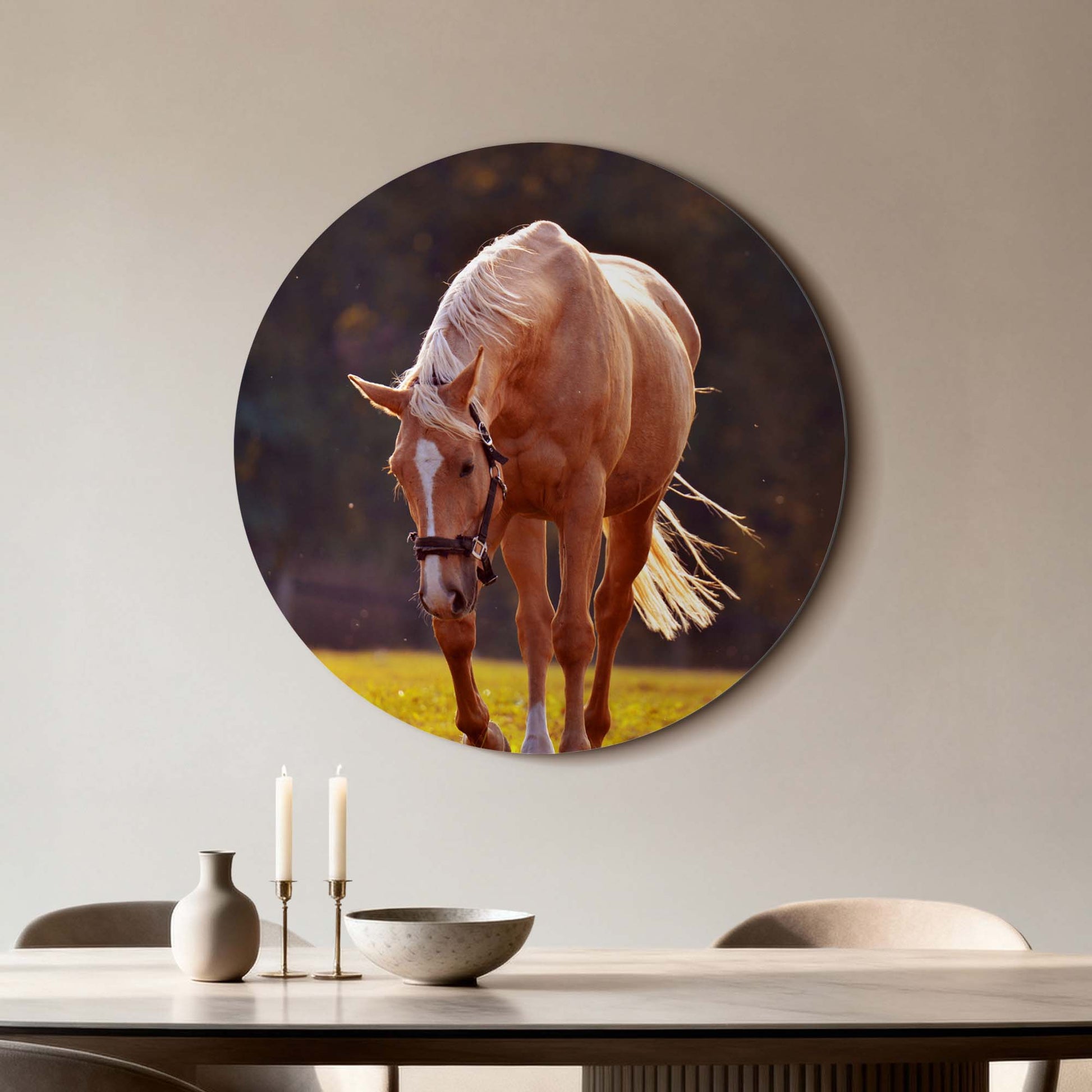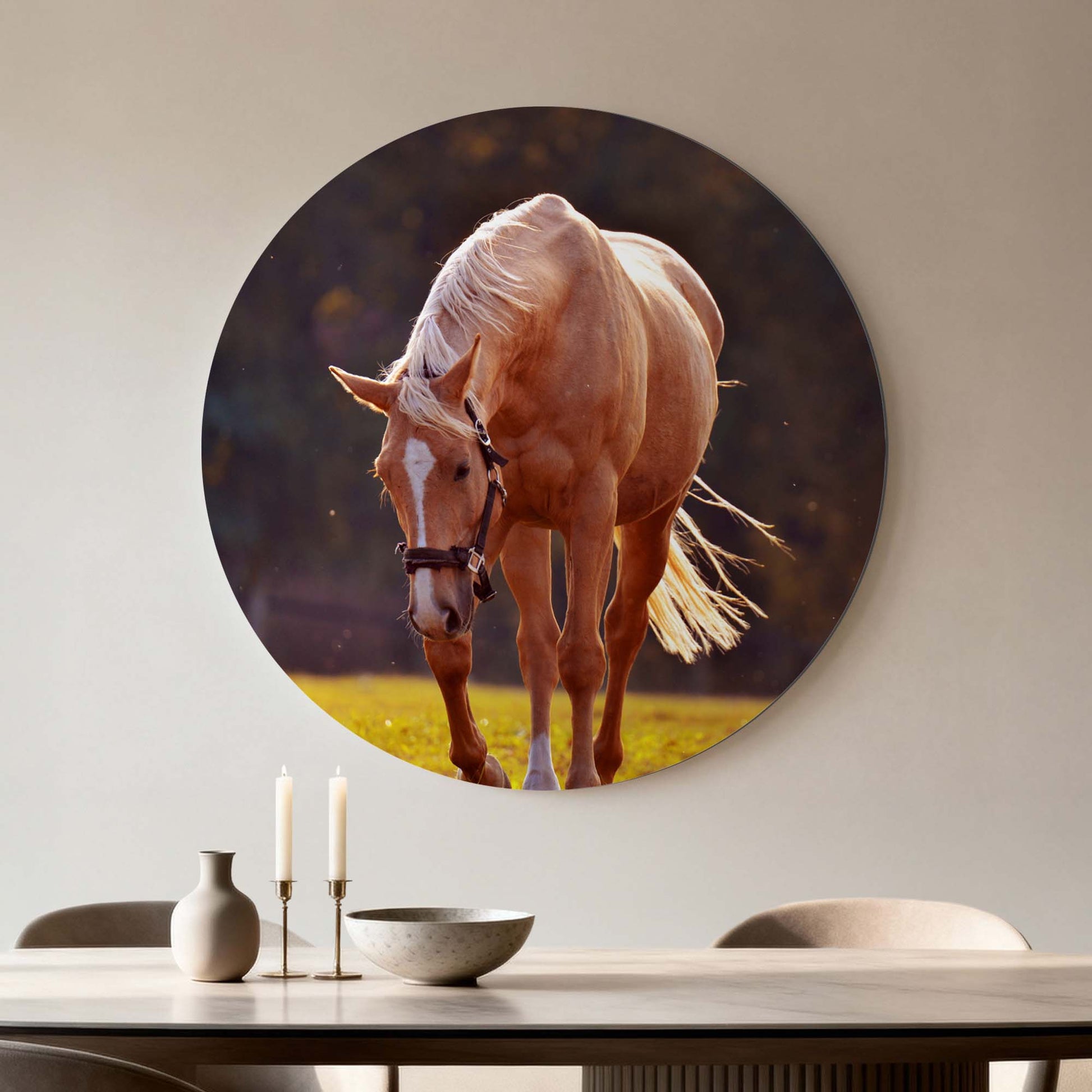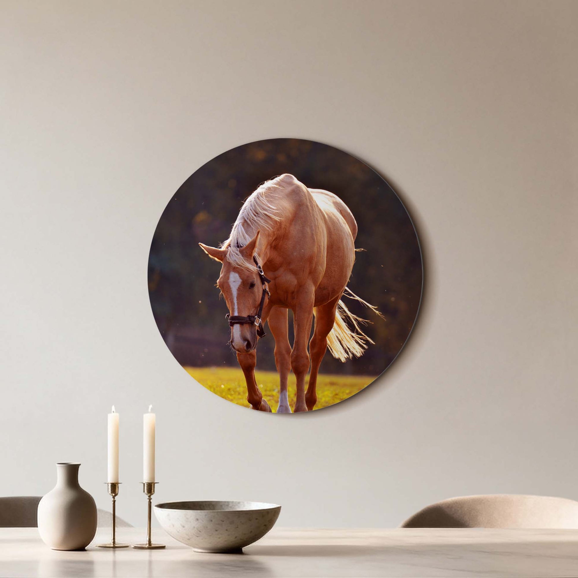 Ervaar de rust van de ondergaande zon met Golden Serenity: een elegante muurcirkel waarop een goudkleurig paard baadt in warm avondlicht. Een tijdloos kunstwerk dat sereniteit en kracht samenbrengt.