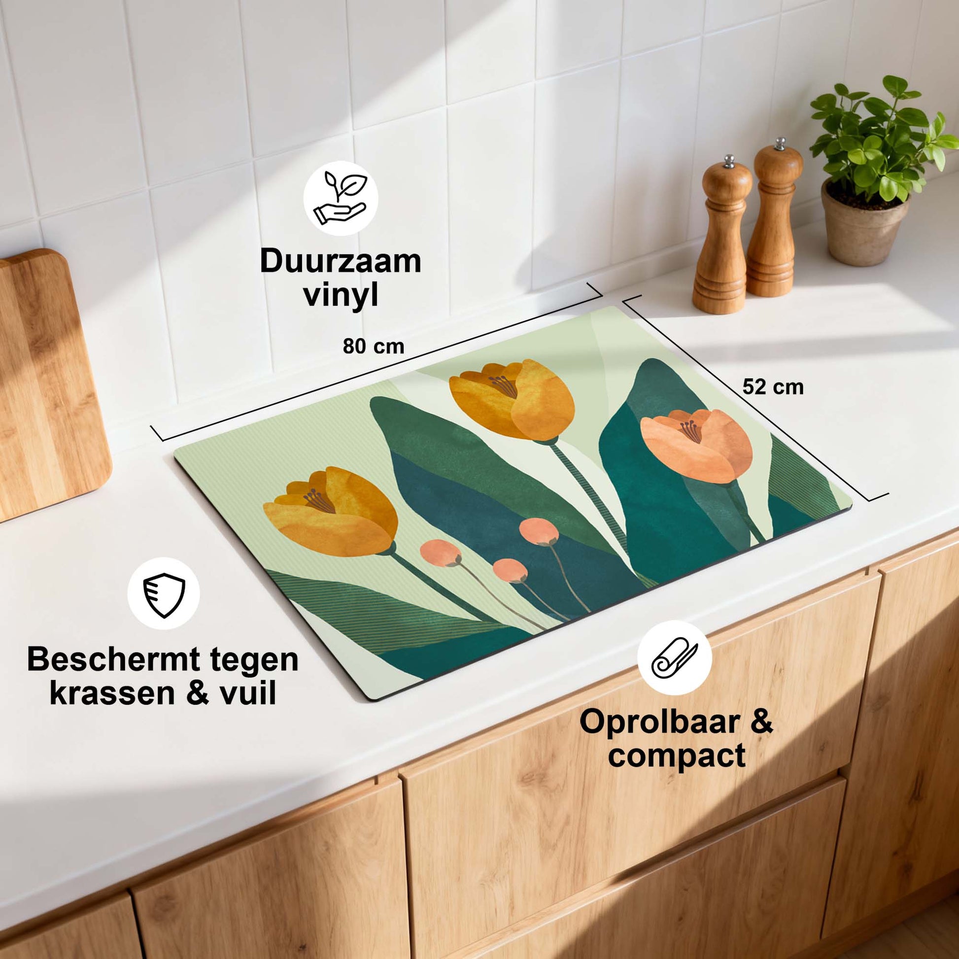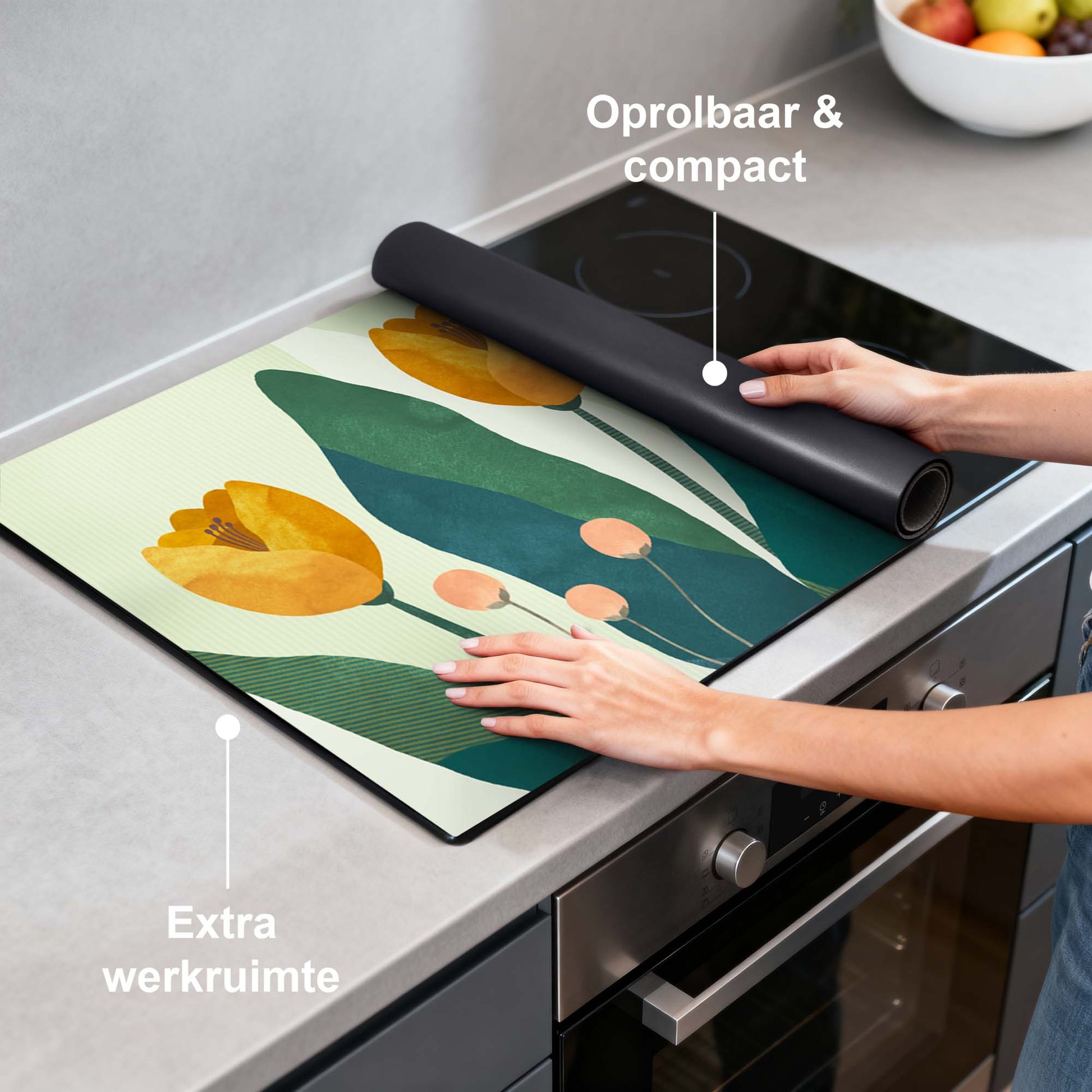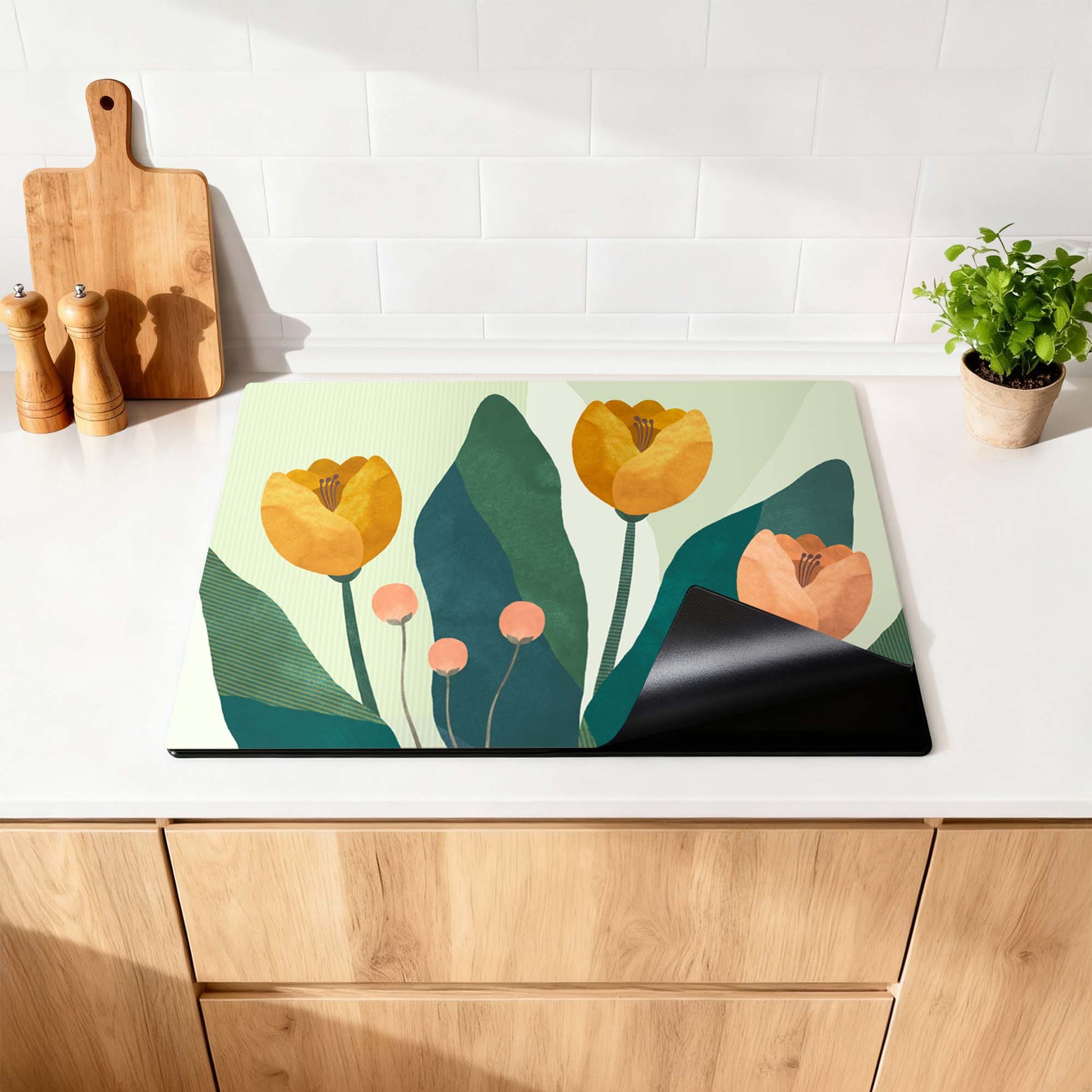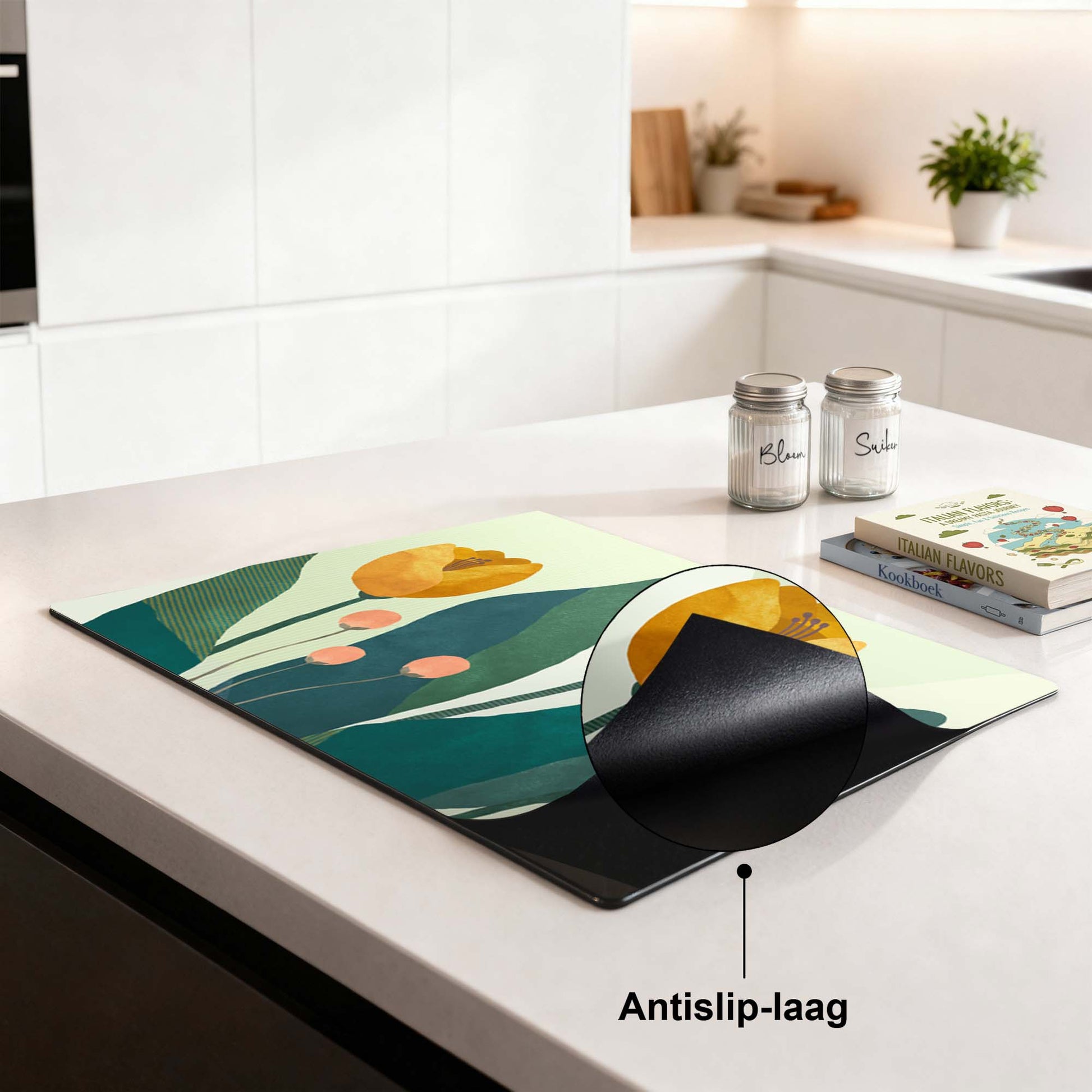 Golden Trio brengt warmte en rust in je keuken. Goudgele bloemen en diepe groentinten vormen een elegant botanisch design dat je inductieplaat stijlvol beschermt.