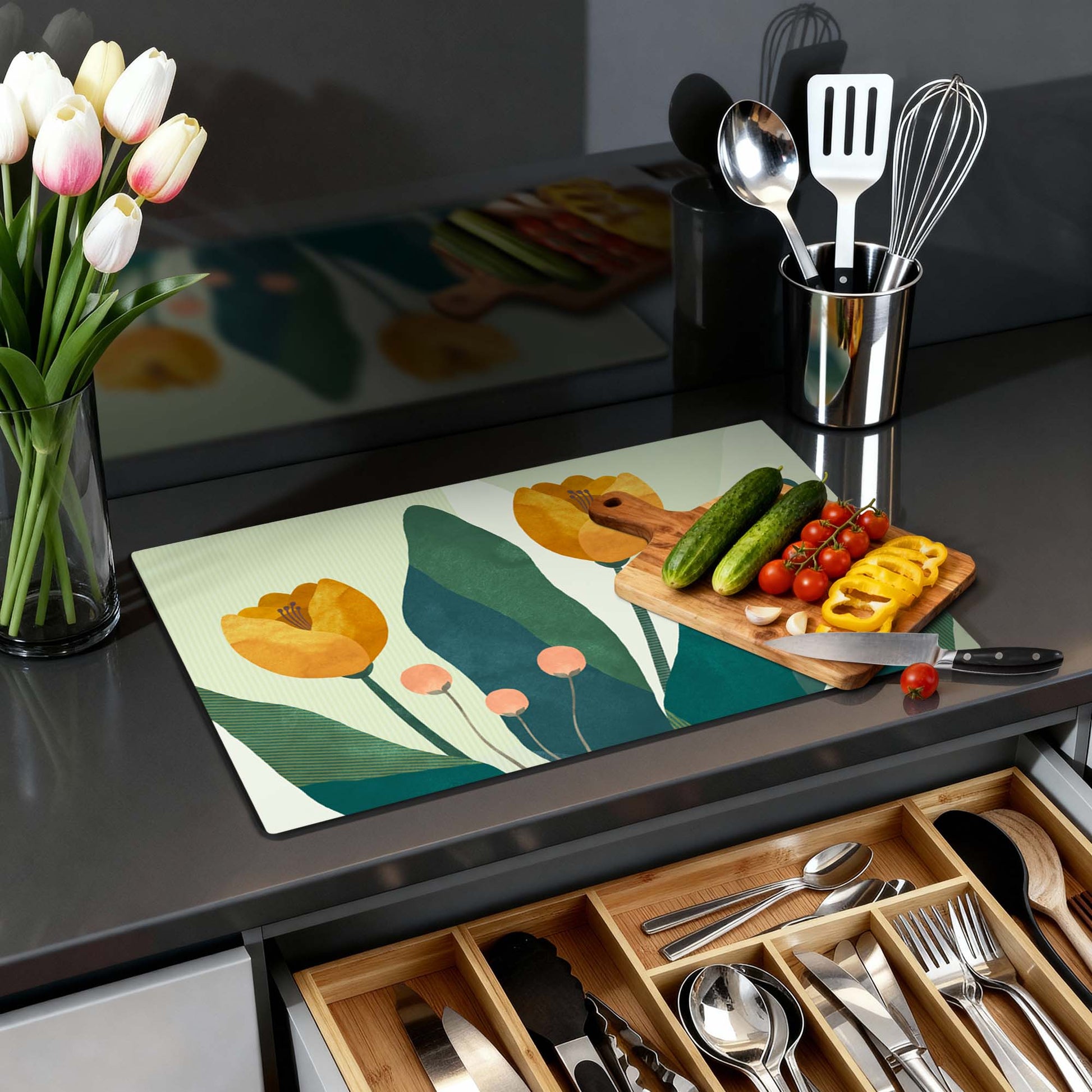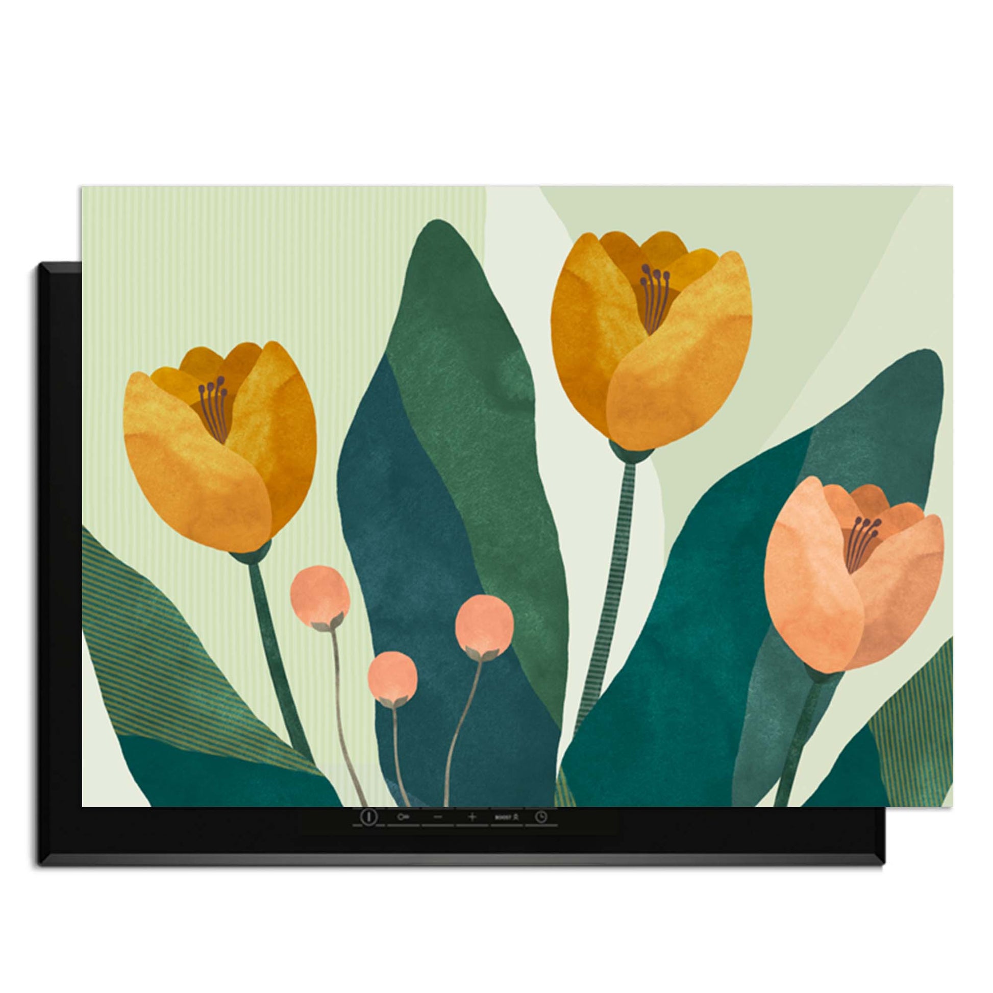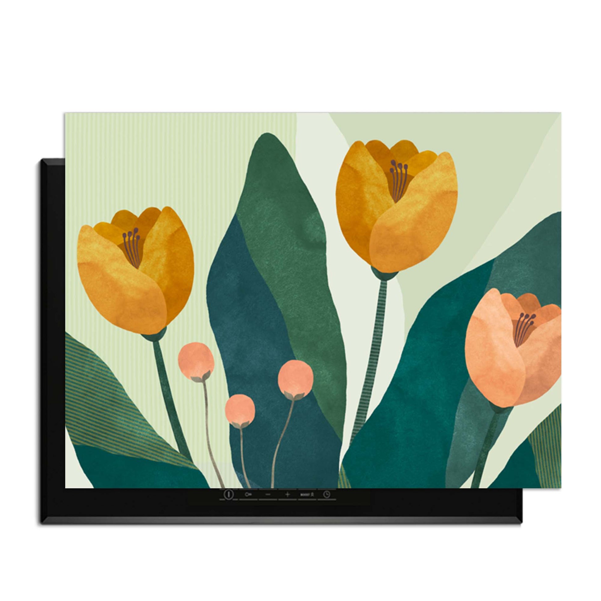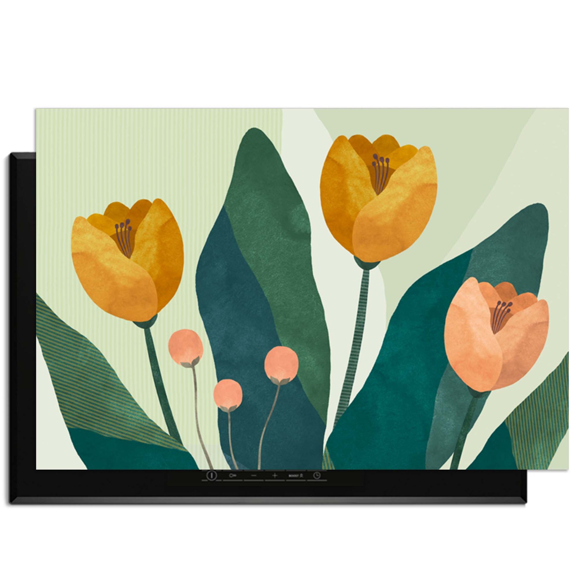 Golden Trio brengt warmte en rust in je keuken. Goudgele bloemen en diepe groentinten vormen een elegant botanisch design dat je inductieplaat stijlvol beschermt.