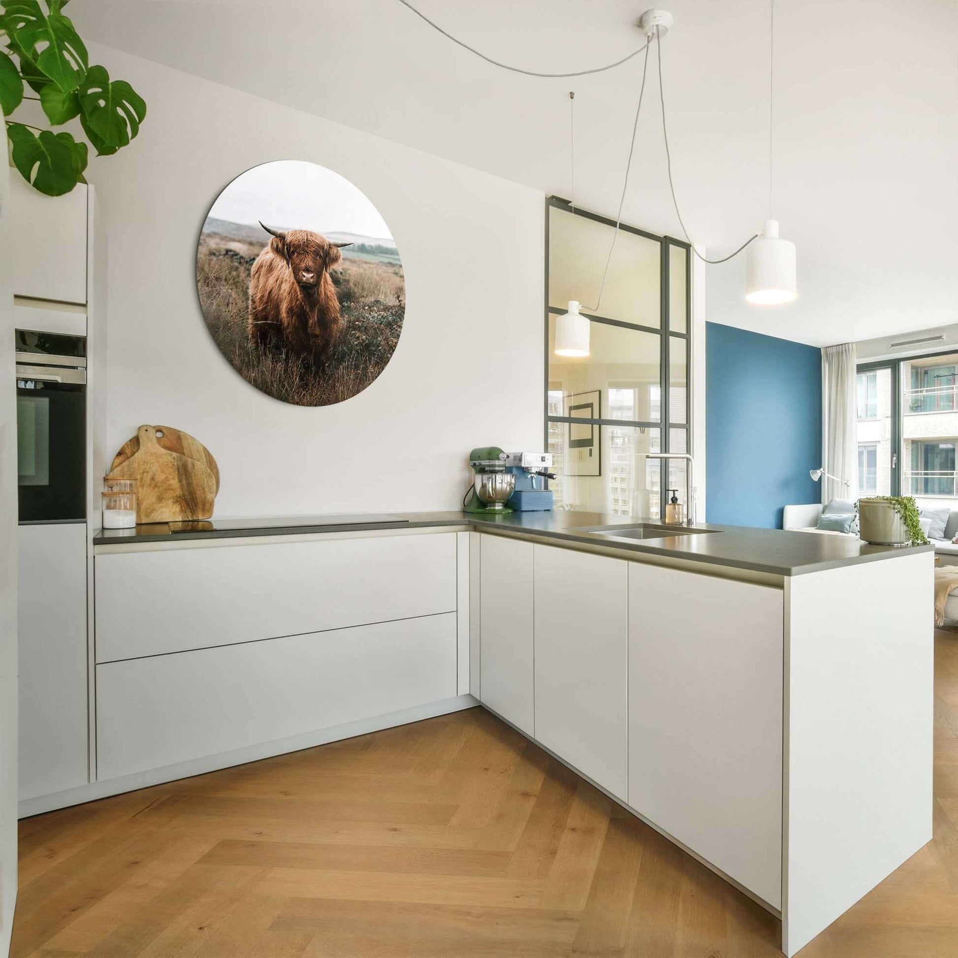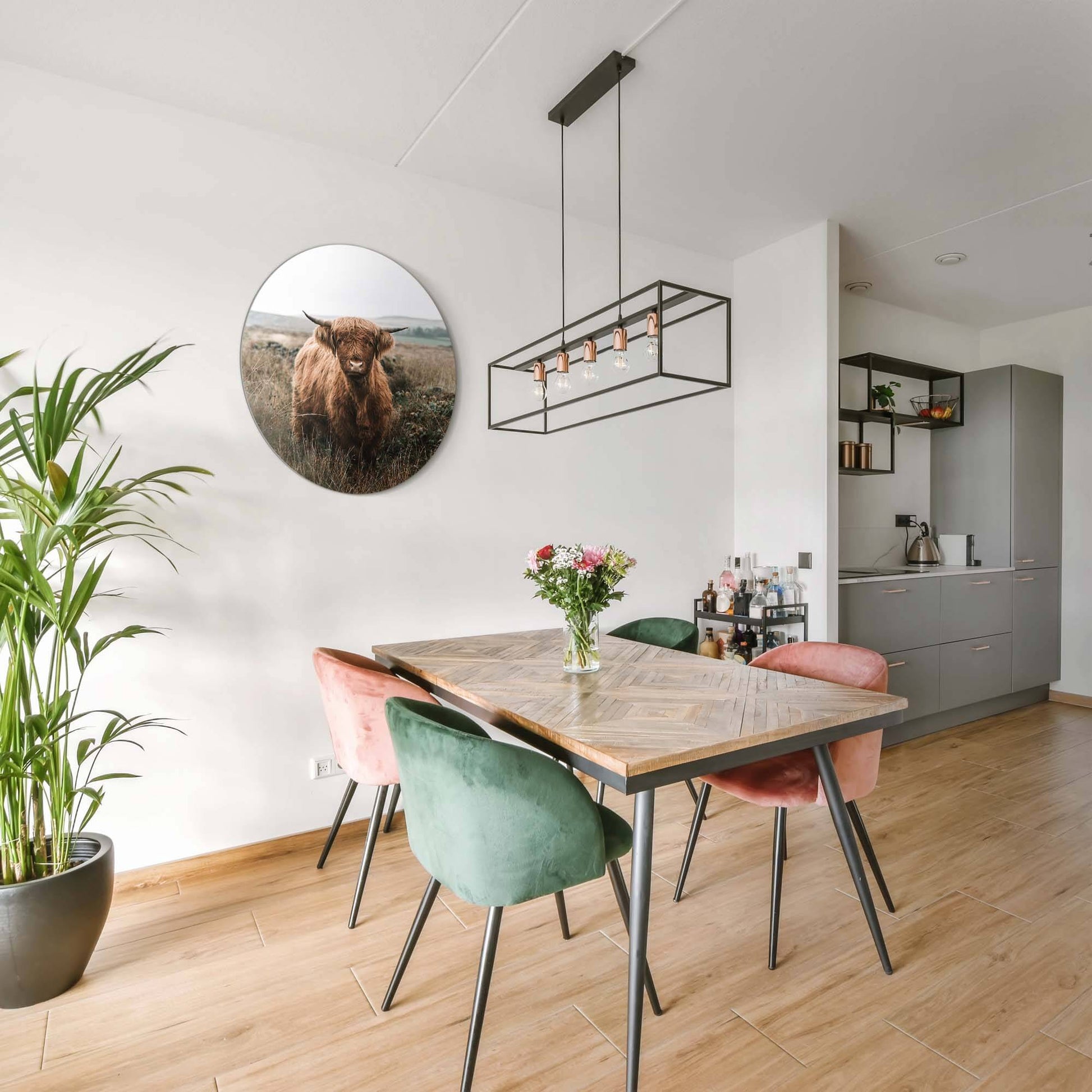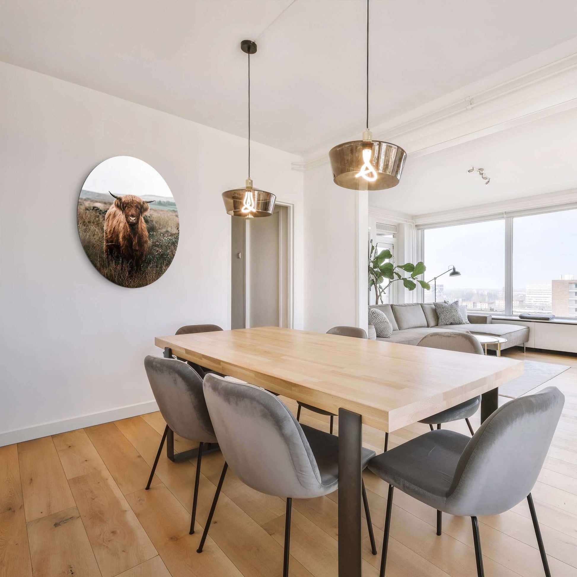 Een sfeervolle muurcirkel met een Schotse hooglander in de weidse natuur. De aardse tinten en het zachte licht brengen warmte en rust in elke keuken, eetkamer of woonkamer. Geprint op 3 mm dik aluminium dibond — duurzaam, kleurecht en eenvoudig schoon te houden.
