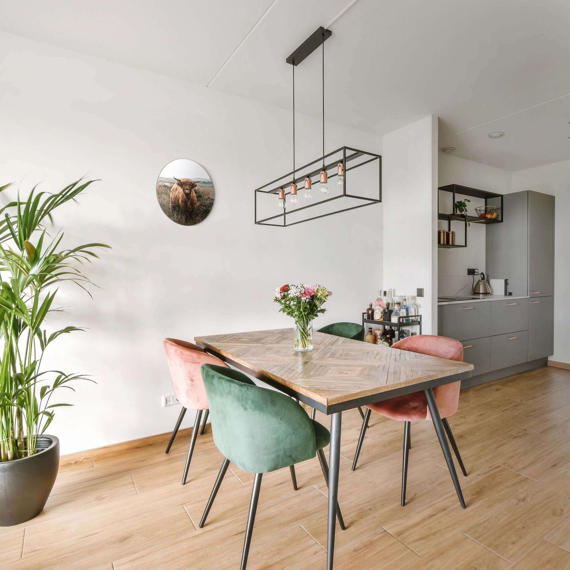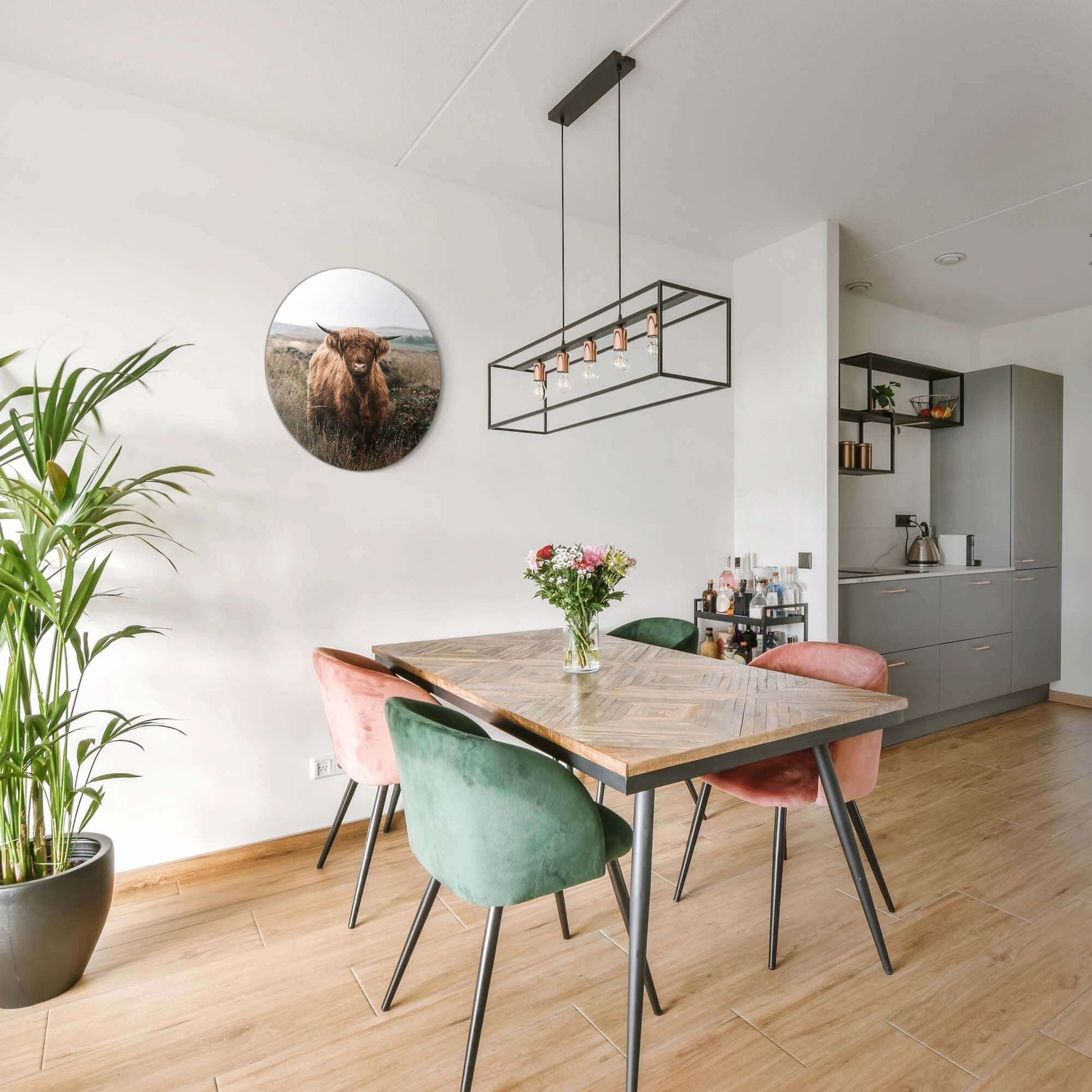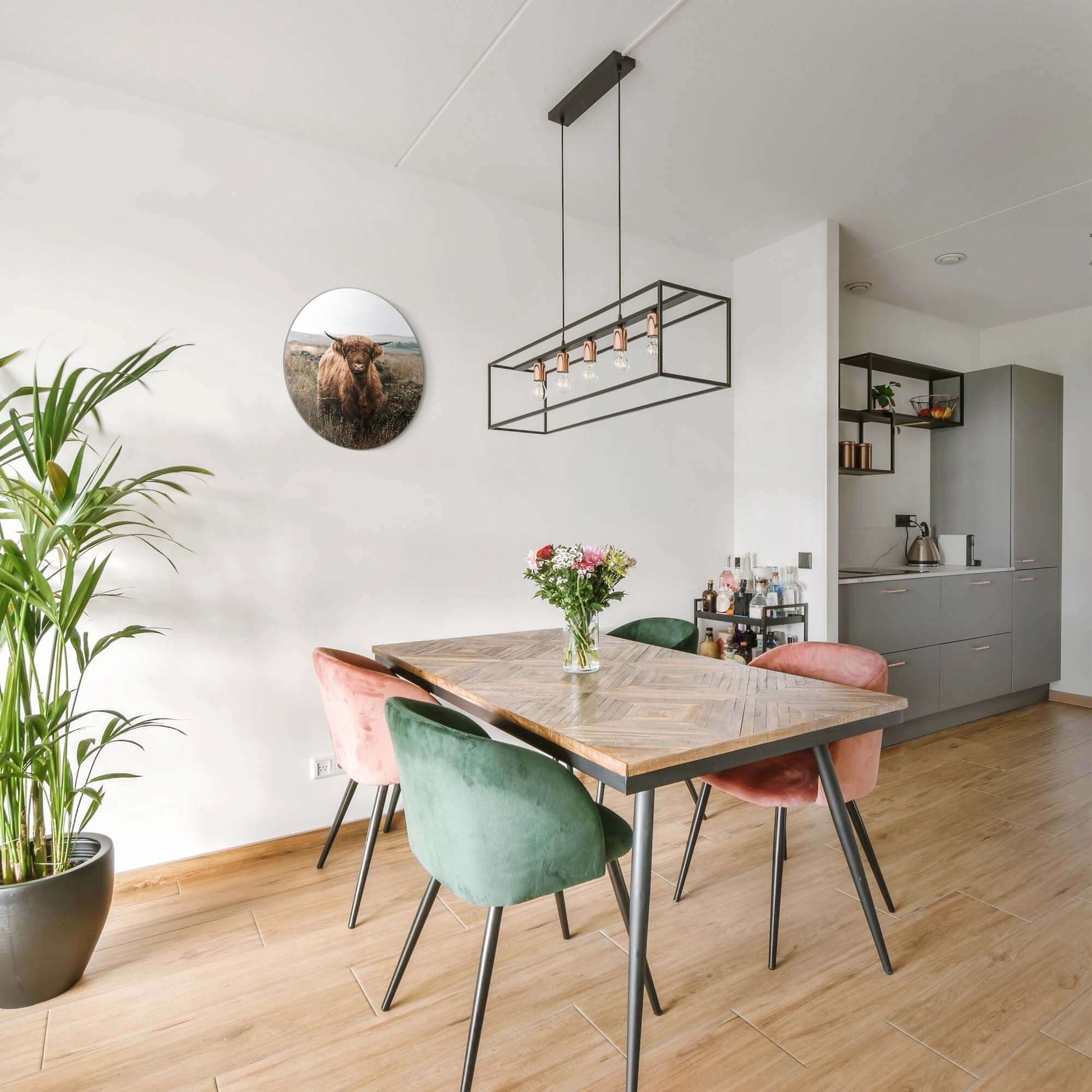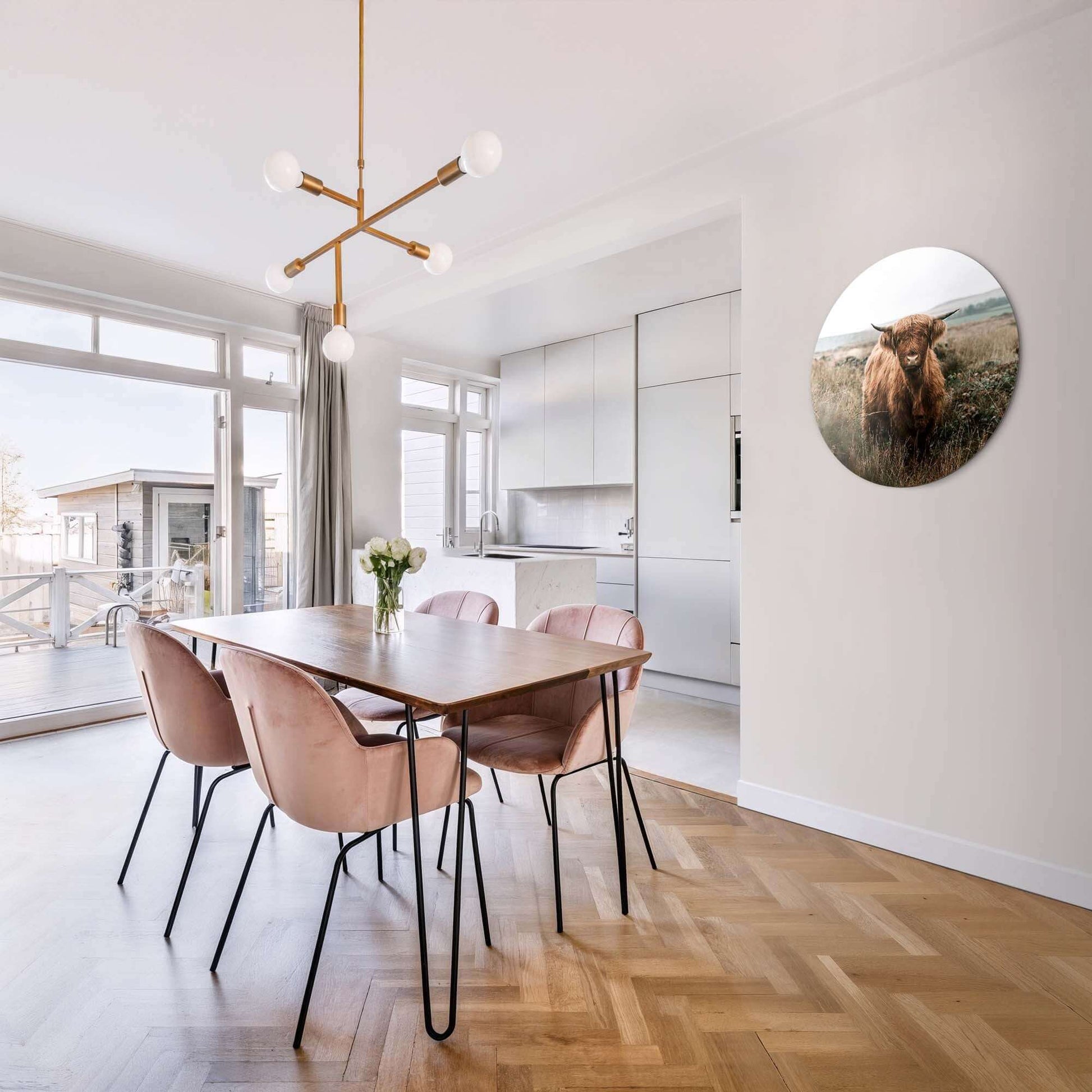 Een sfeervolle muurcirkel met een Schotse hooglander in de weidse natuur. De aardse tinten en het zachte licht brengen warmte en rust in elke keuken, eetkamer of woonkamer. Geprint op 3 mm dik aluminium dibond — duurzaam, kleurecht en eenvoudig schoon te houden.