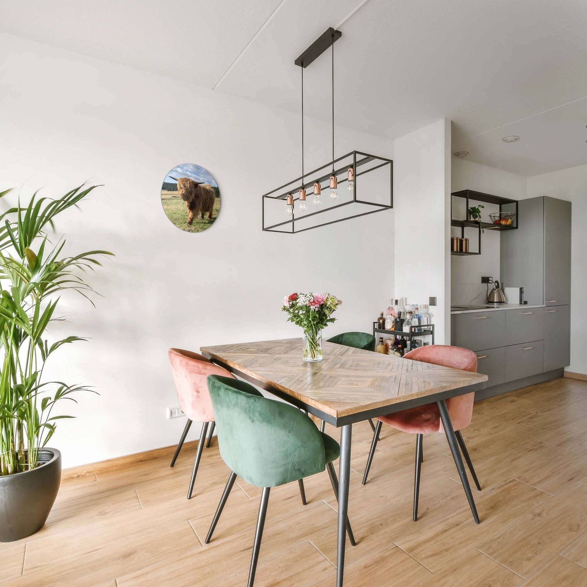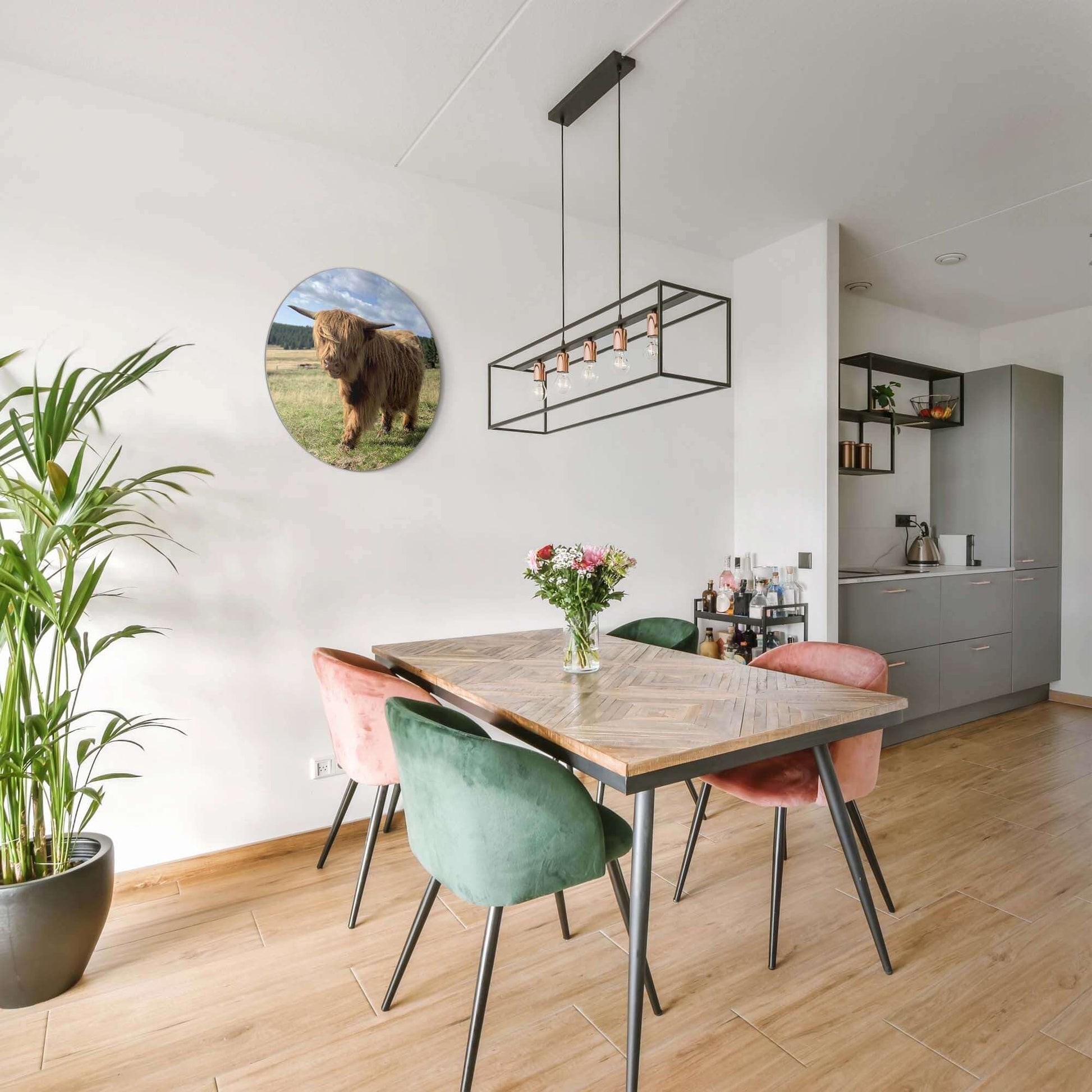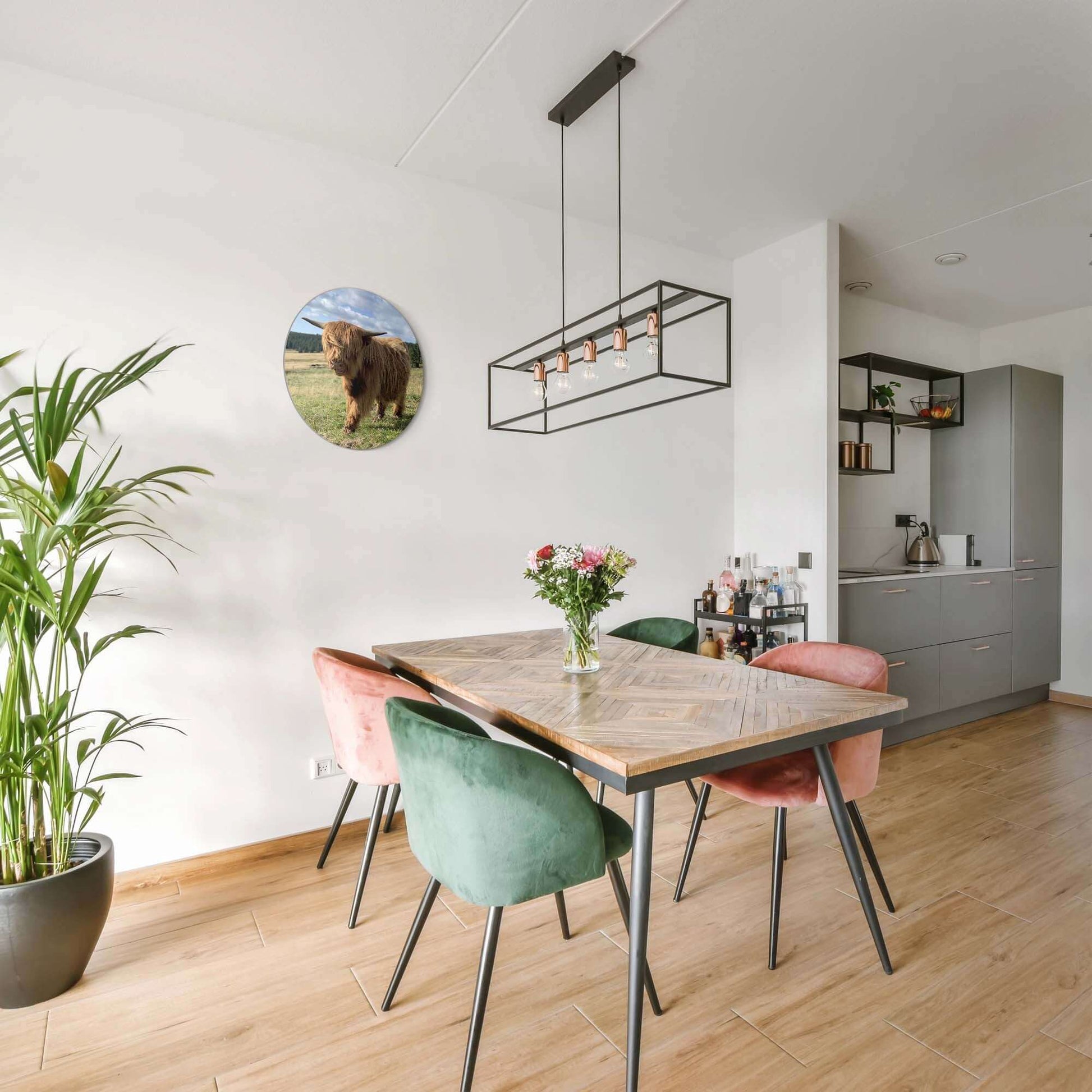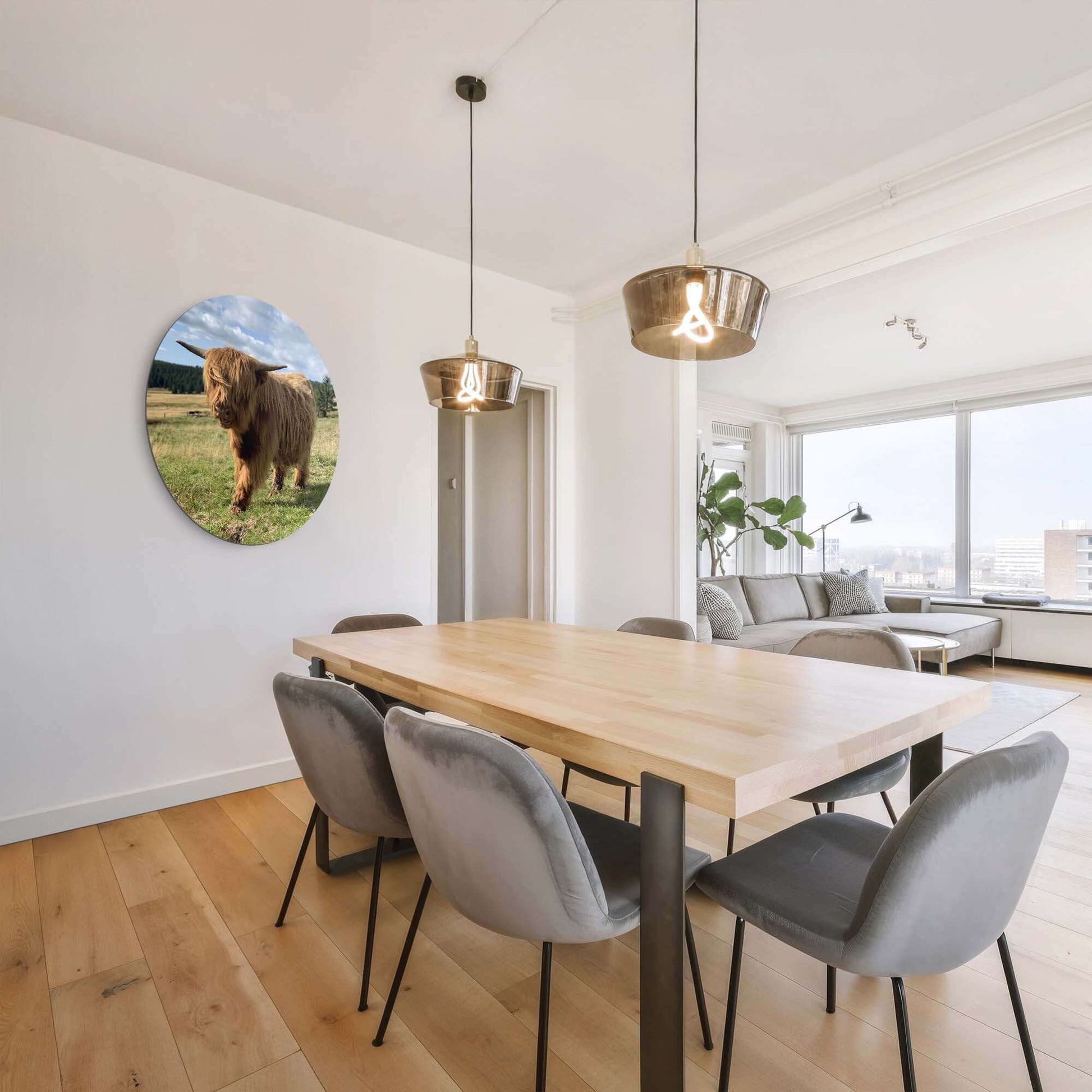 Een krachtige muurcirkel met een Schotse hooglander in het zonovergoten veld. De warme kleuren en het zachte licht brengen een natuurlijke sfeer in je keuken, eetkamer of woonkamer. Geprint op 3 mm dik aluminium dibond — duurzaam, kleurecht en makkelijk schoon te maken.