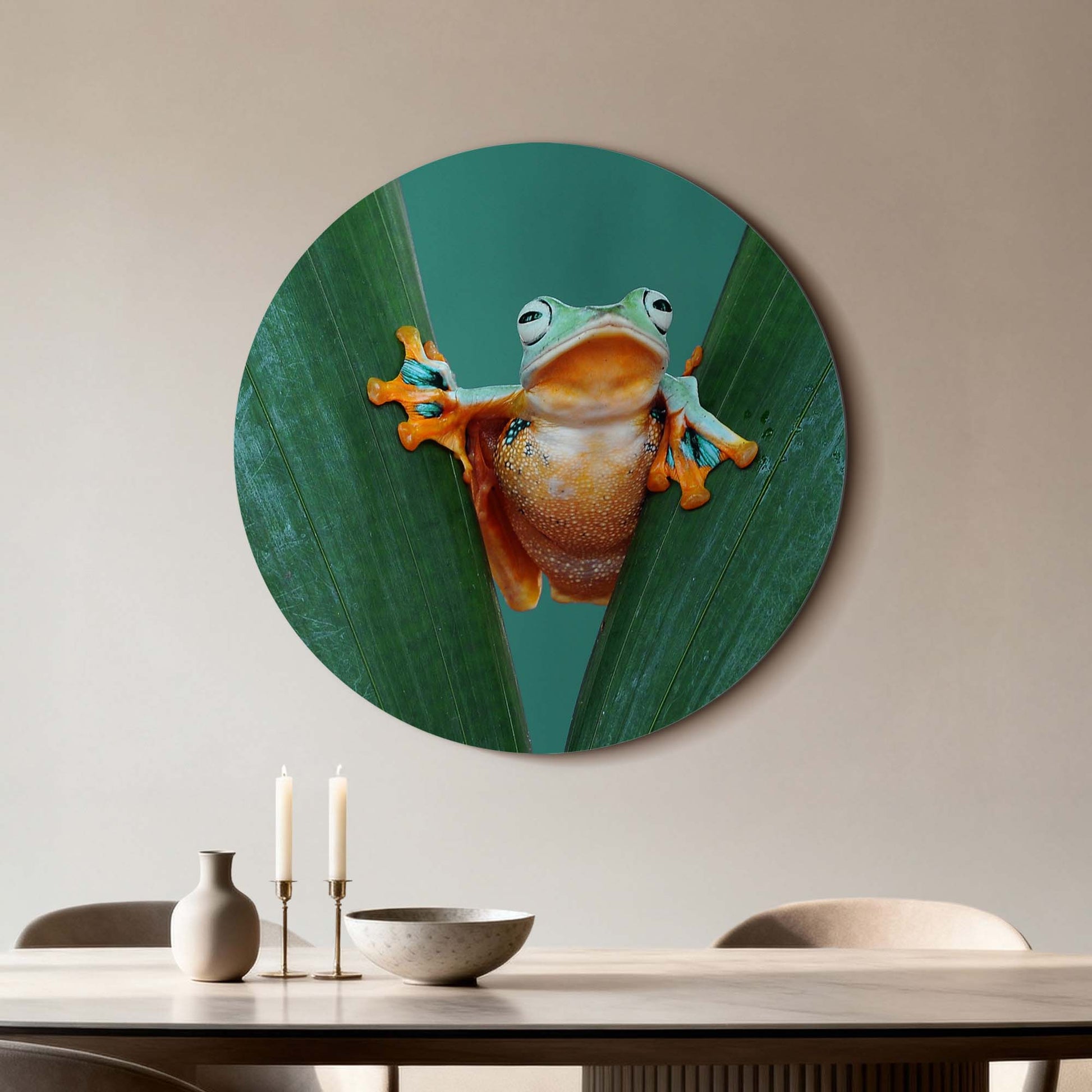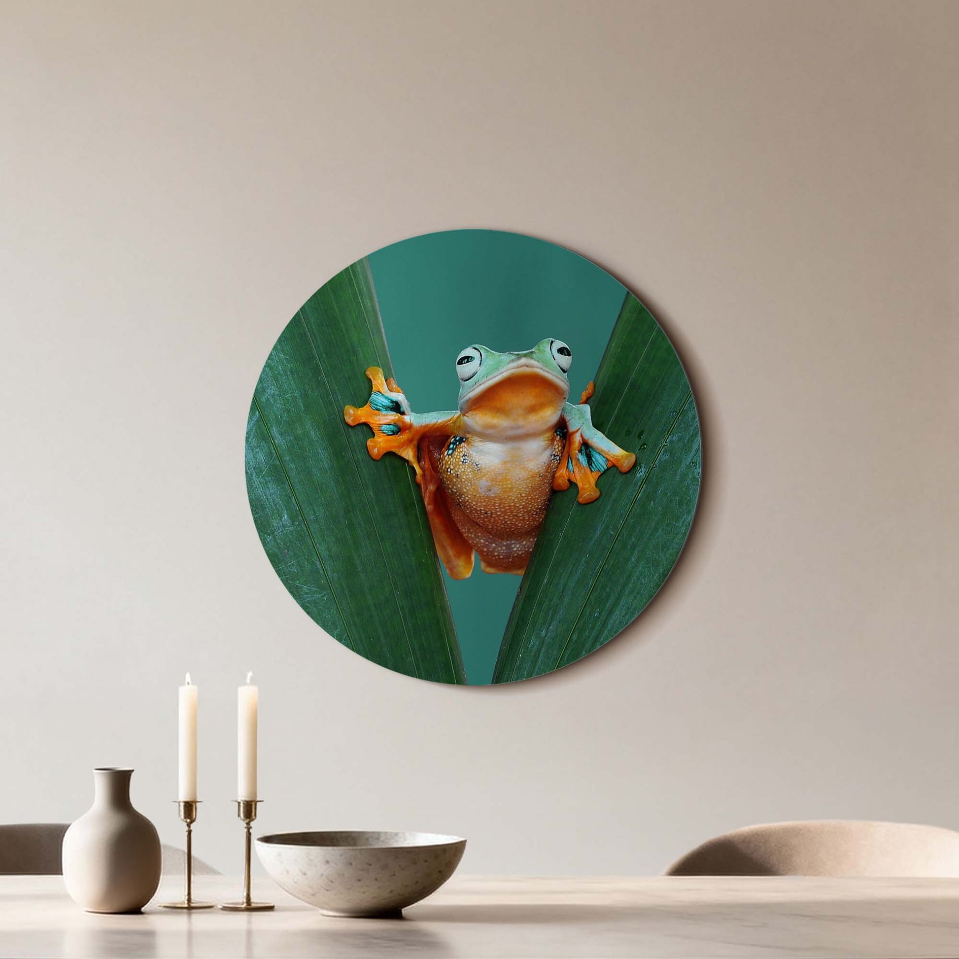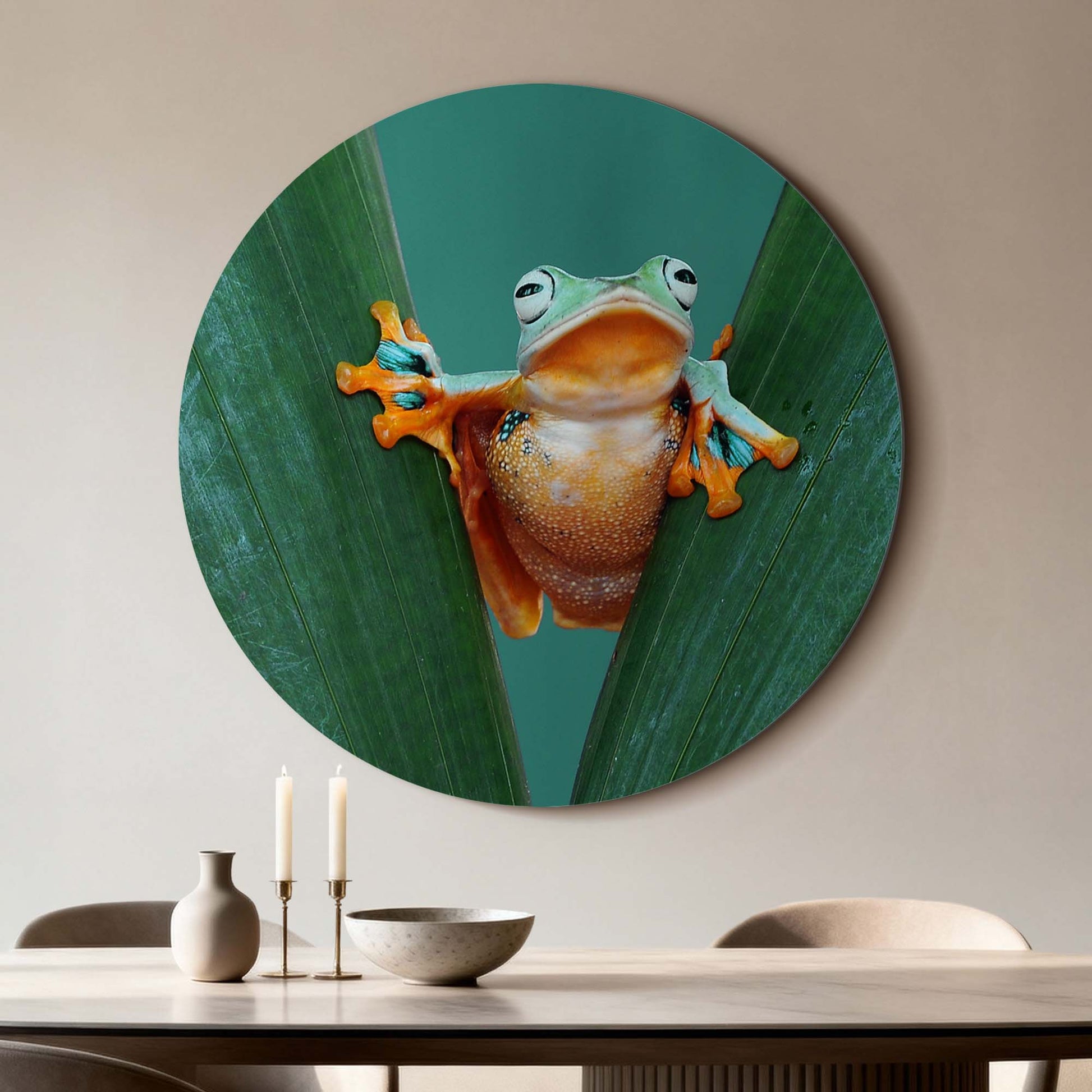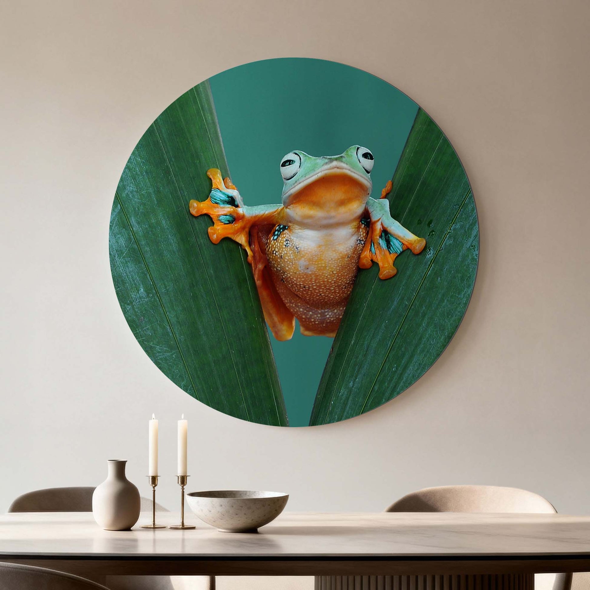 Met Jungle Leap breng je kleur en karakter in huis. De felgekleurde kikker tussen frisgroene bladeren straalt energie en optimisme uit — een speelse toevoeging aan elk interieur.