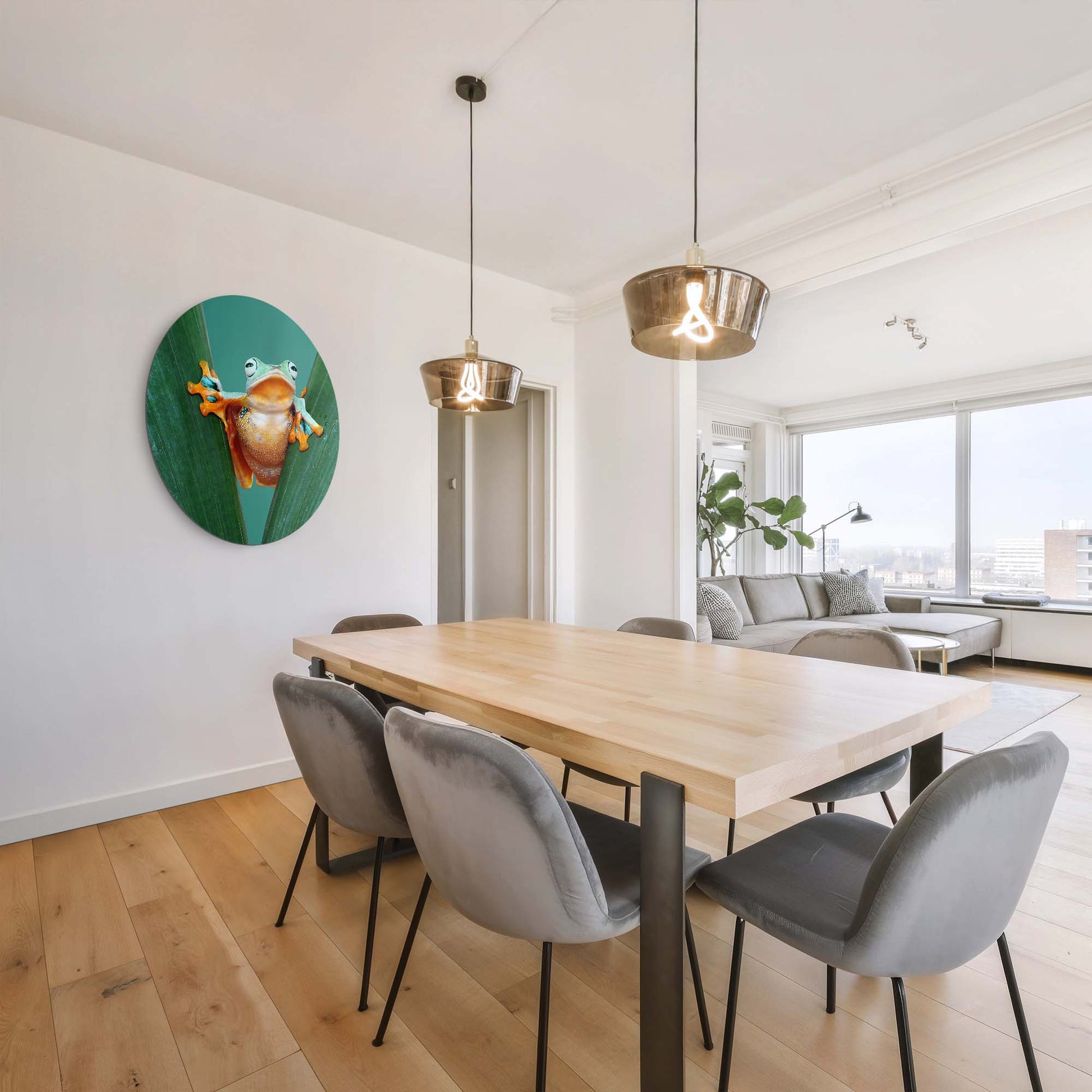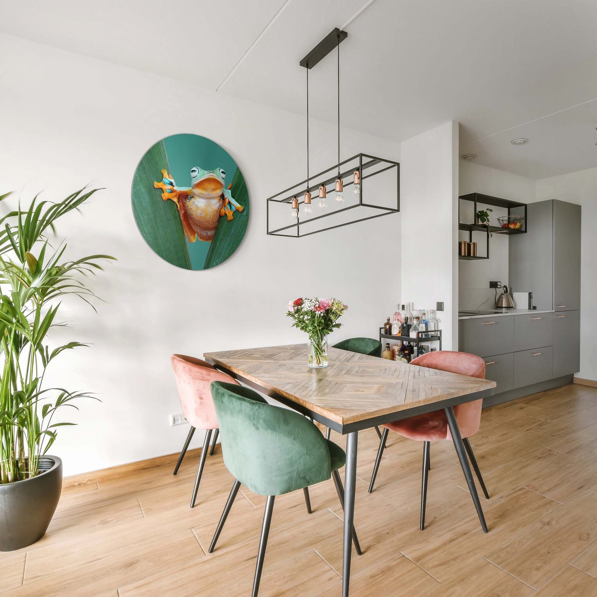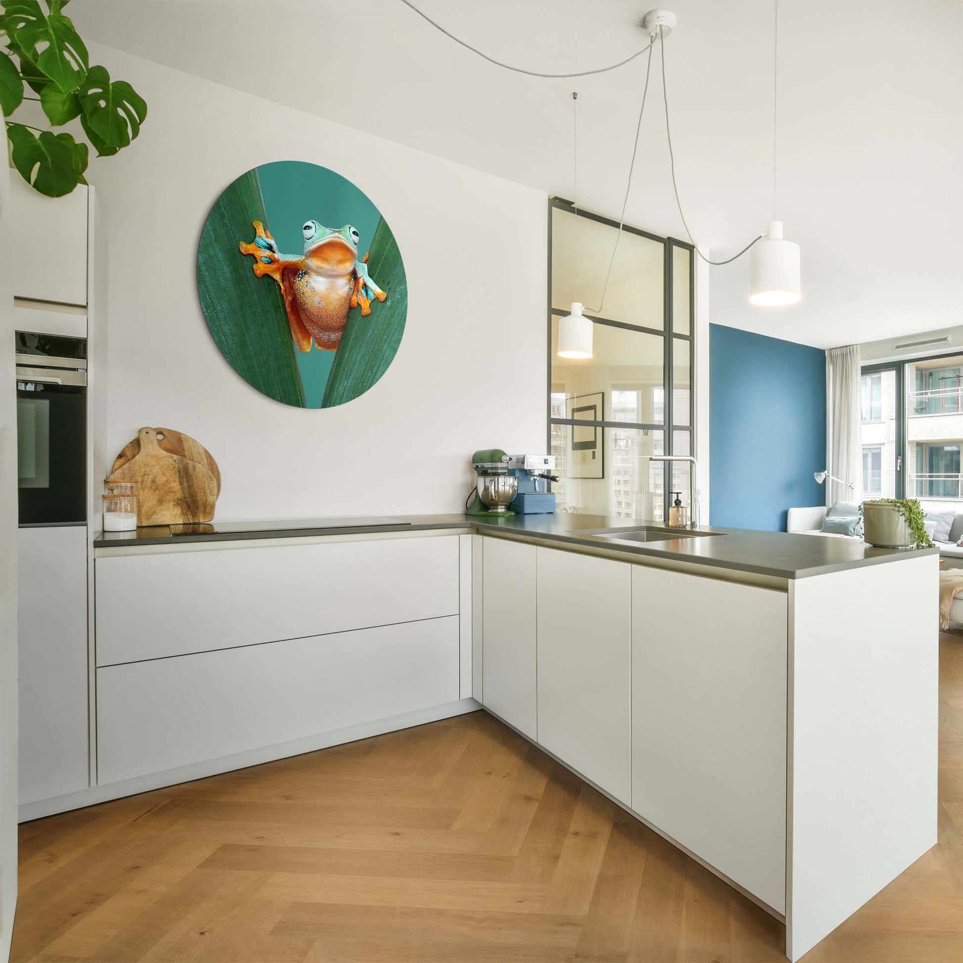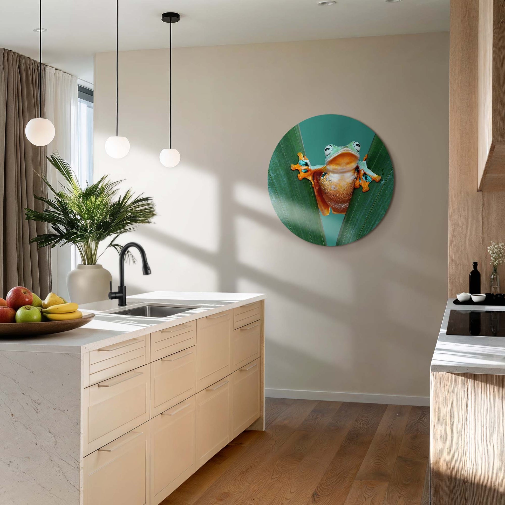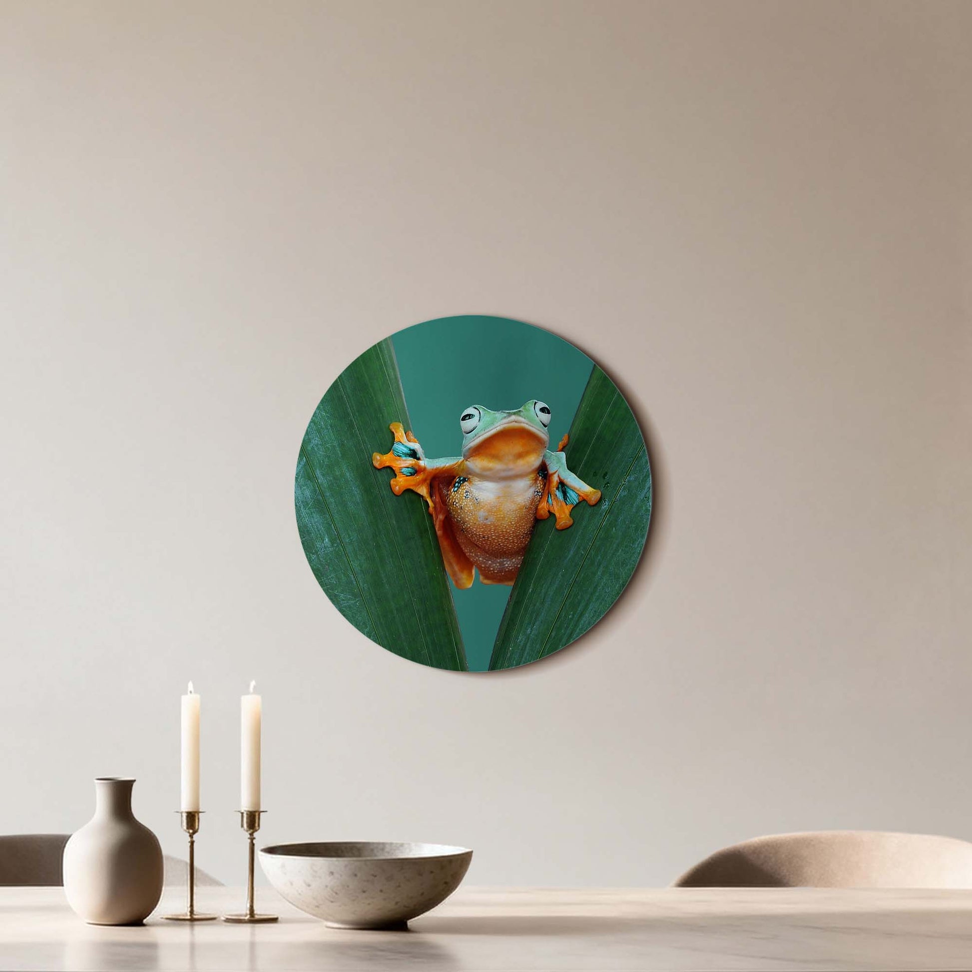 Met Jungle Leap breng je kleur en karakter in huis. De felgekleurde kikker tussen frisgroene bladeren straalt energie en optimisme uit — een speelse toevoeging aan elk interieur.