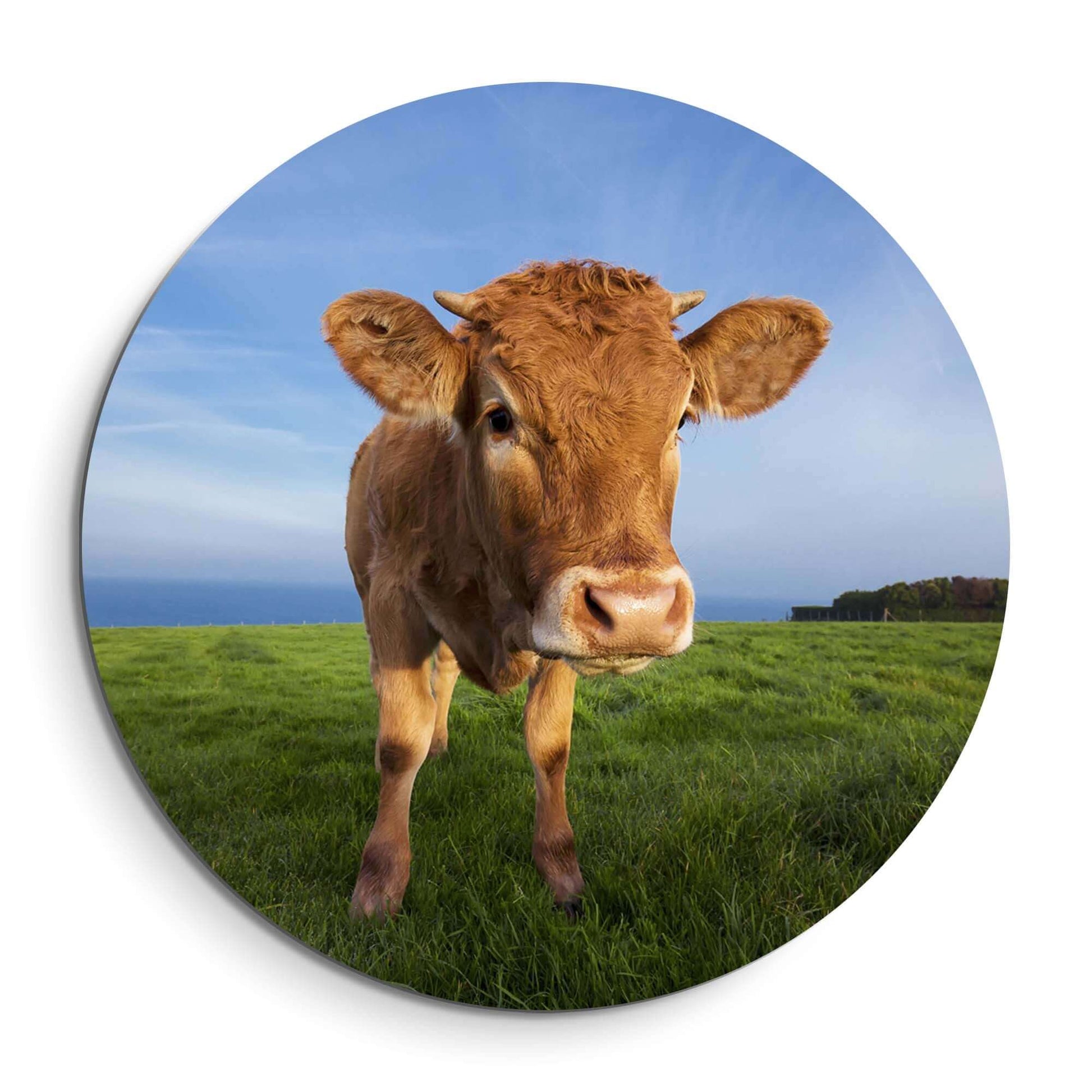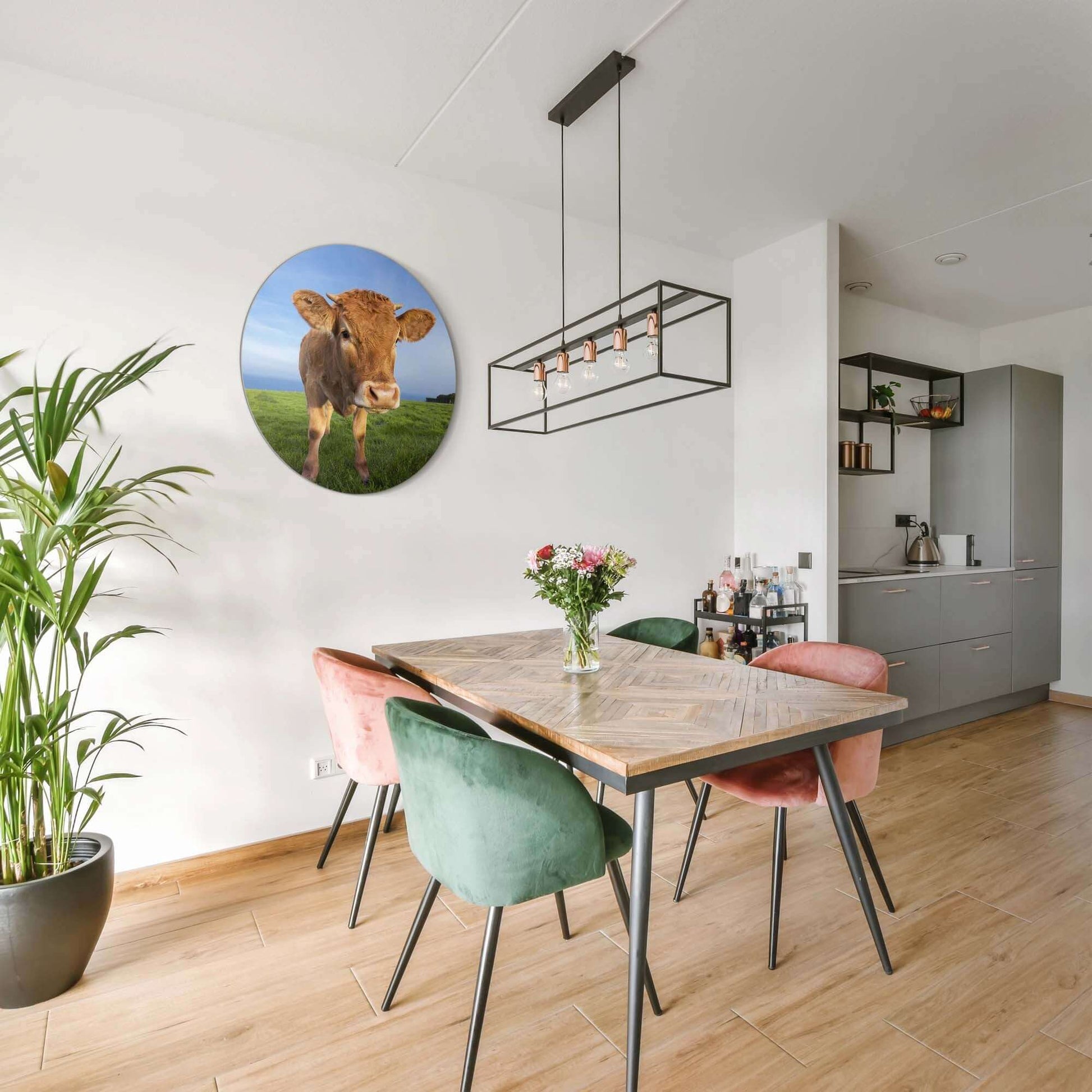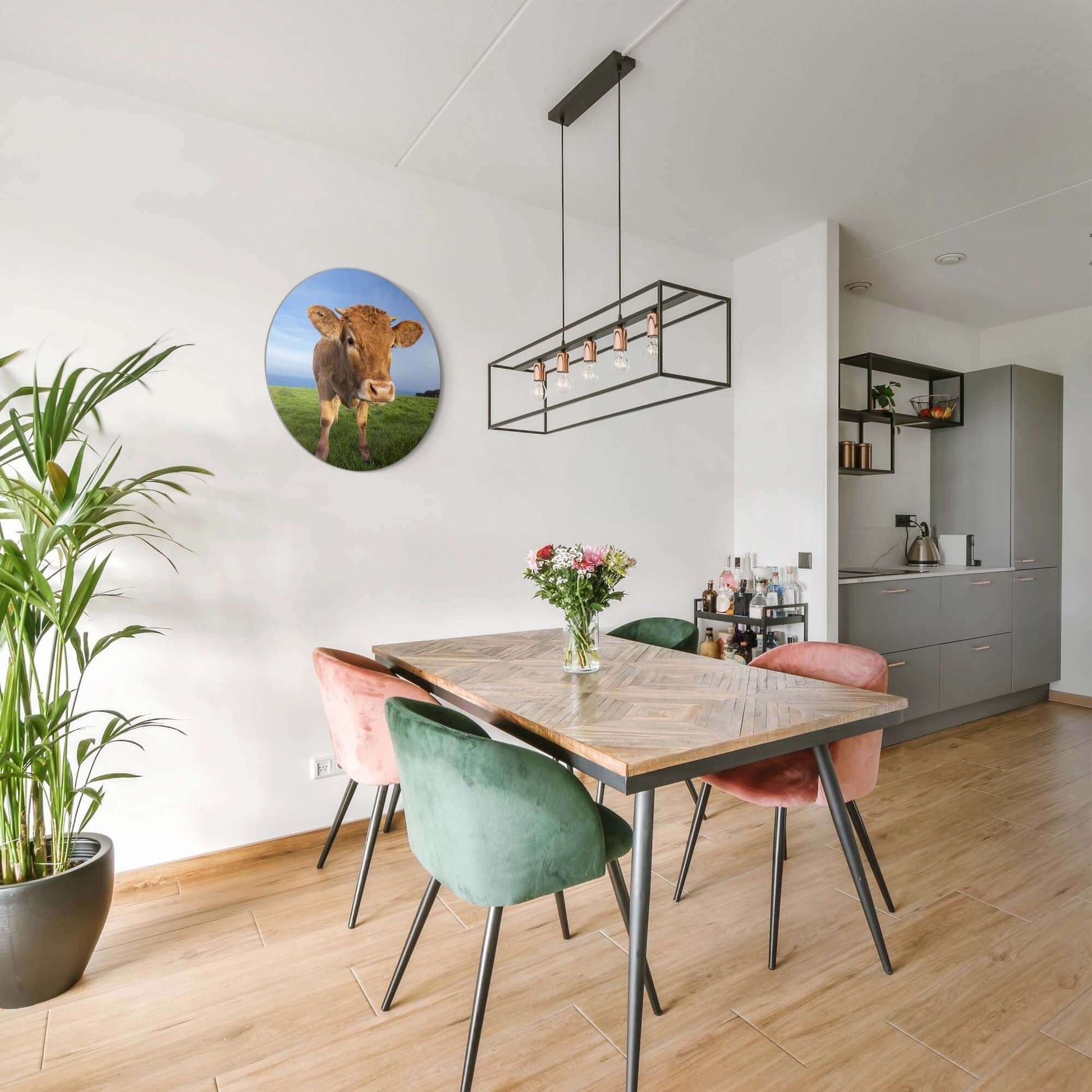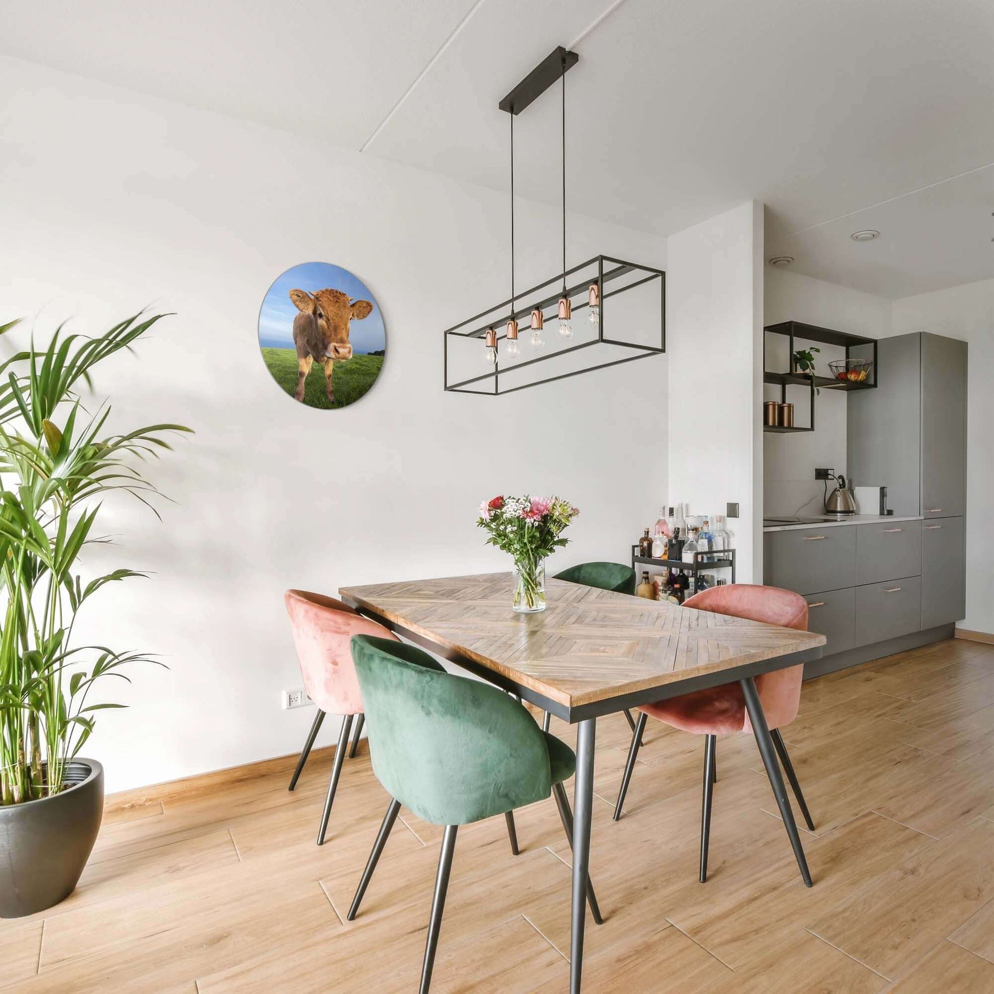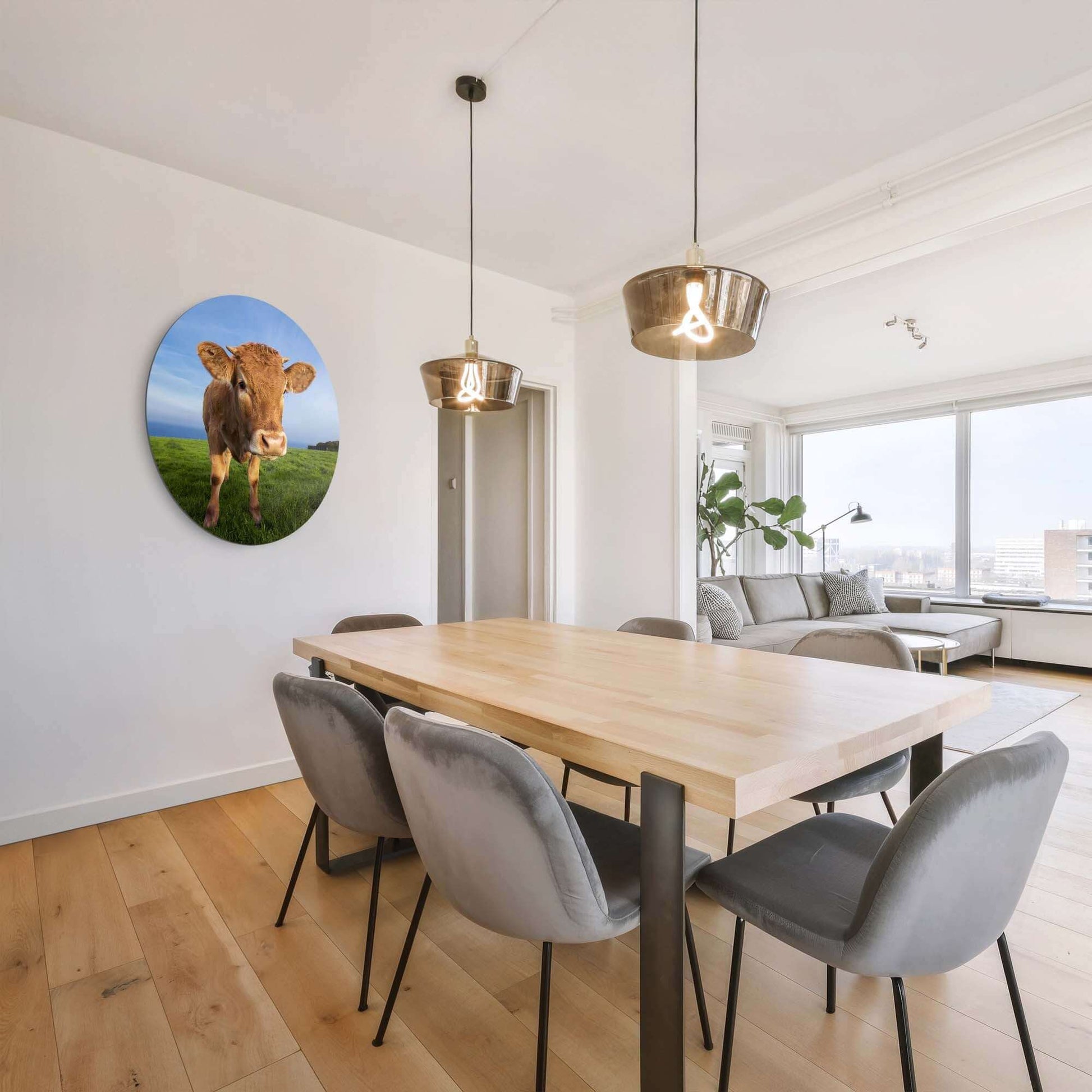 Breng rust en landelijk karakter in je keuken of woonkamer met deze muurcirkel van een nieuwsgierig kalf in het weiland. Gemaakt van premium aluminium dibond met haarscherpe details en zijdeglans afwerking. Licht, strak en duurzaam – een tijdloos accent aan de muur.