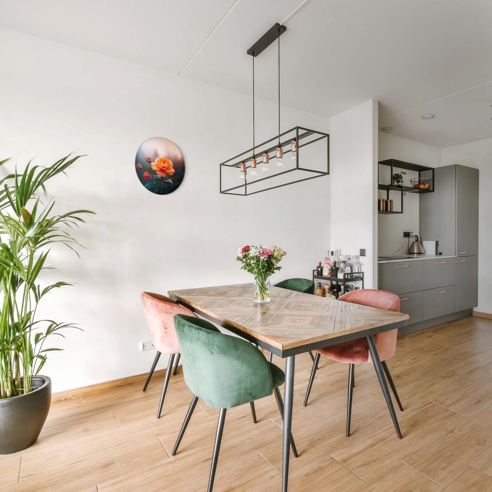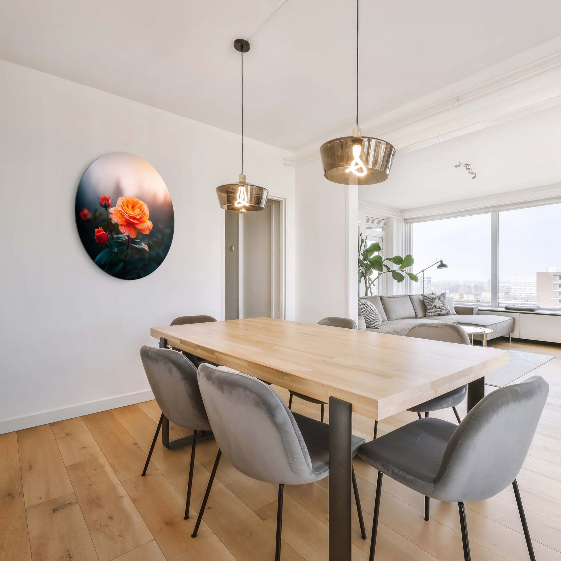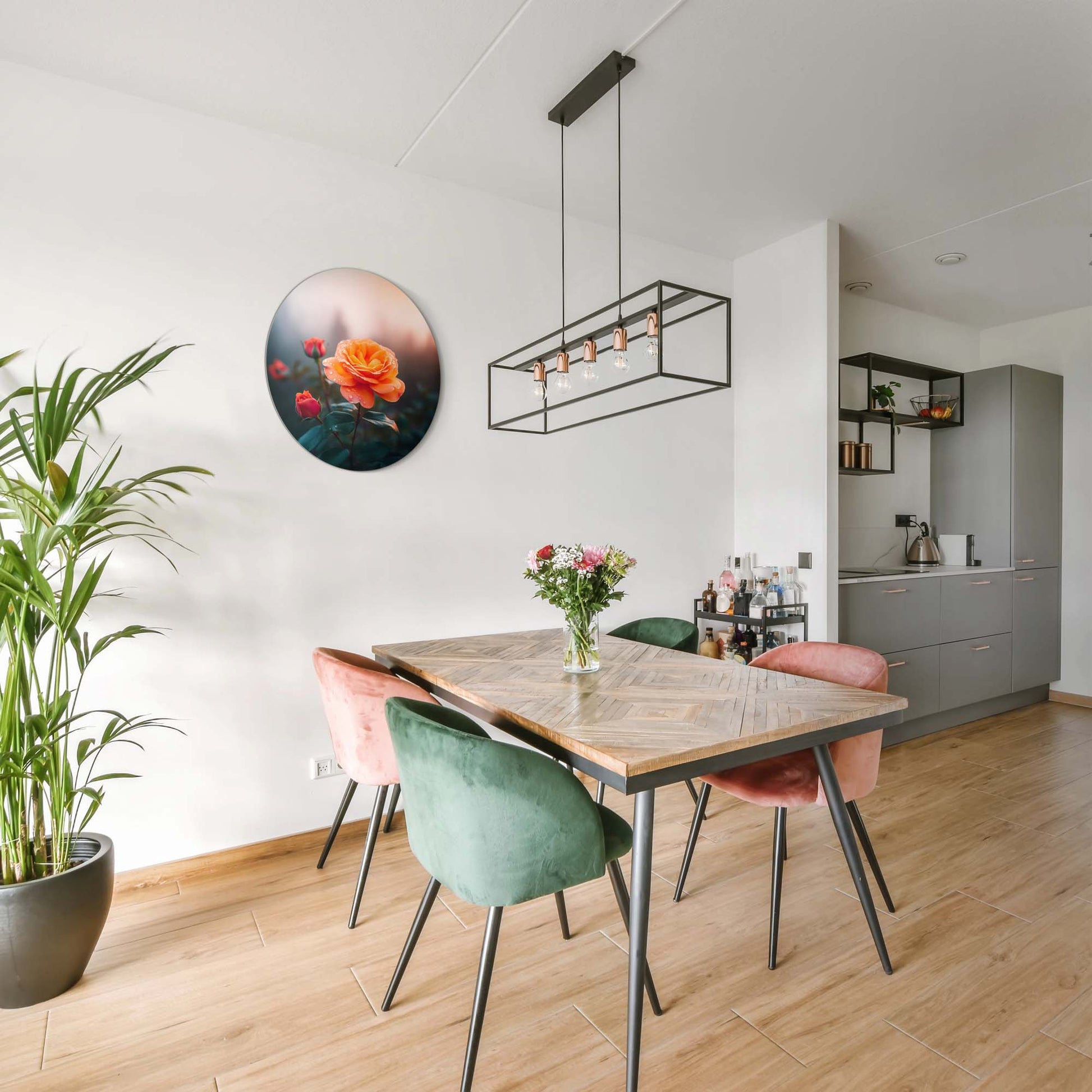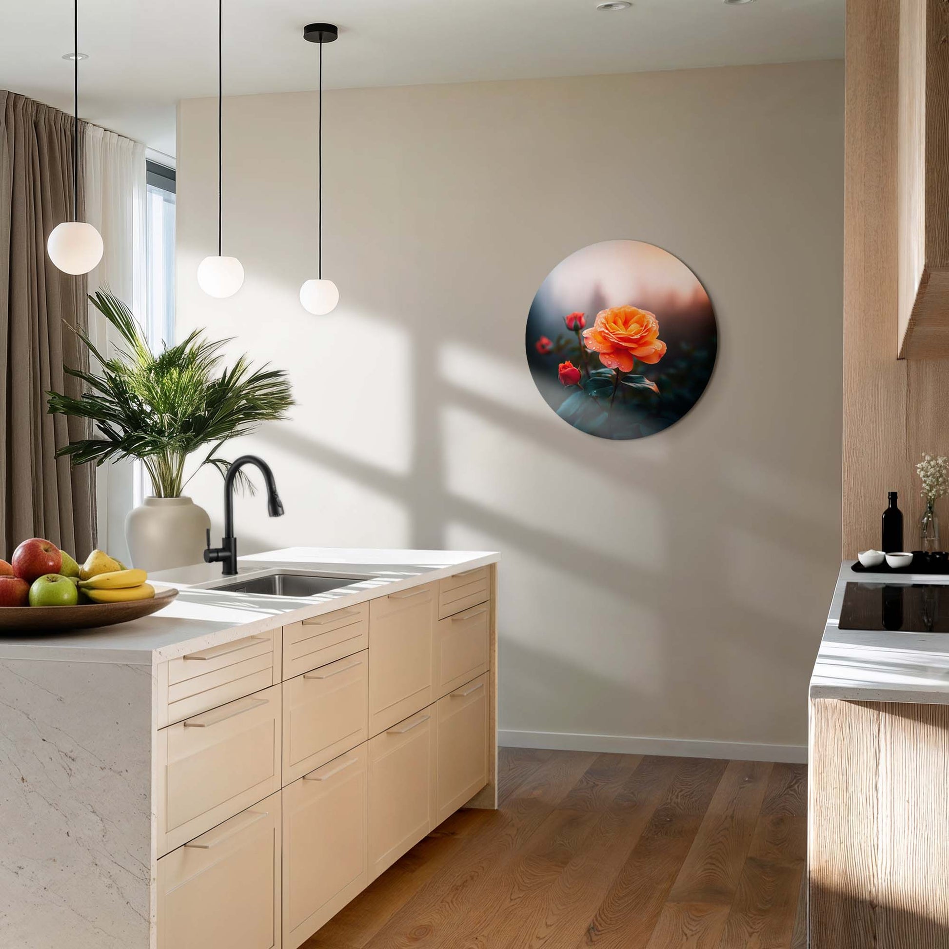 Een warme oranje roos in zacht ochtendlicht. Het Ochtendroos design brengt sfeer, rust en elegantie in elke keuken of eetkamer.
