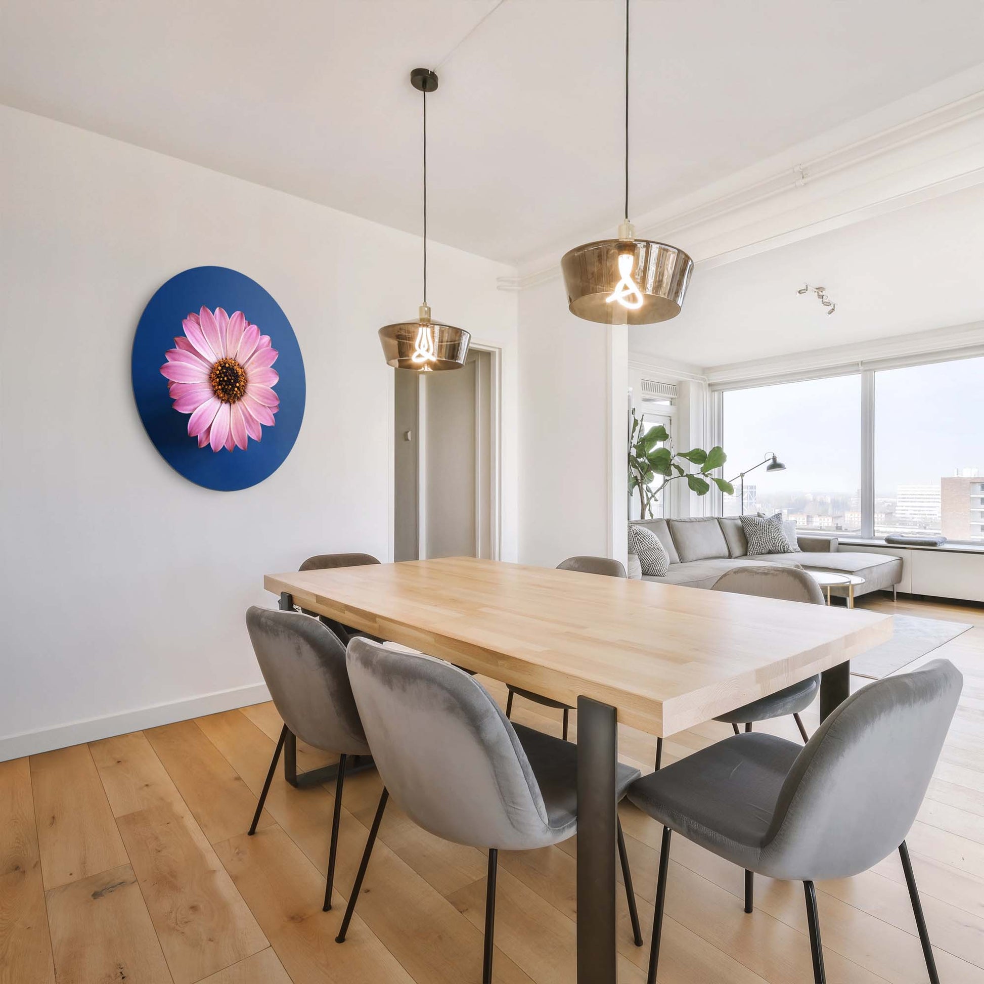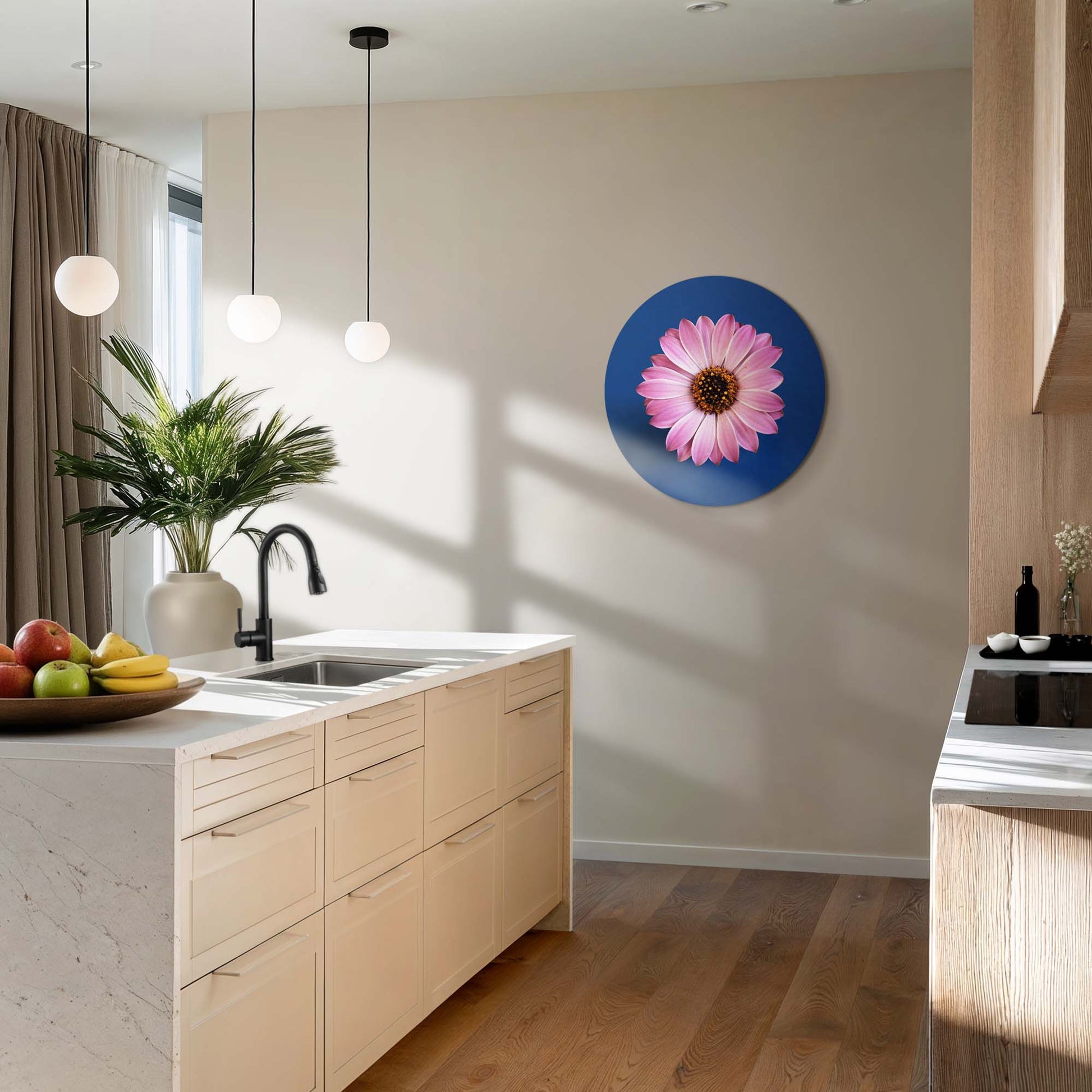 Een zachte roze margriet tegen een diepe blauwe achtergrond. De Pastel Margriet muurcirkel brengt harmonie en elegantie in elk interieur.