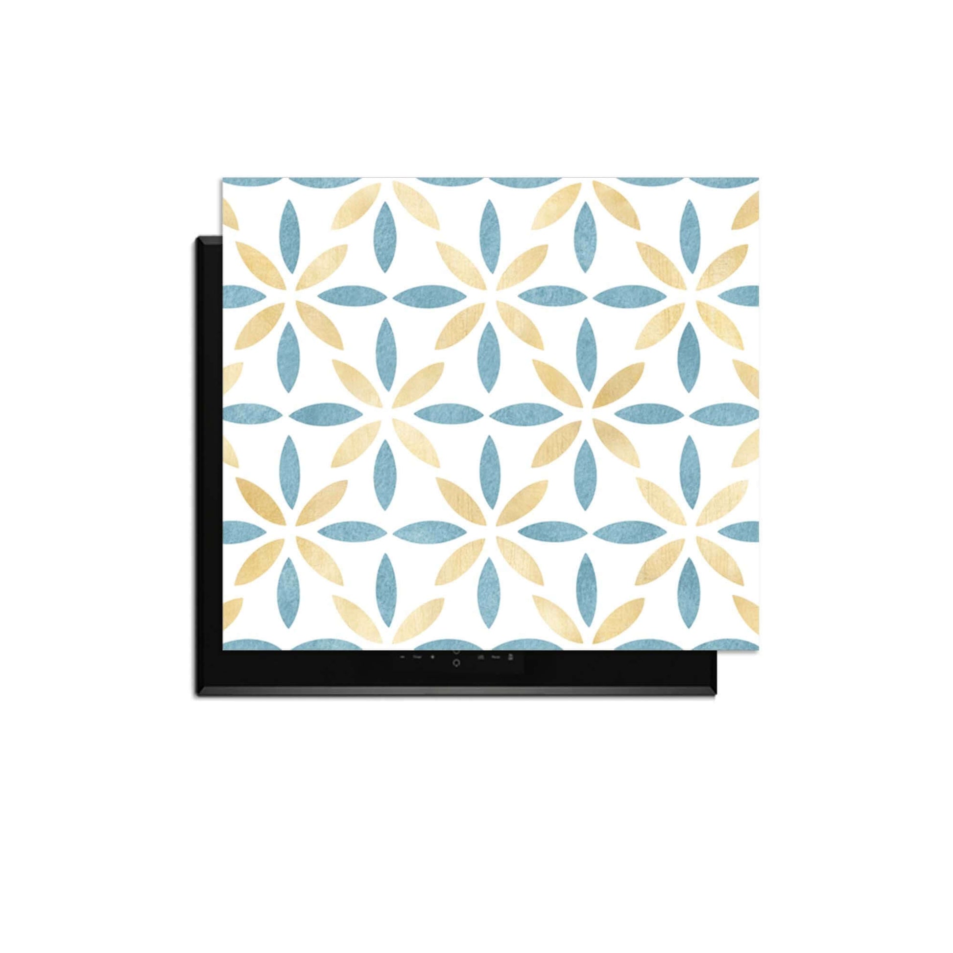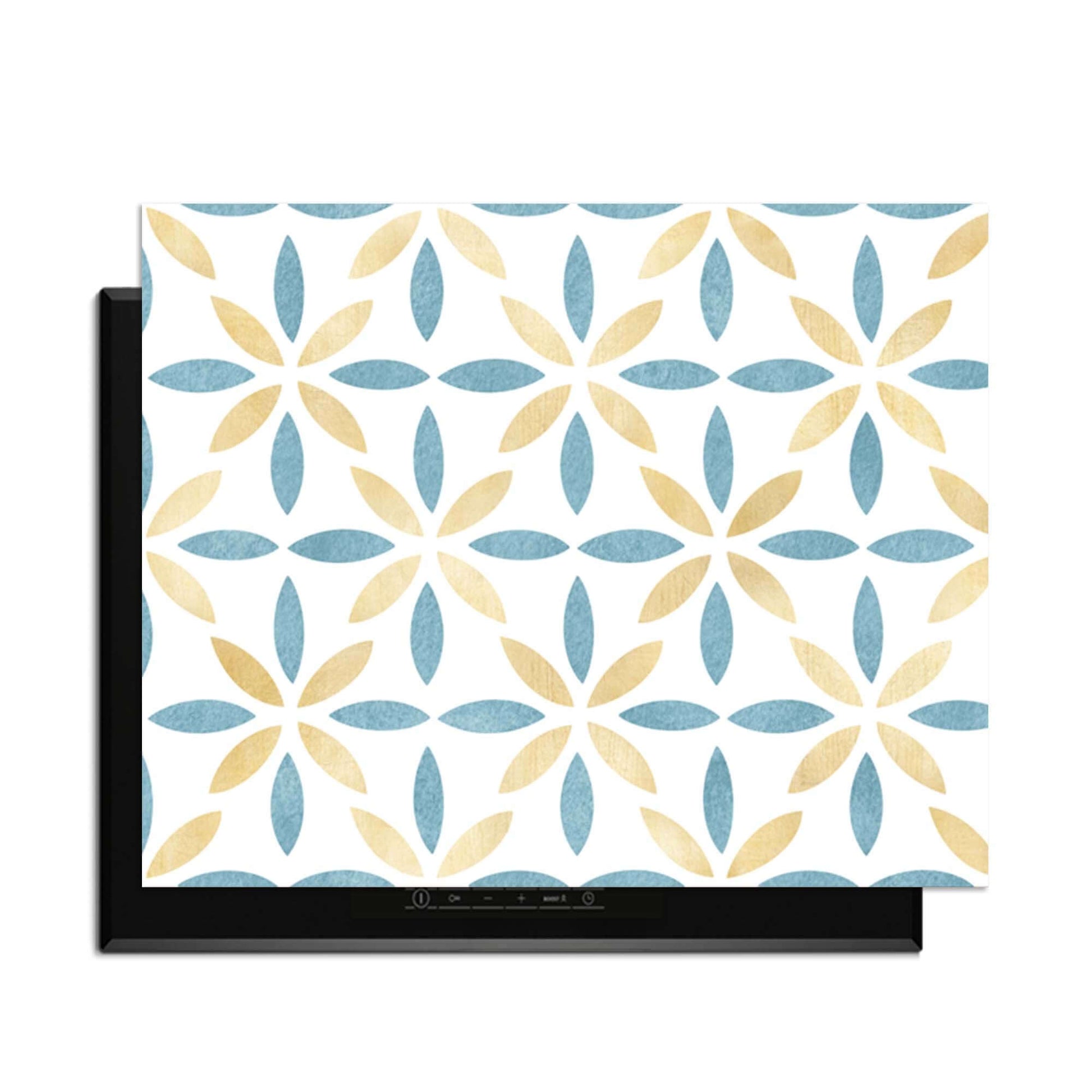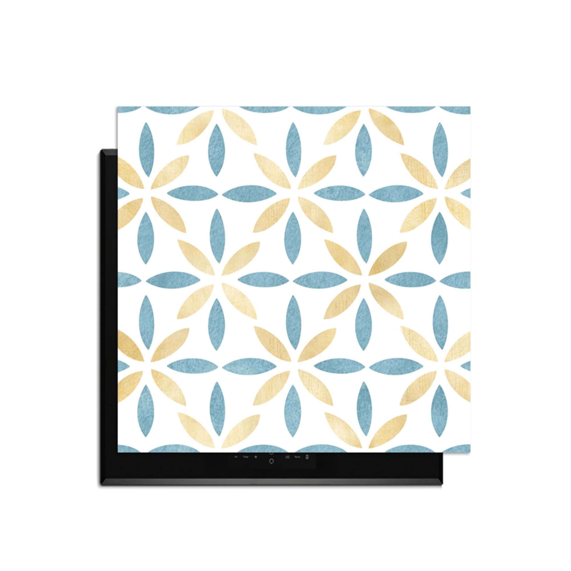 De Petal White Tile inductiebeschermer heeft een licht en fris bloemmotief in goud en azuurblauw. Een subtiel, elegant design dat elke keuken laat stralen.