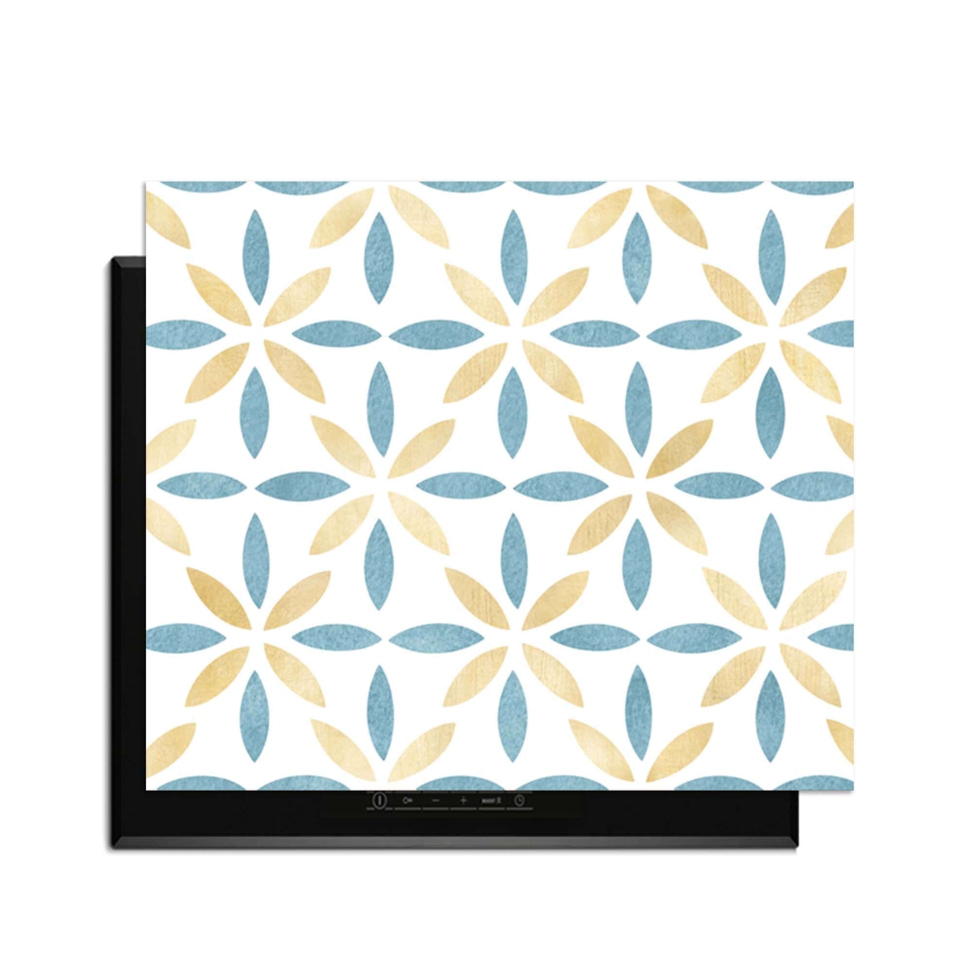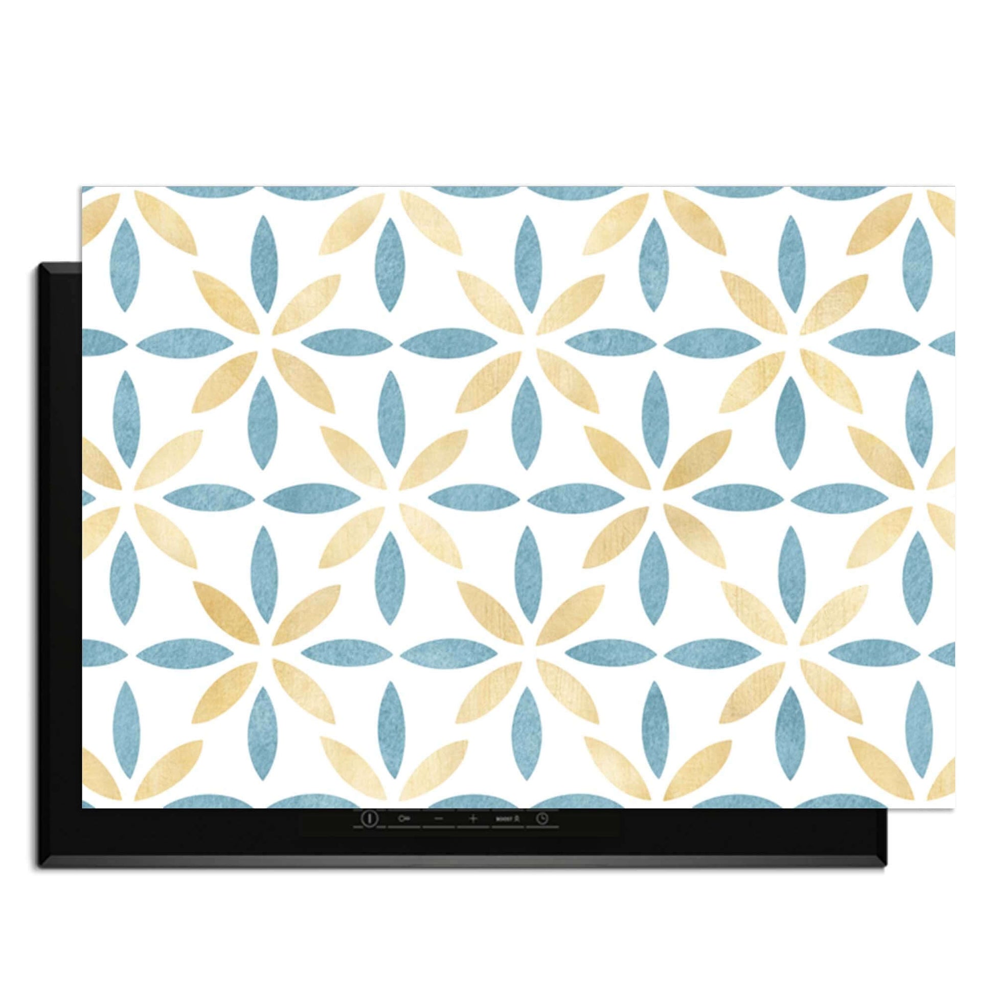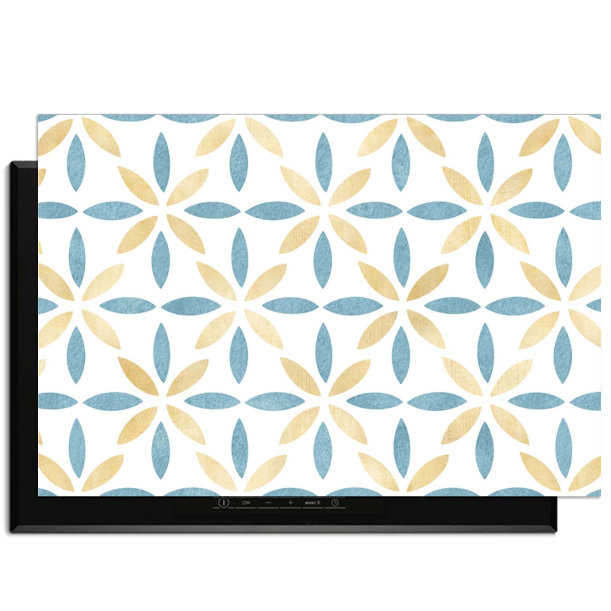 De Petal White Tile inductiebeschermer heeft een licht en fris bloemmotief in goud en azuurblauw. Een subtiel, elegant design dat elke keuken laat stralen.