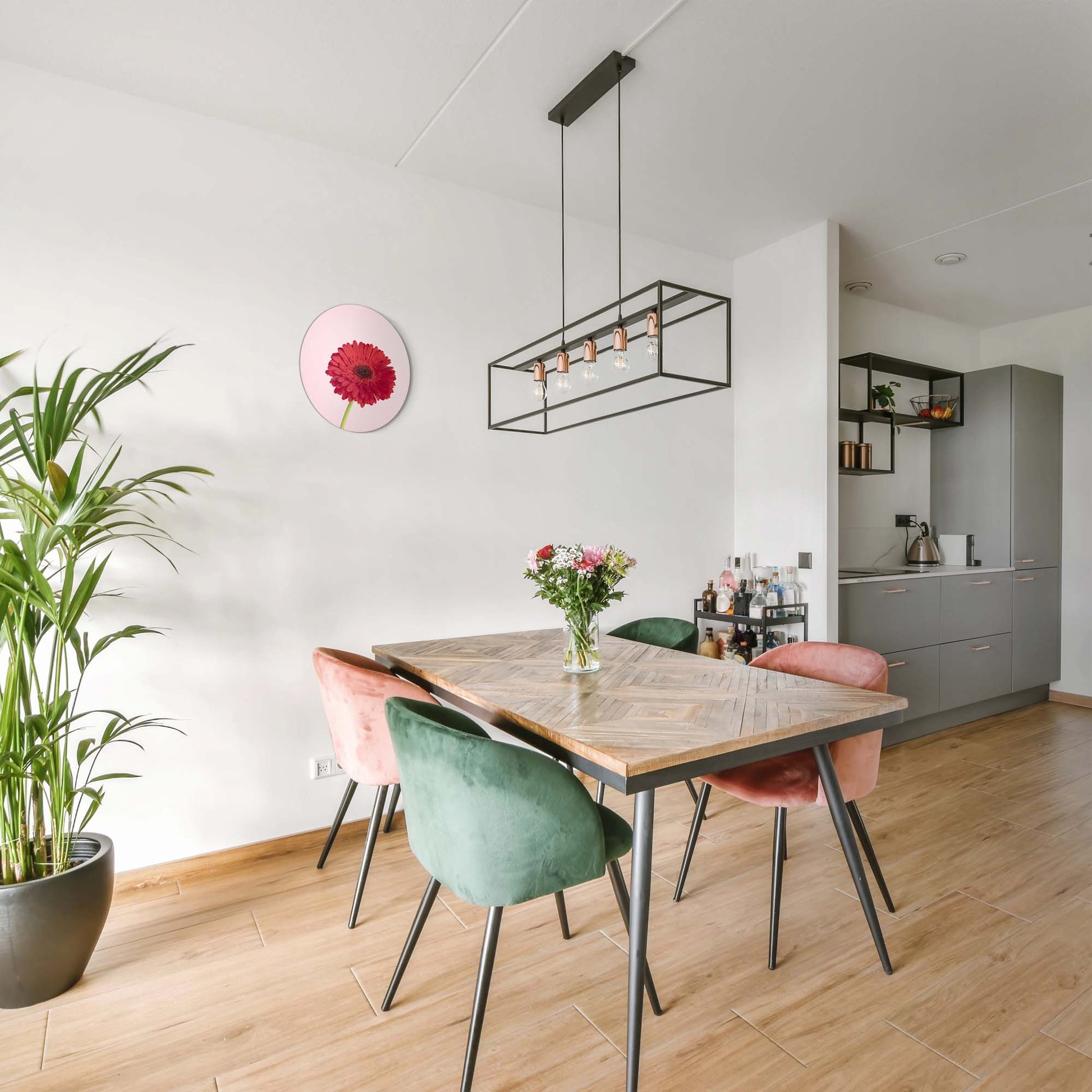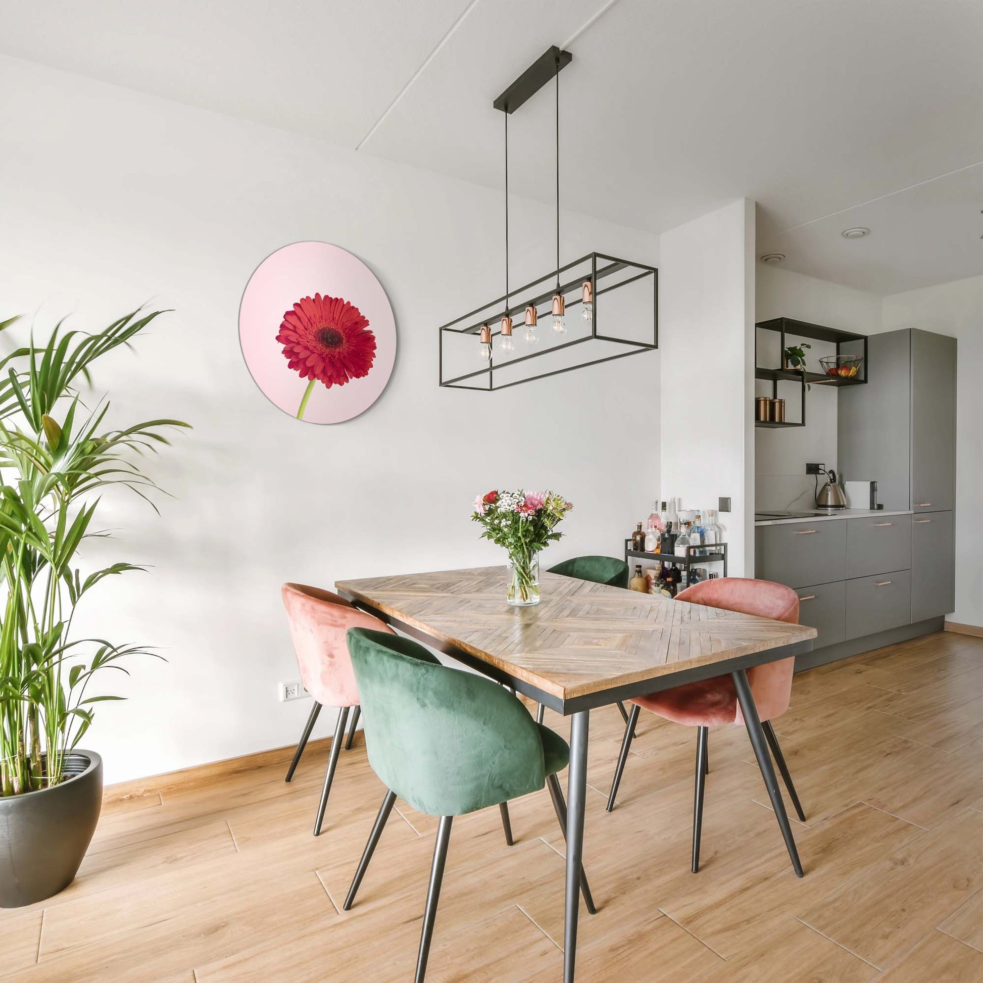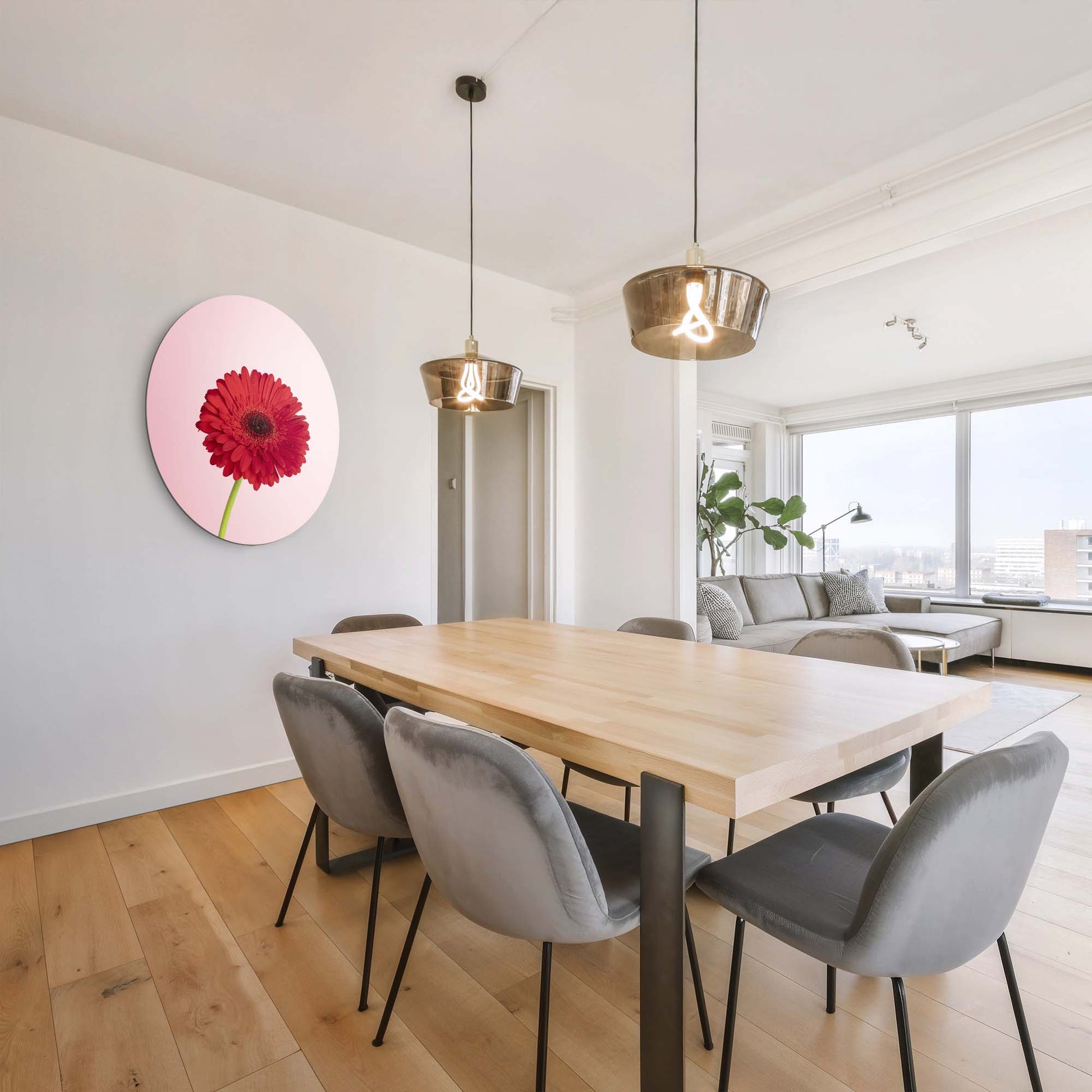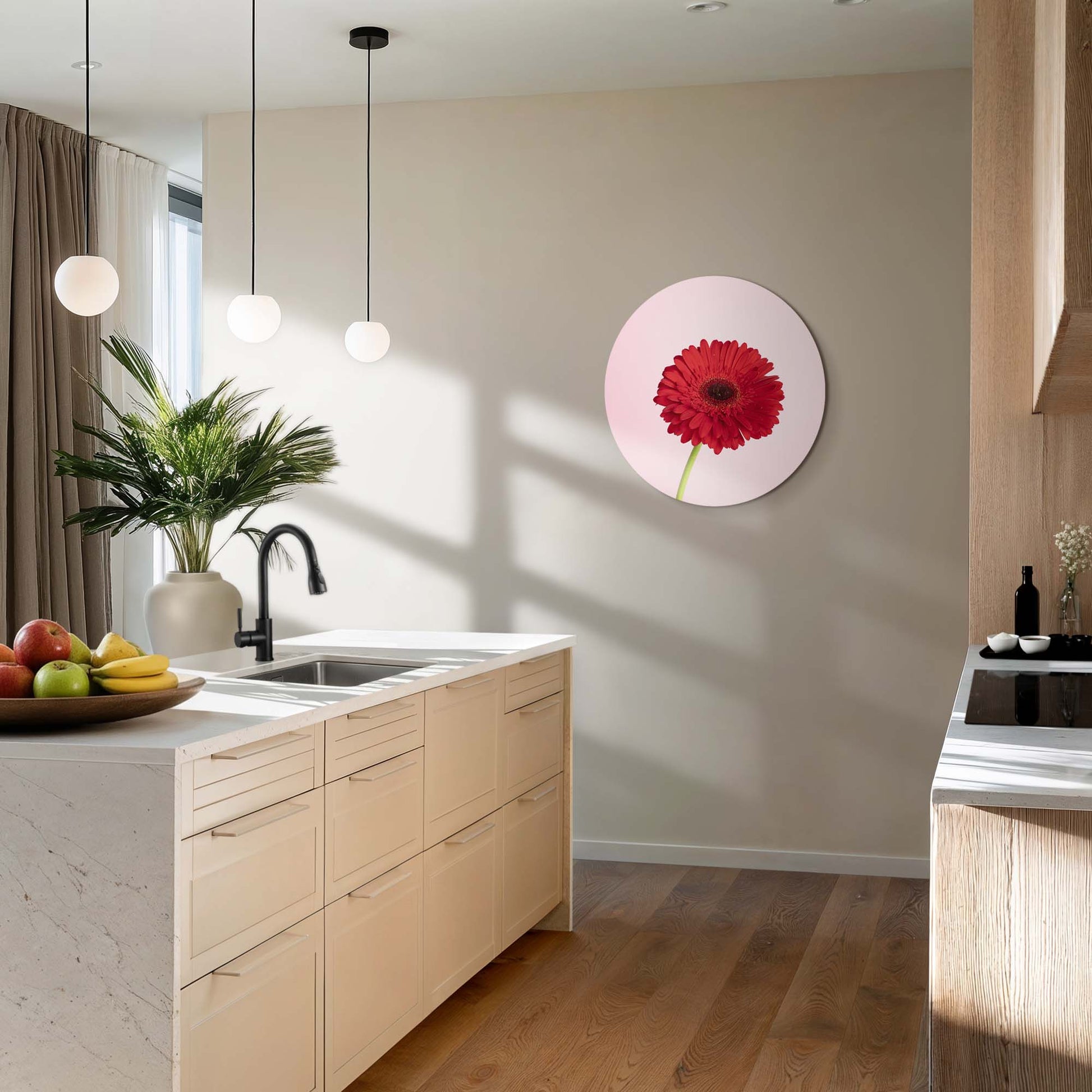 Een helderrode gerbera op een zachte roze achtergrond. De Rode Gerbera muurcirkel brengt kleur, kracht en elegantie in elke ruimte.