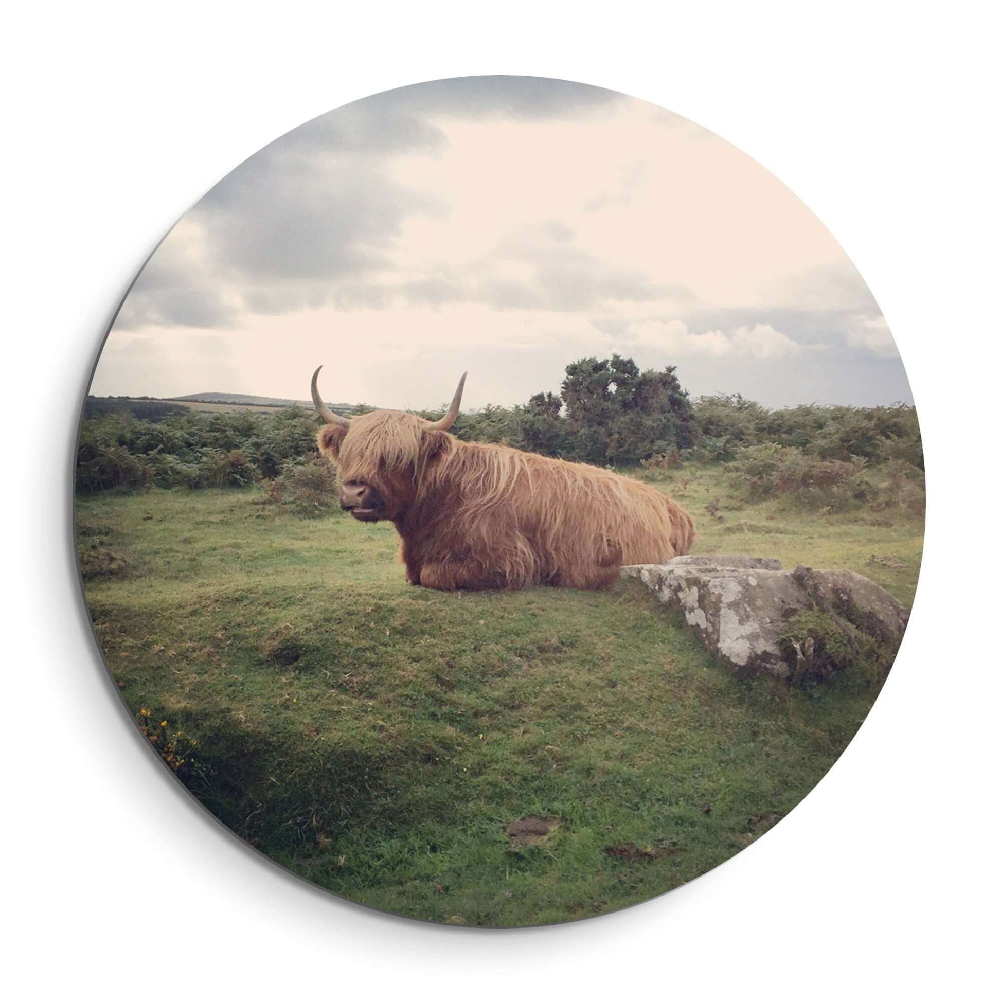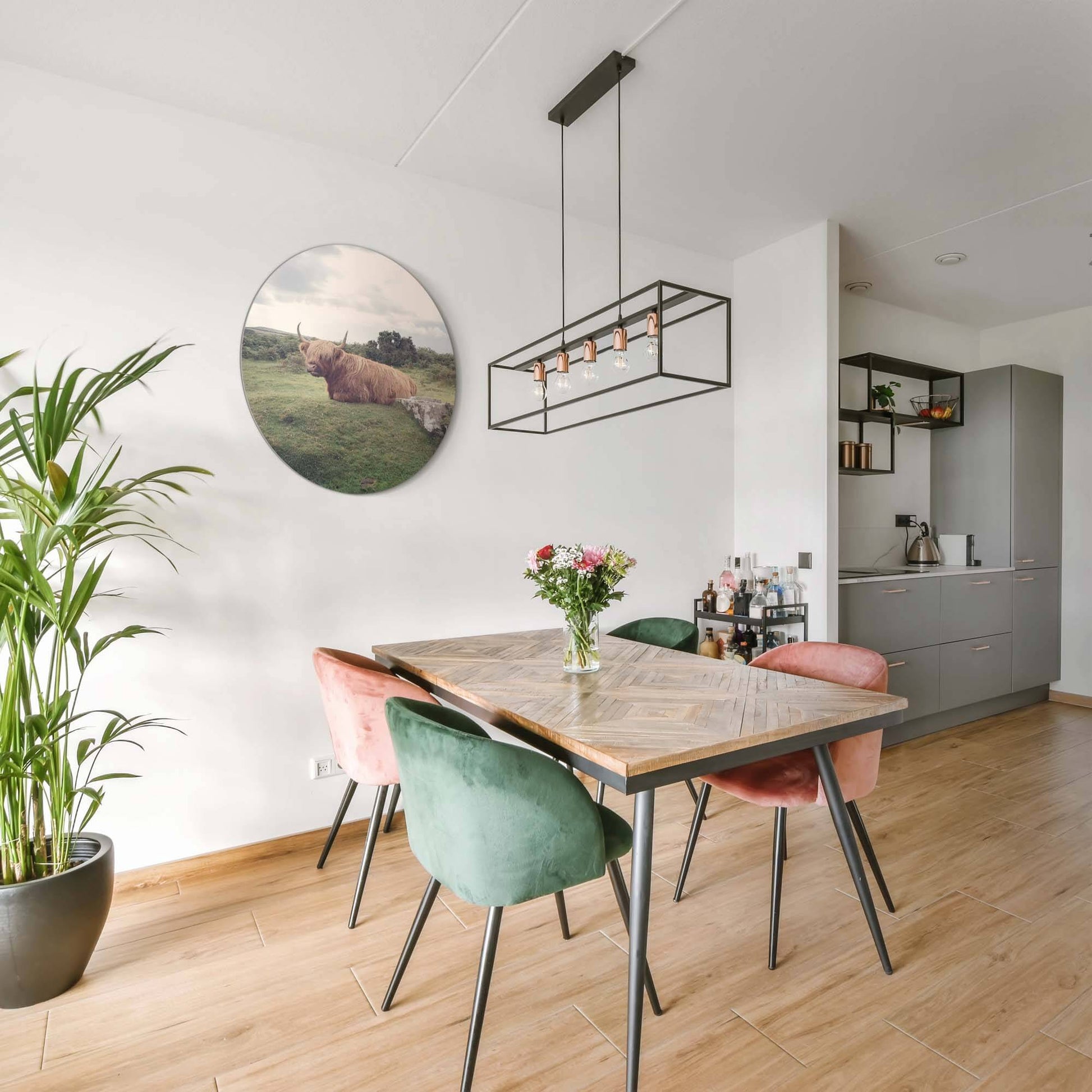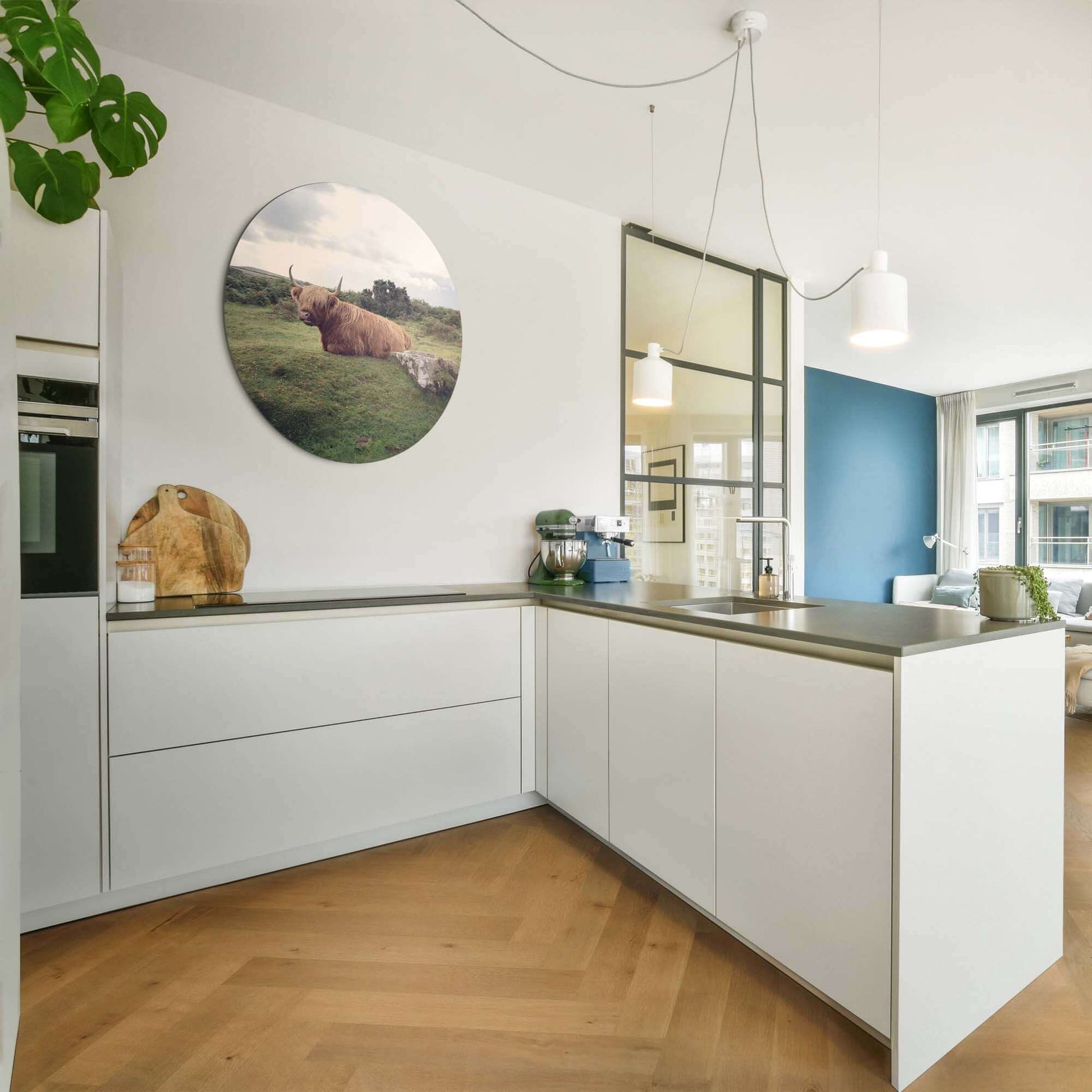 Een serene muurcirkel met een Schotse hooglander die uitrust in het groene veld. De matte print op 3 mm dik aluminium dibond straalt rust, warmte en natuurlijke schoonheid uit. Stijlvol, duurzaam en eenvoudig schoon te maken.