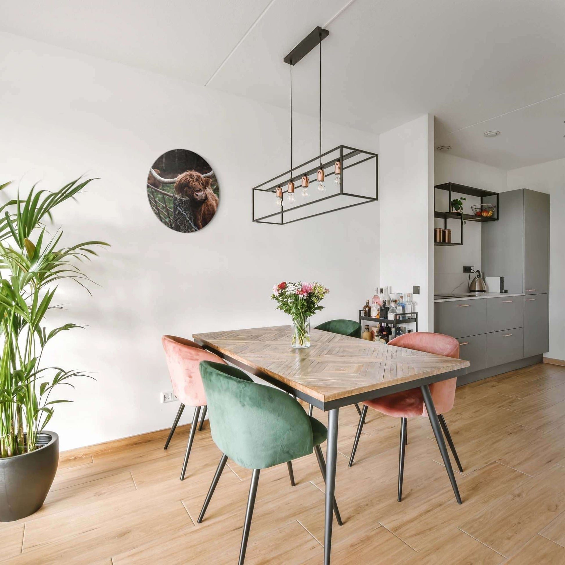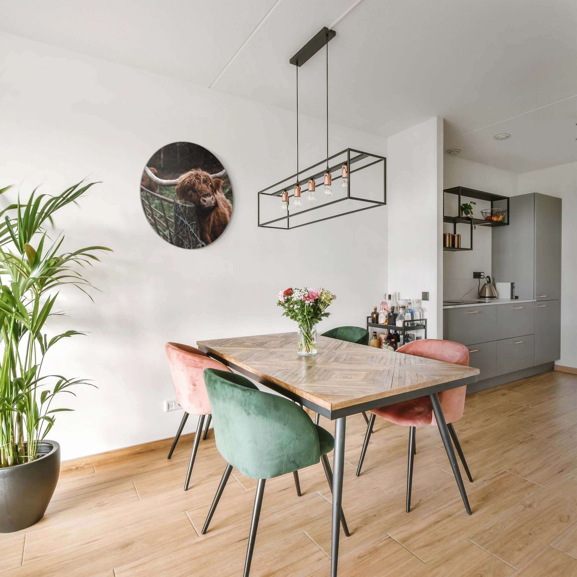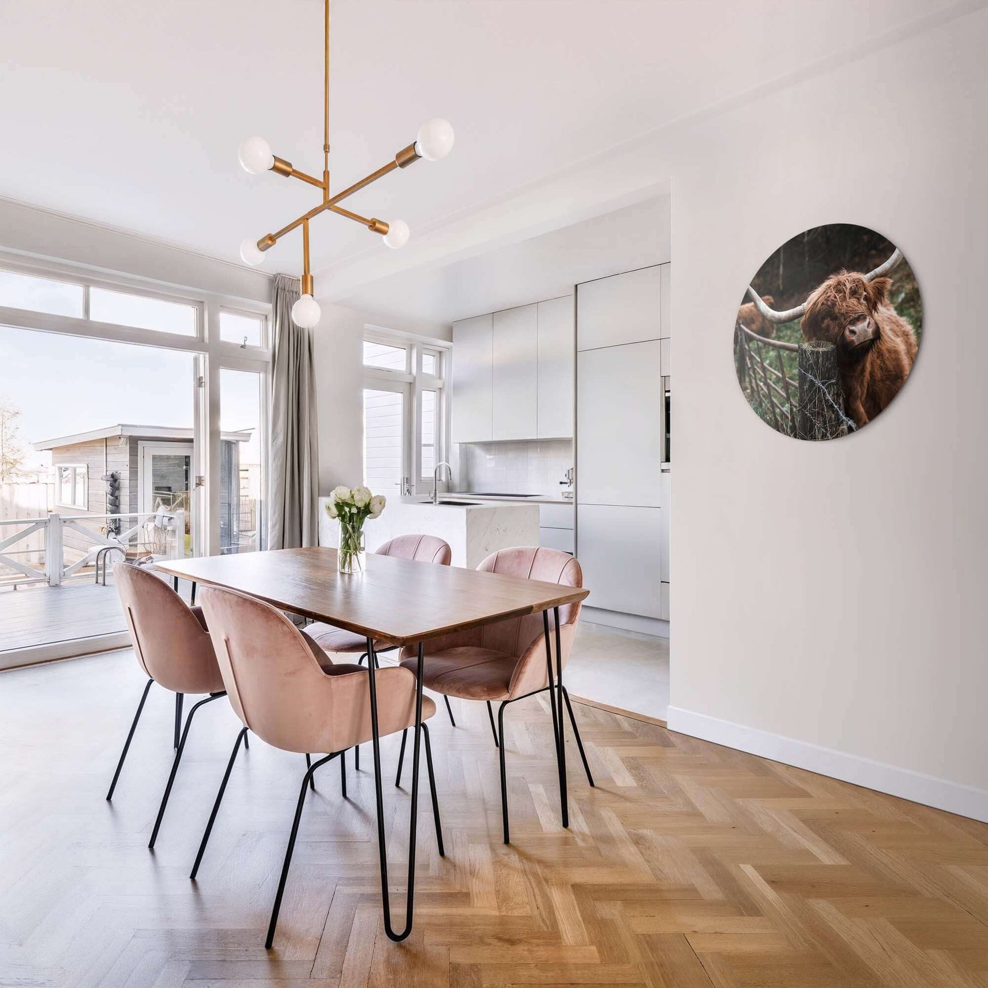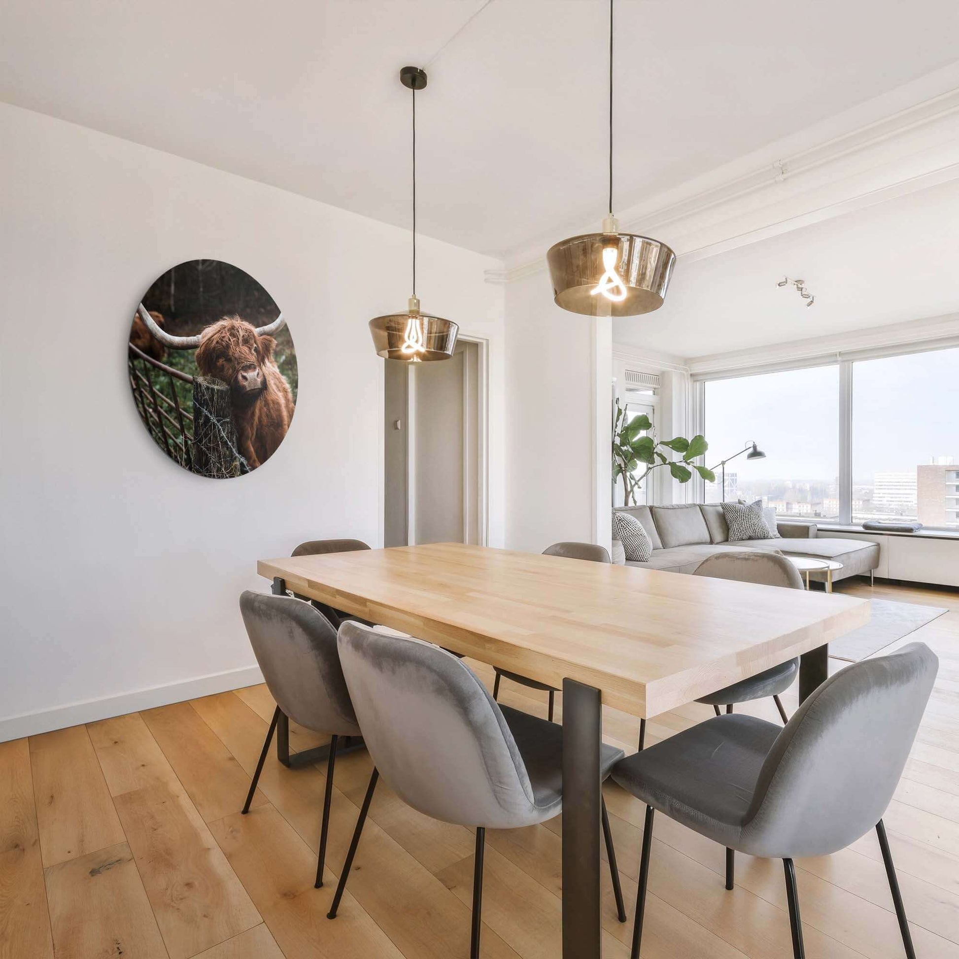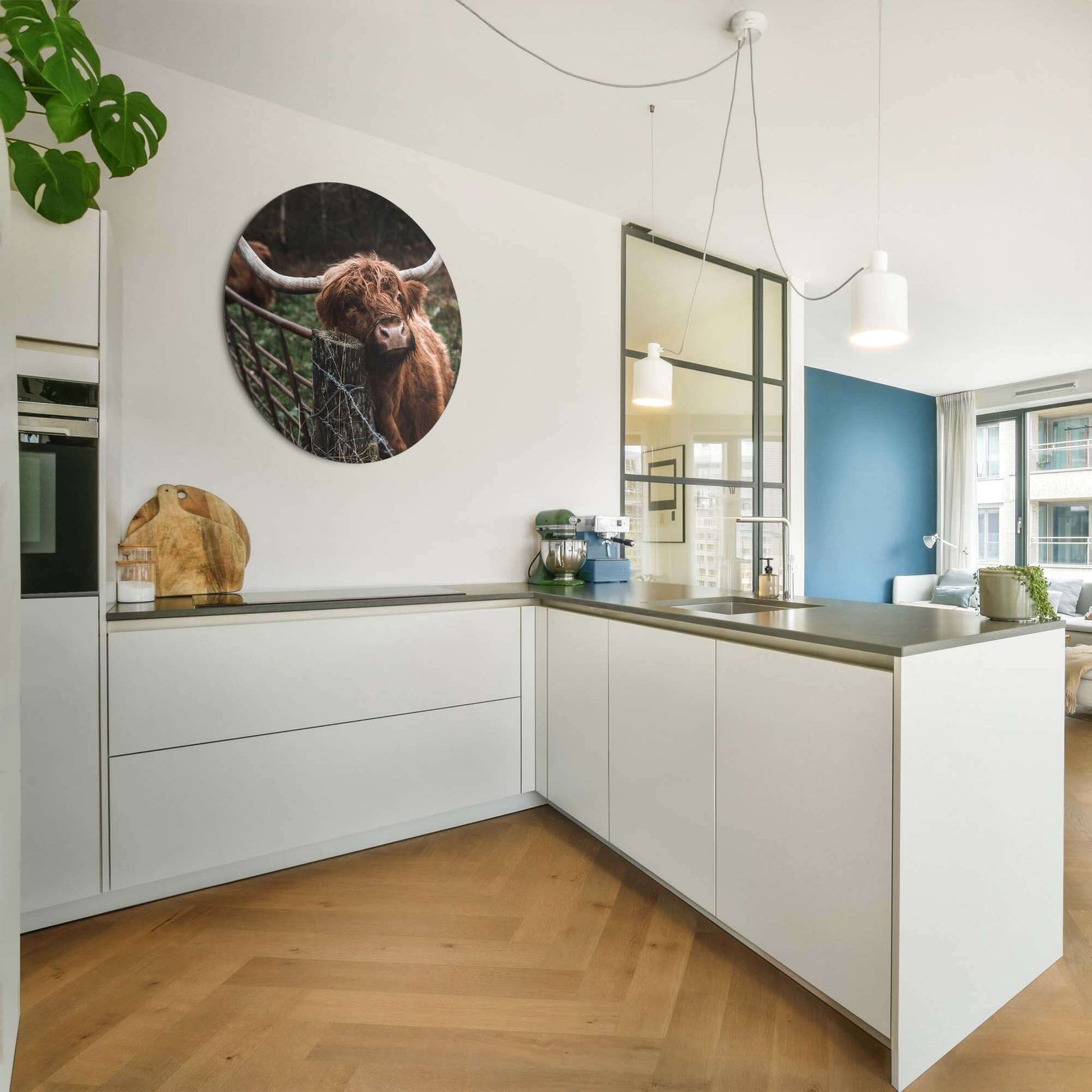 Een sfeervolle muurcirkel met een nieuwsgierige Schotse hooglander die zijn kop leunt tegen een houten hek. De haarscherpe print op 3 mm dik aluminium dibond geeft je keuken, eetkamer of woonkamer een warme, natuurlijke uitstraling.