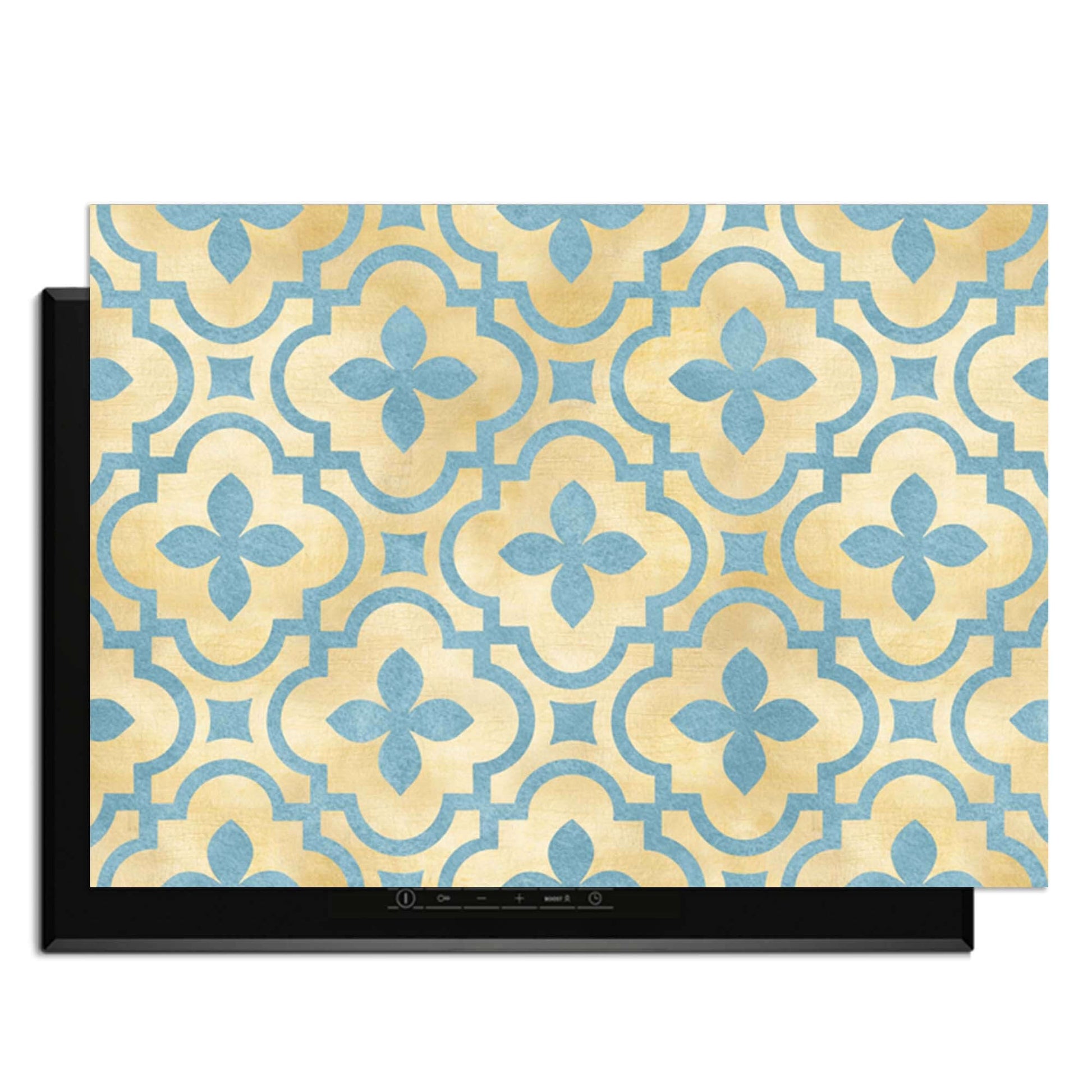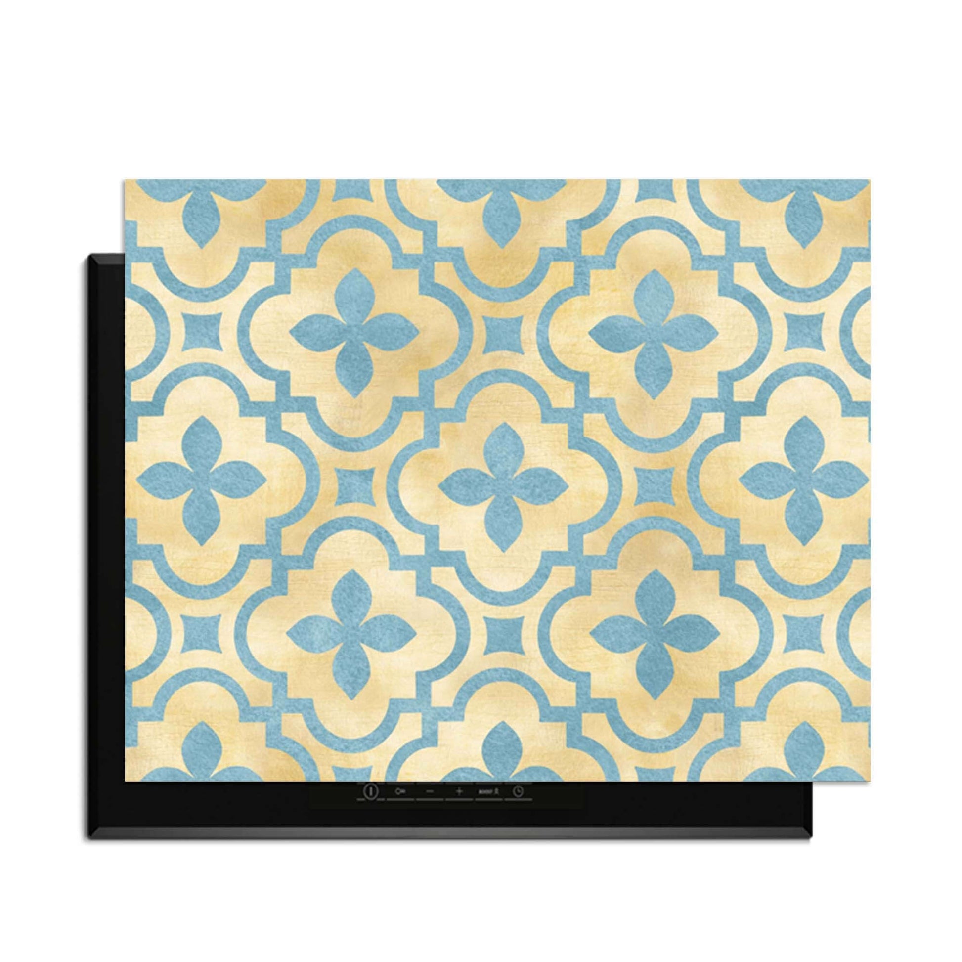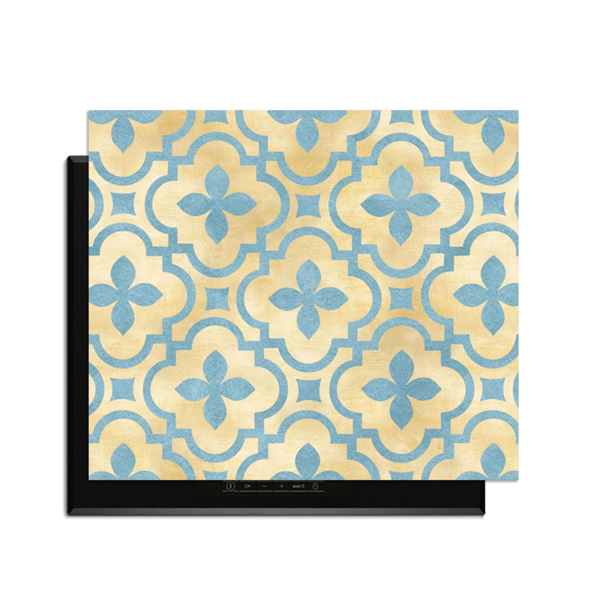 De Soft Azure Blossom inductiebeschermer combineert warme goudtinten met zacht azuurblauw in een elegant tegelmotief. Een serene en stijlvolle toevoeging aan elke keuken.