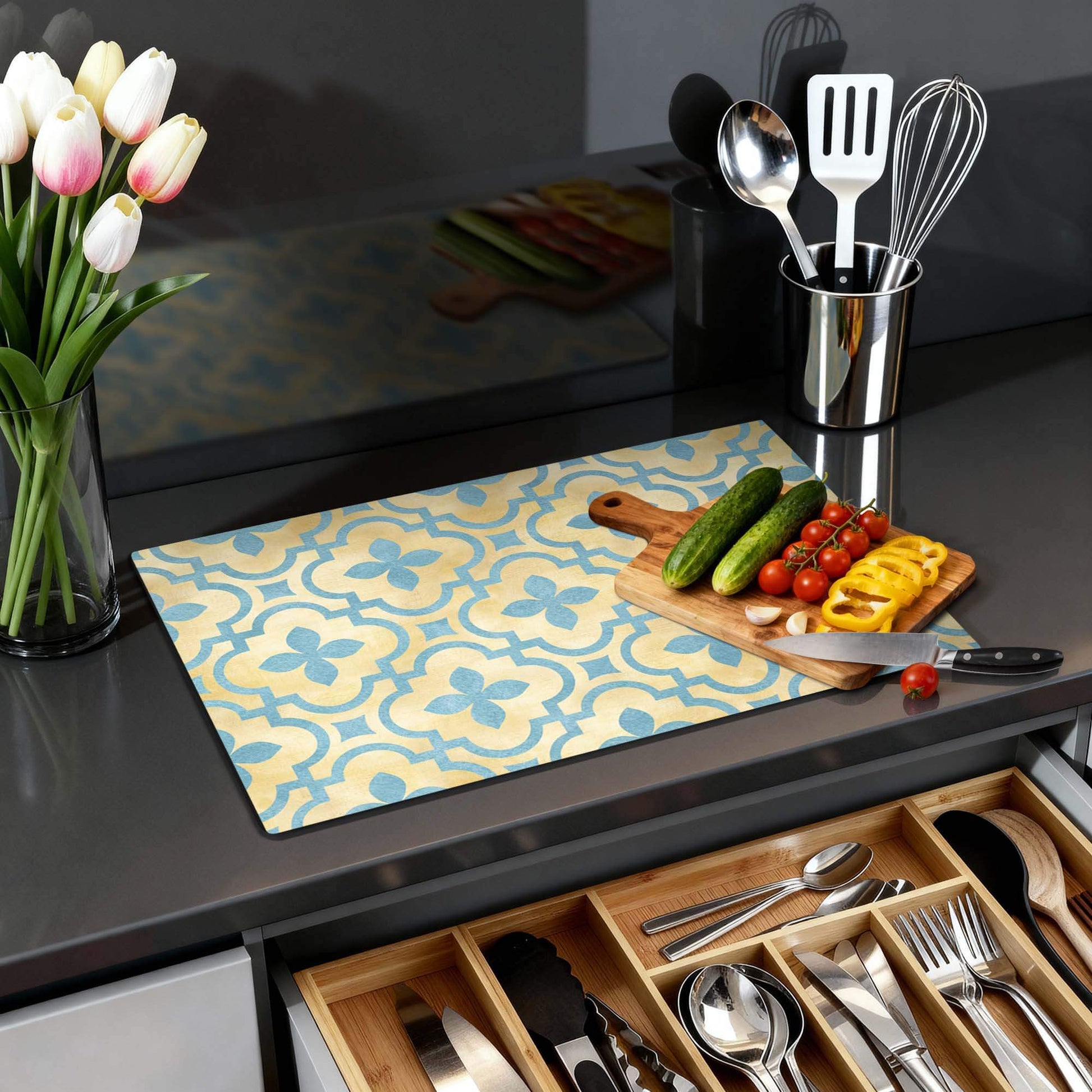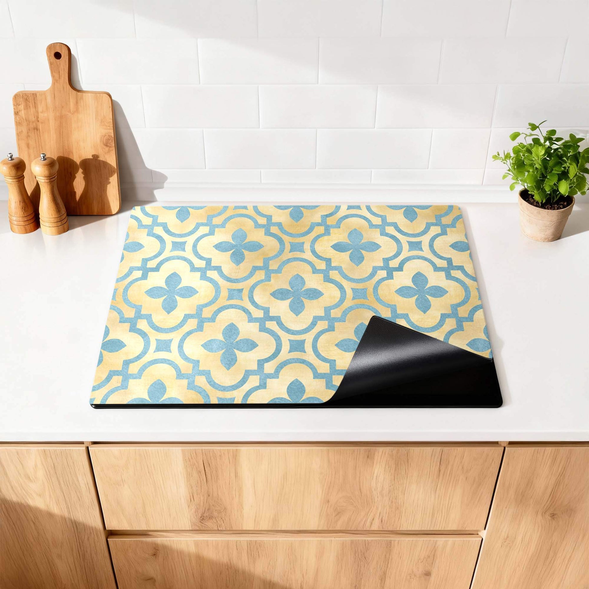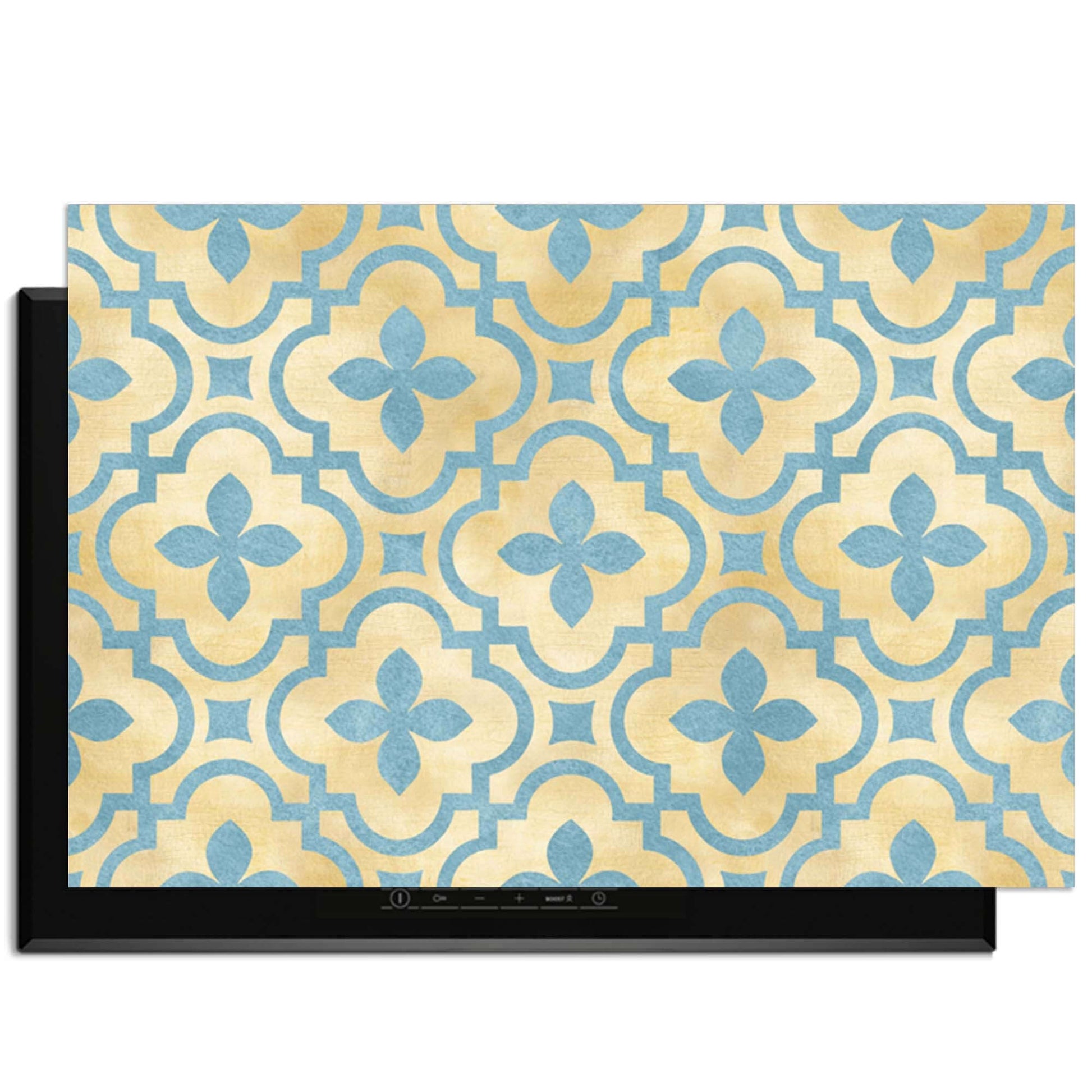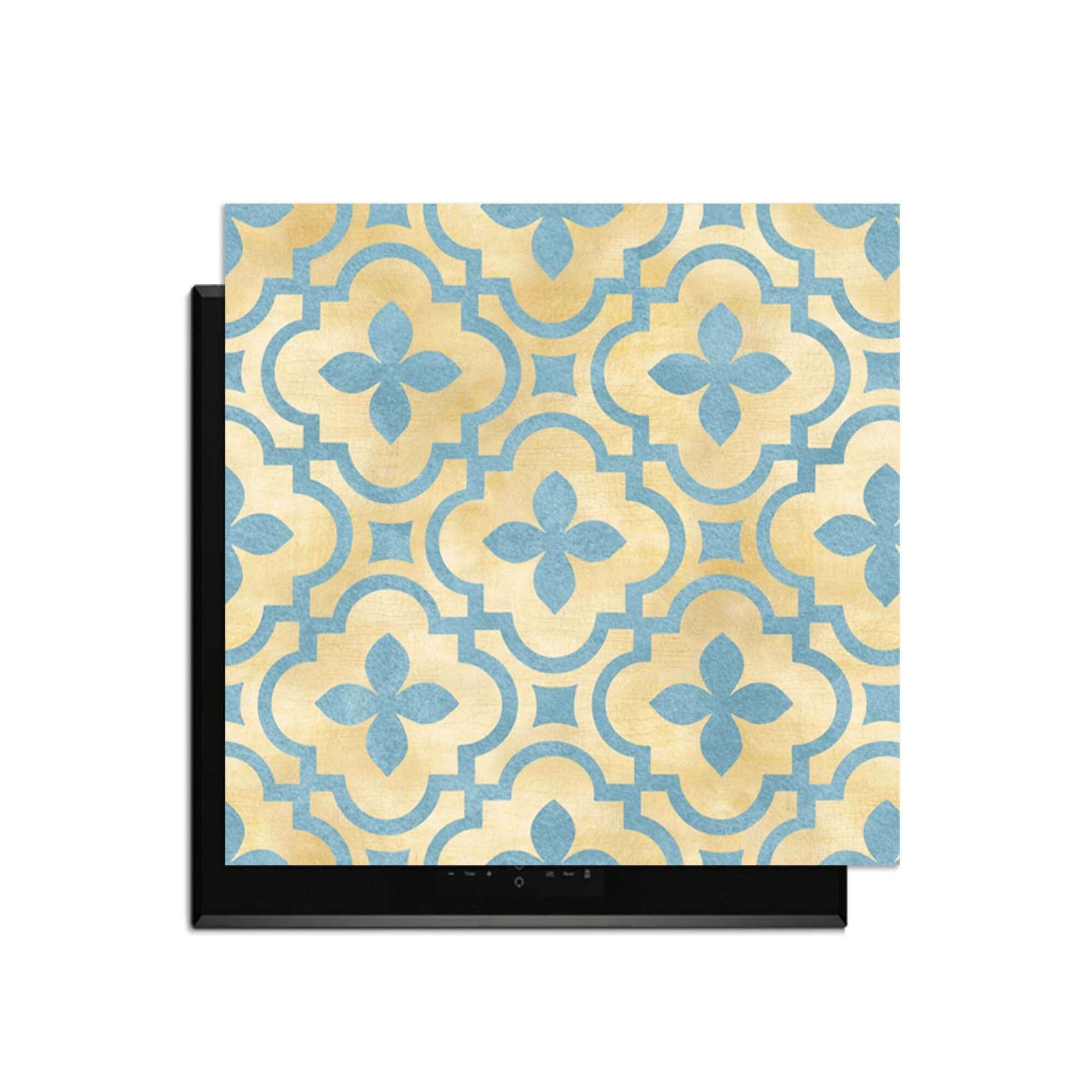 De Soft Azure Blossom inductiebeschermer combineert warme goudtinten met zacht azuurblauw in een elegant tegelmotief. Een serene en stijlvolle toevoeging aan elke keuken.