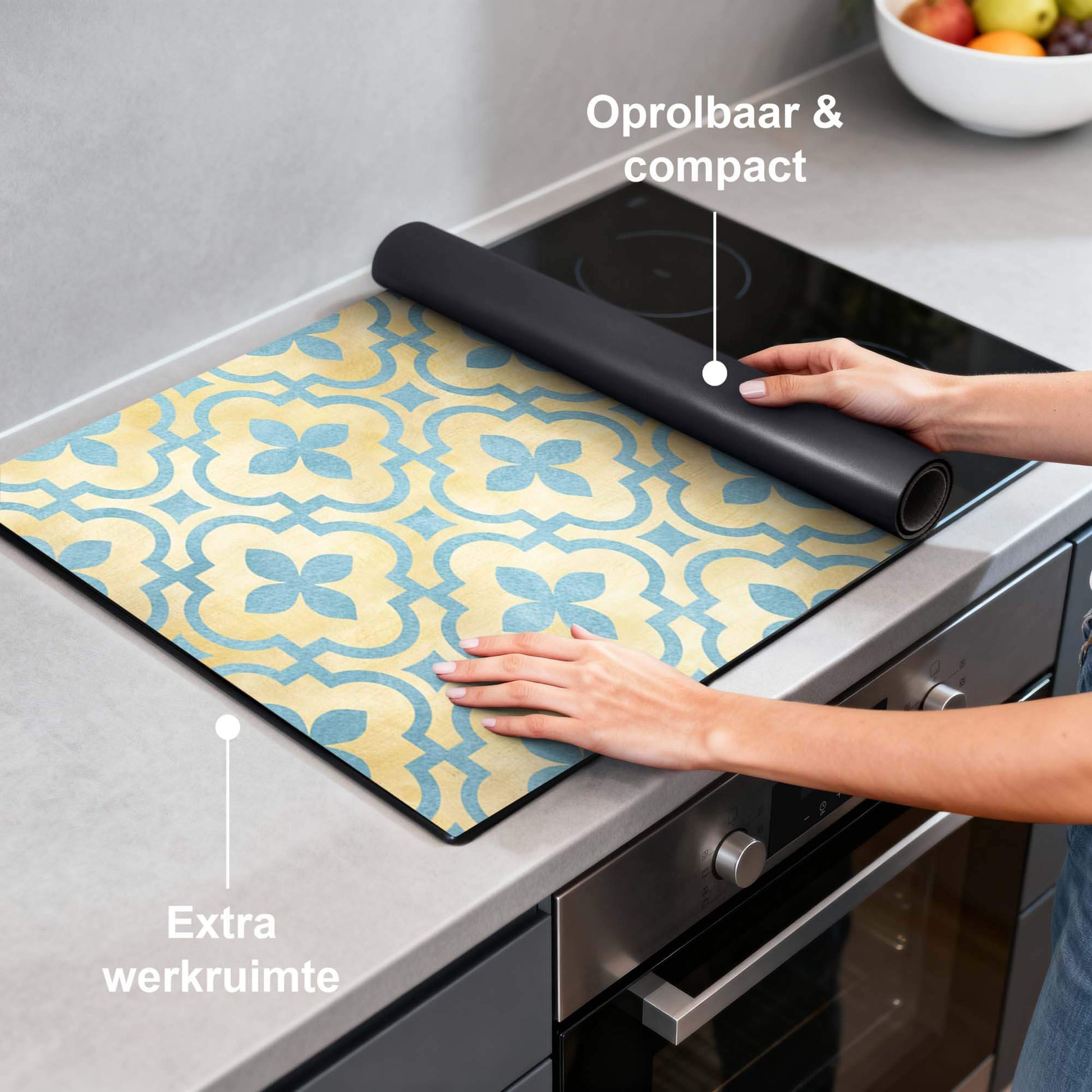De zwarte onderzijde heeft een licht antislip-effect waardoor de beschermer goed op z’n plek blijft liggen. Daarnaast is het materiaal brandvertragend (B1-gecertificeerd), wat zorgt voor extra veiligheid in de keuken.