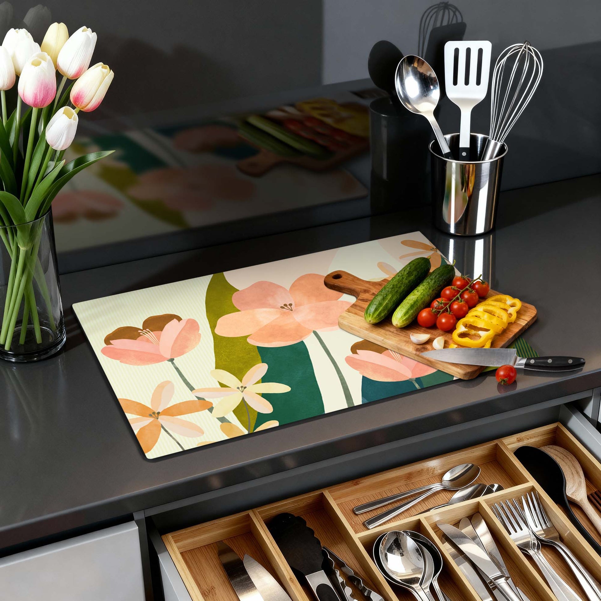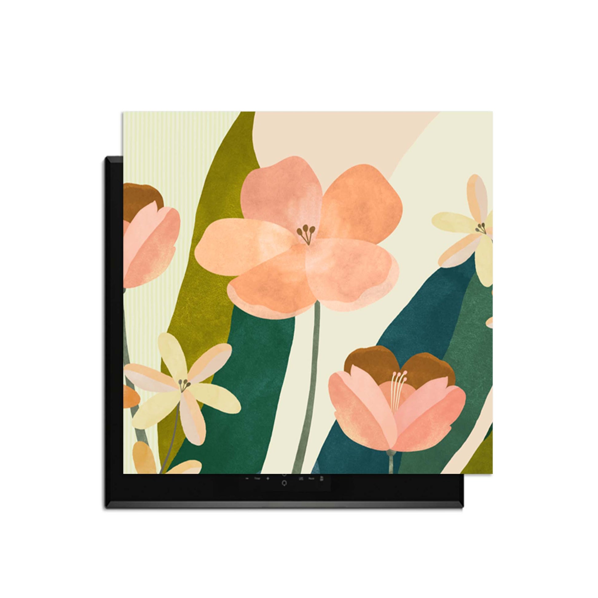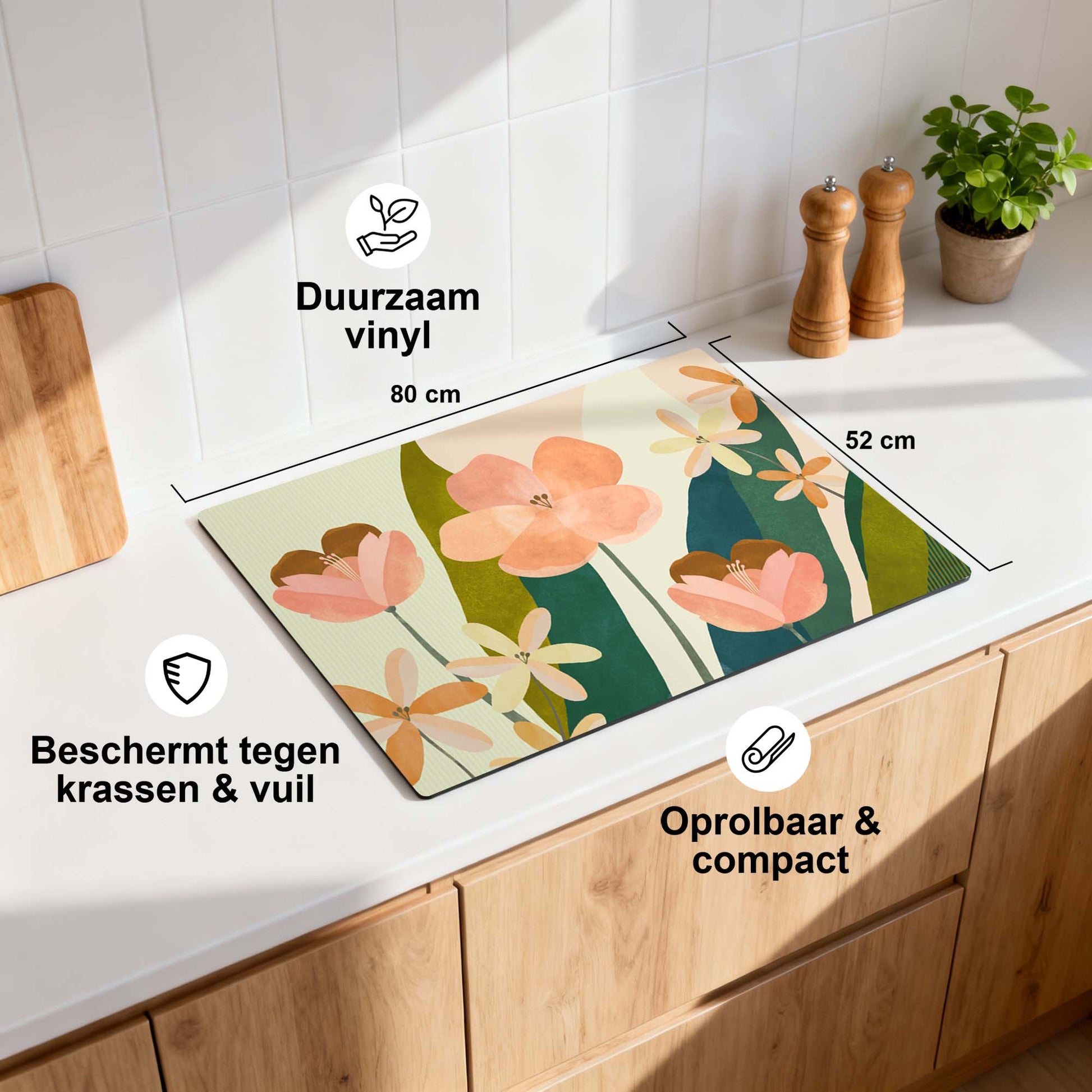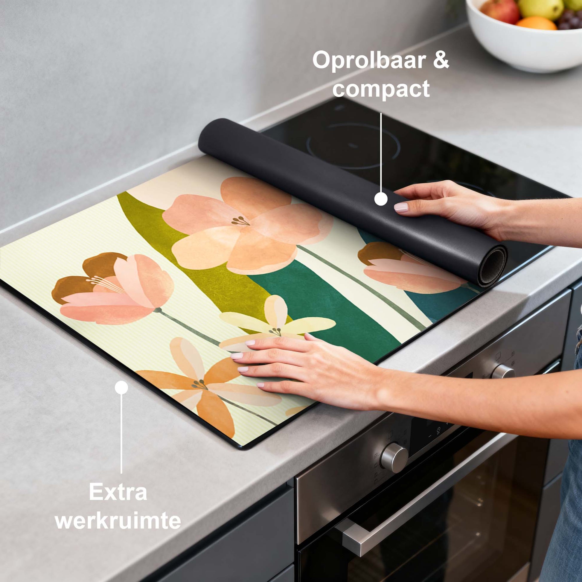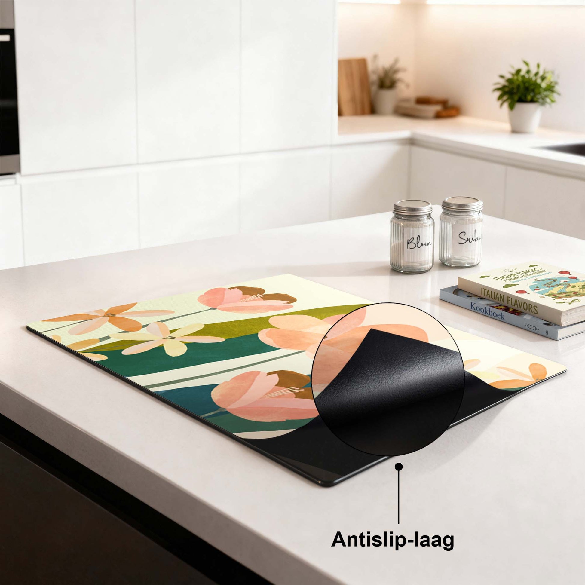 Soft Petals brengt een zachte, warme sfeer in je keuken. Perzik- en koraaltinten combineren met rijke groentinten tot een elegant botanisch design dat je inductieplaat mooi beschermt.