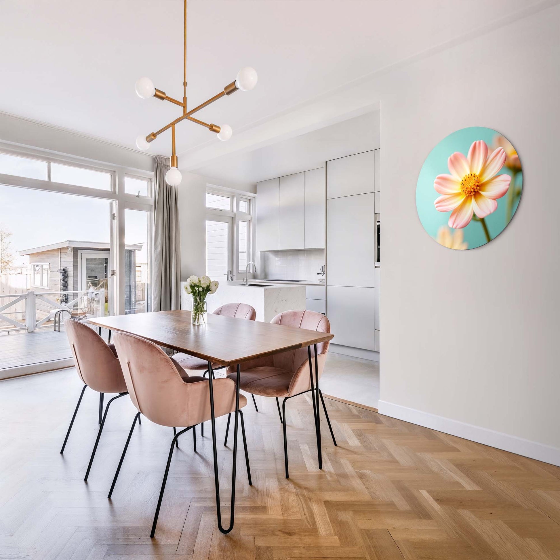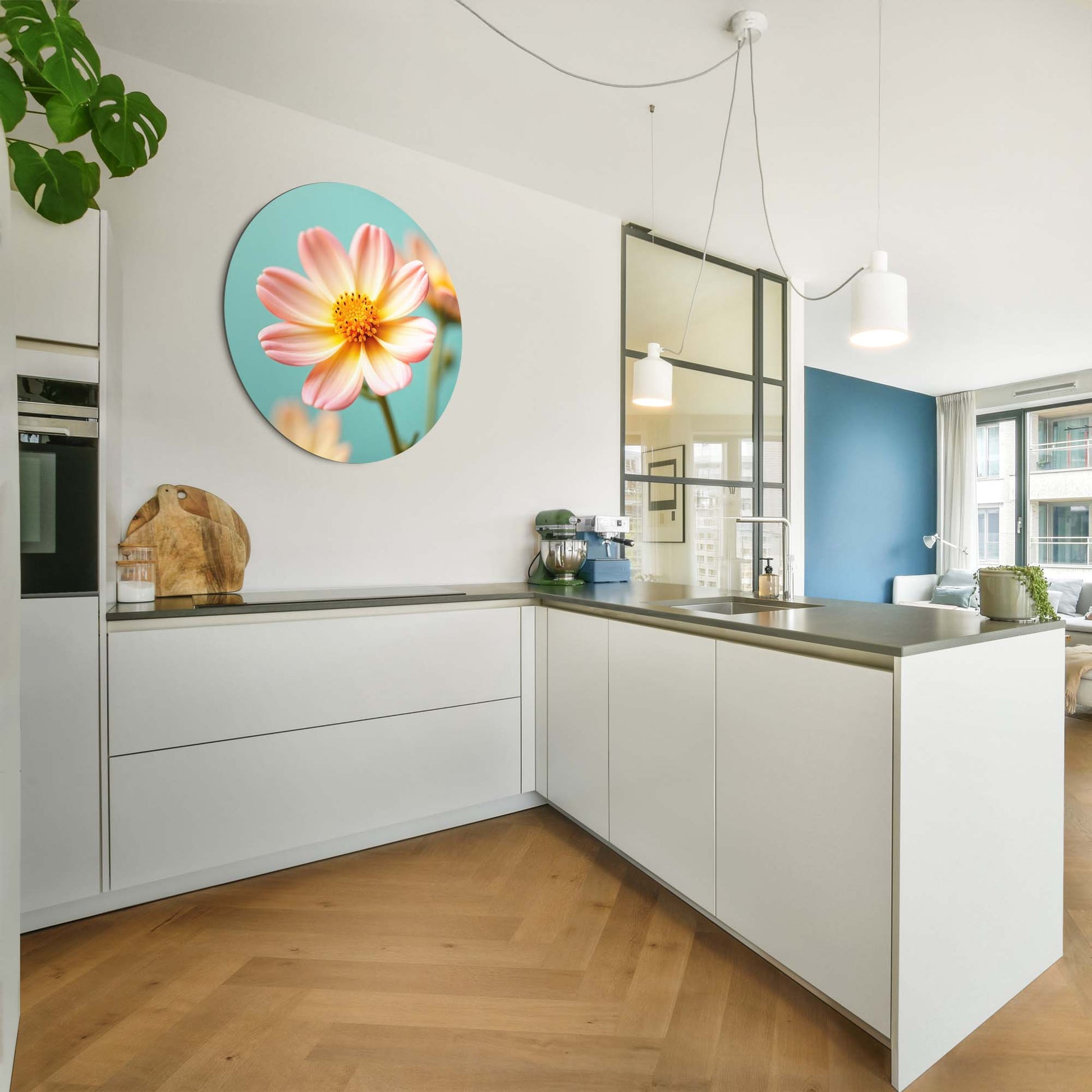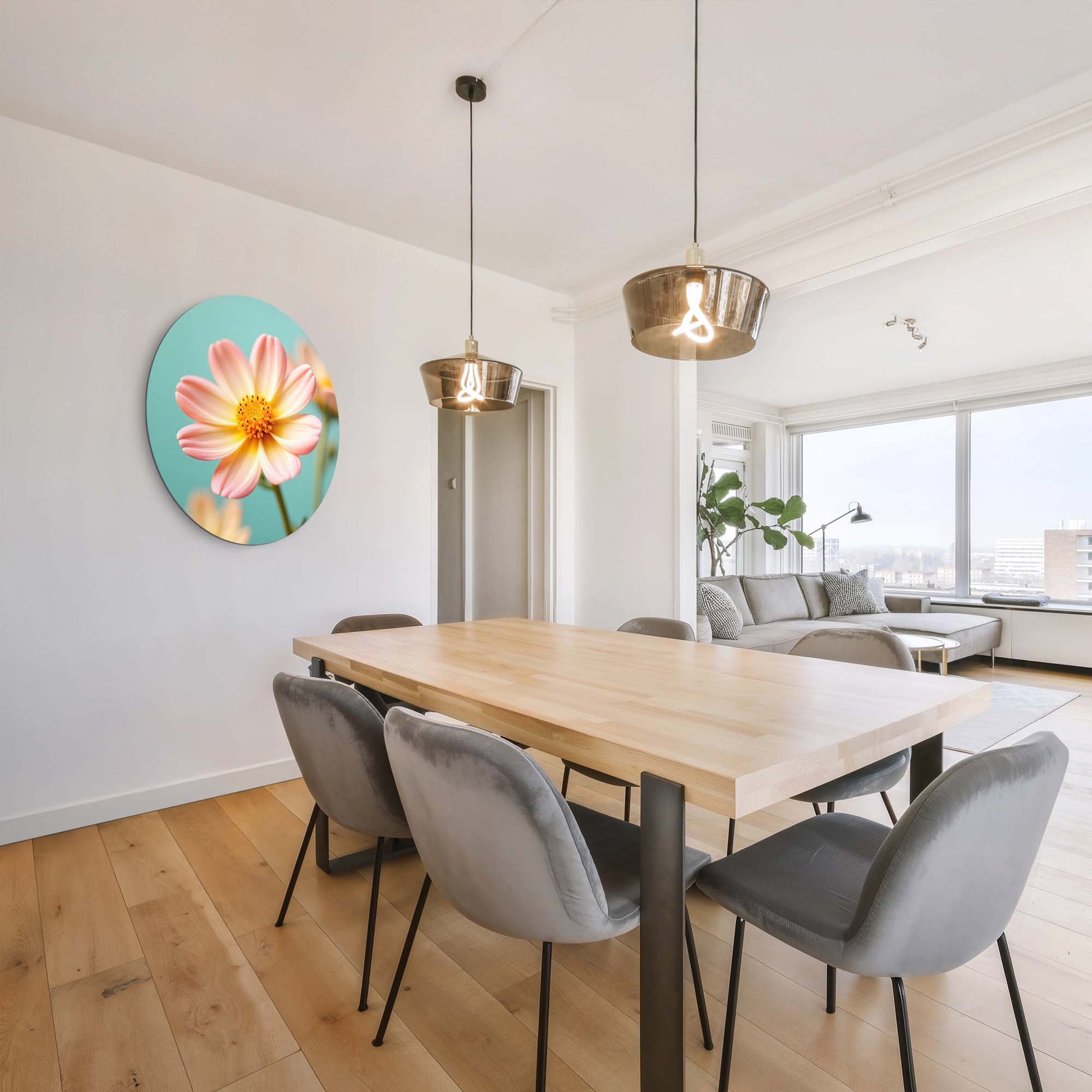 Een zachte bloem in tinten van perzik en geel tegen een turquoise achtergrond. De Soft Sunrise muurcirkel brengt warmte, licht en rust in elke ruimte.