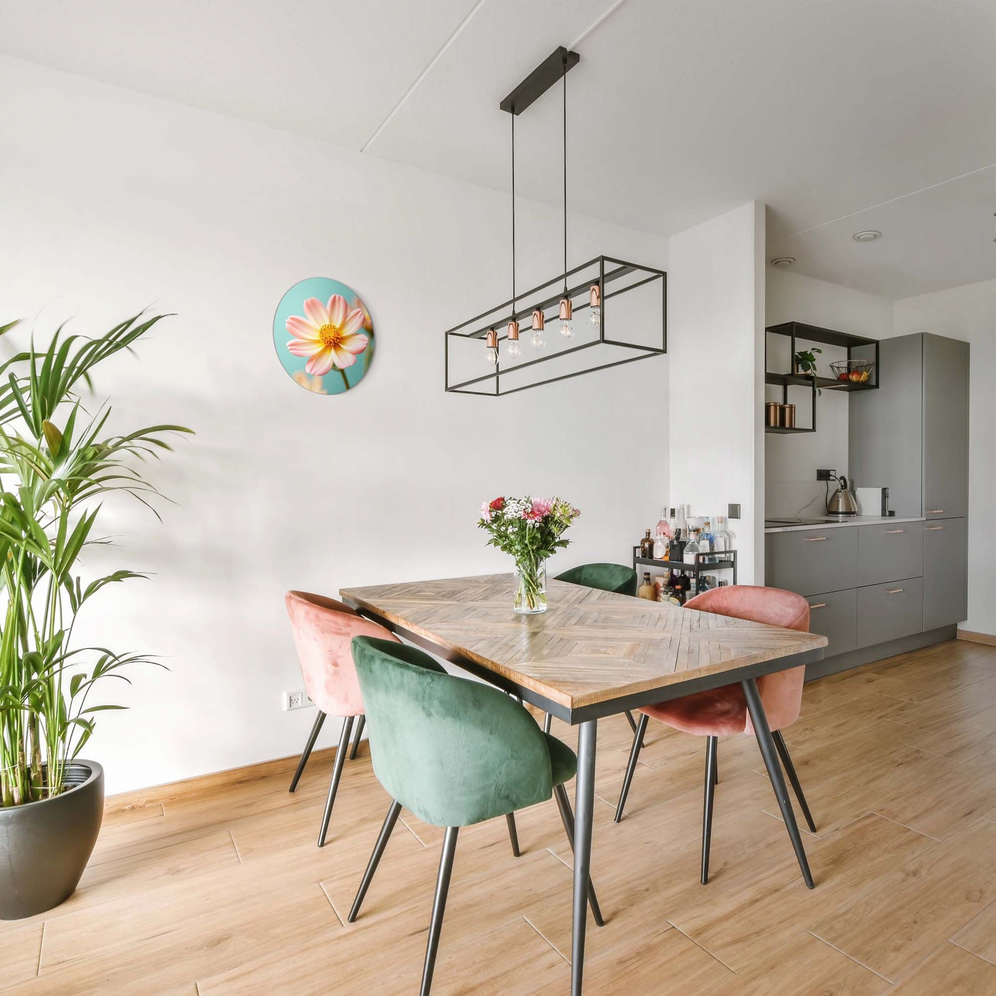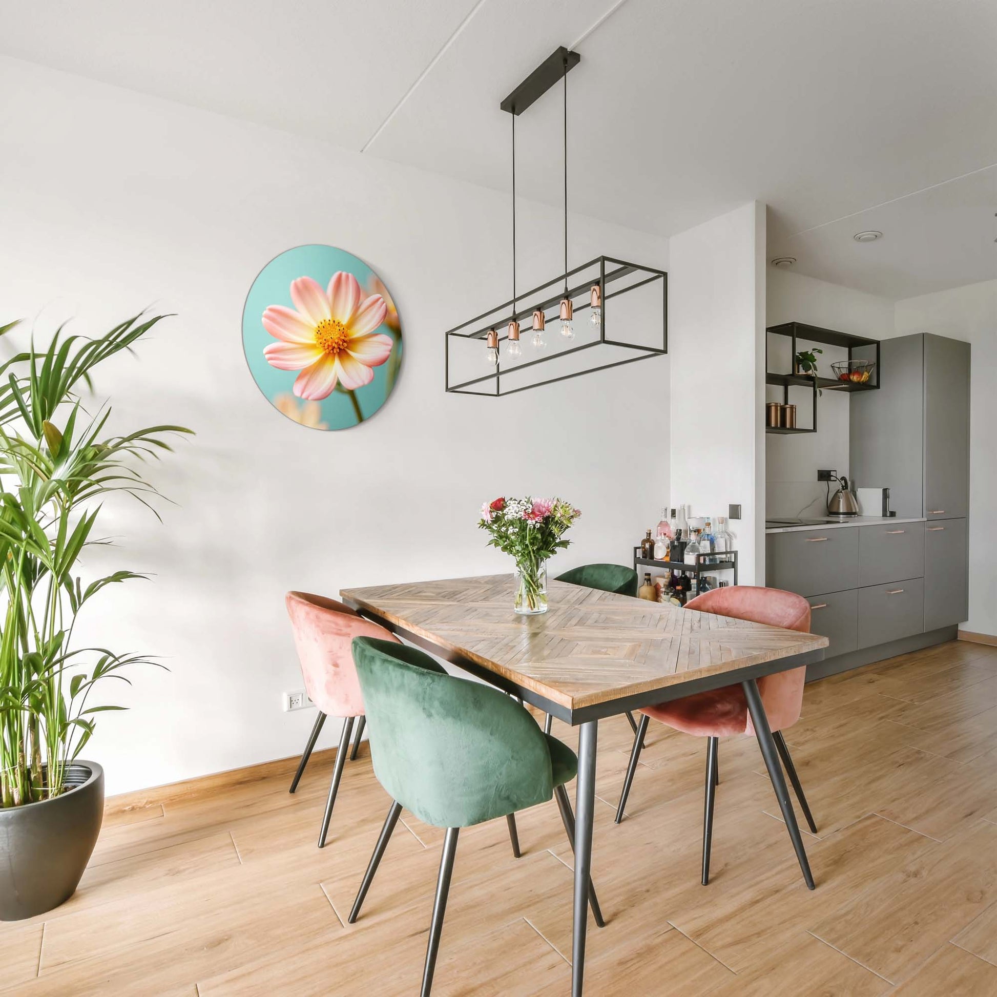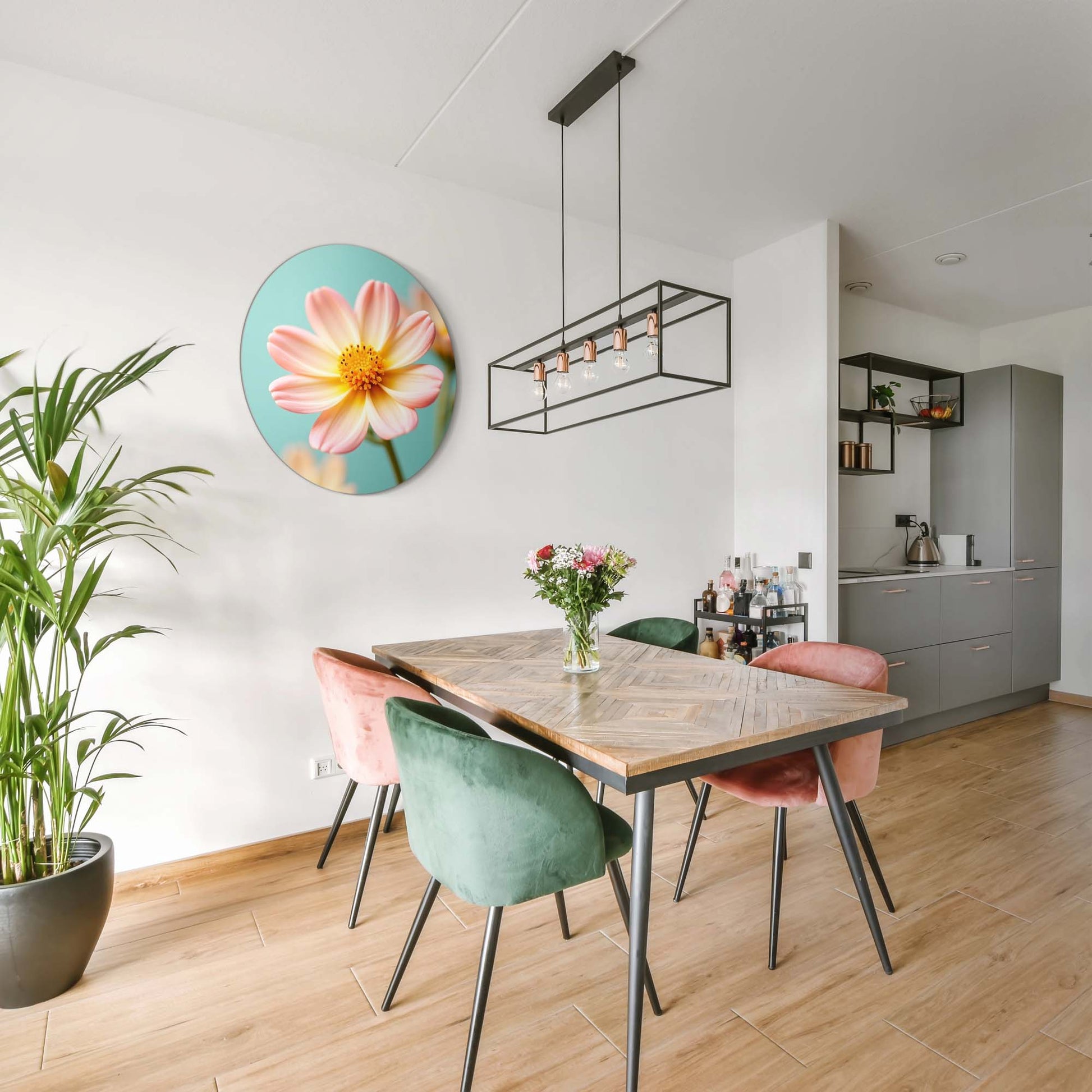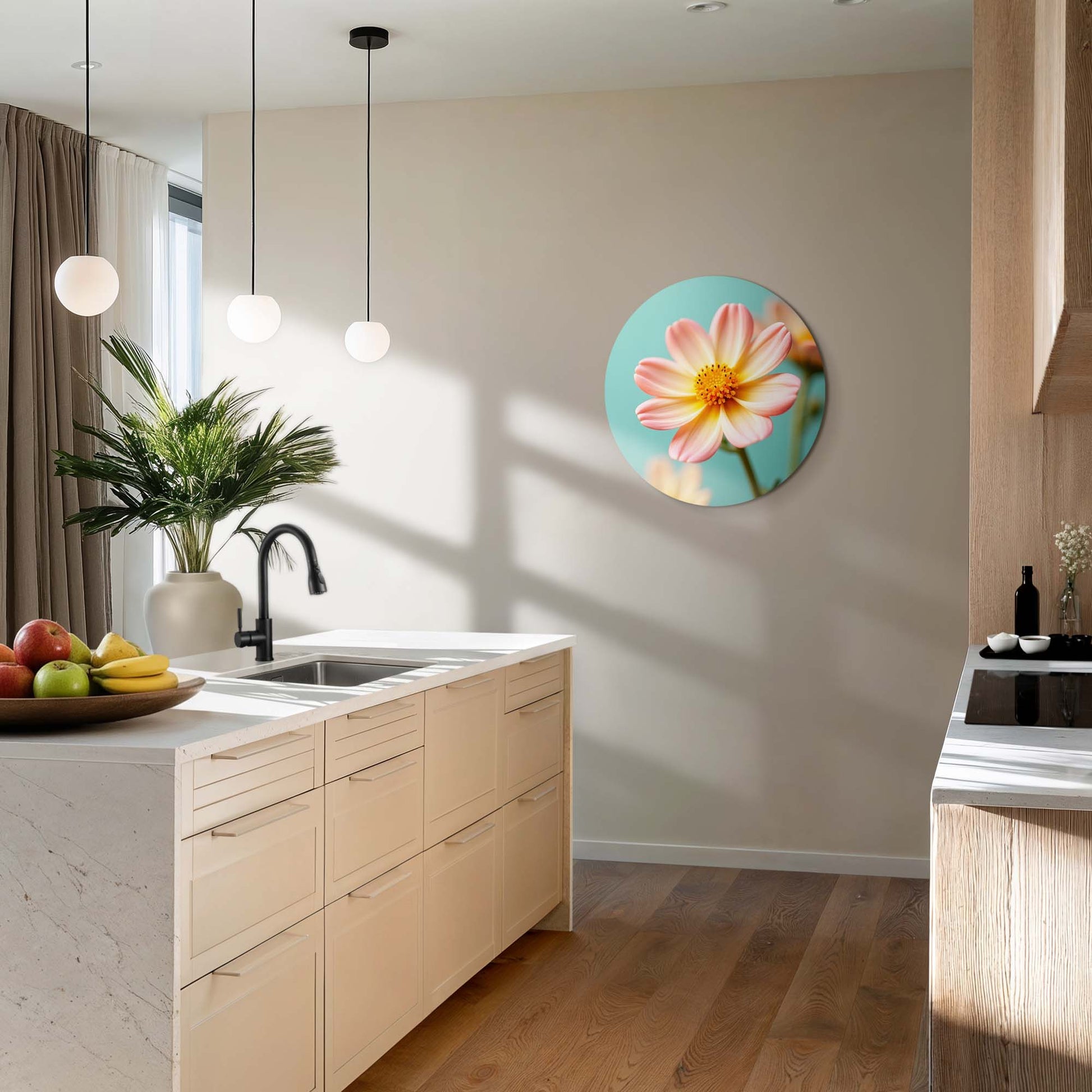 Een zachte bloem in tinten van perzik en geel tegen een turquoise achtergrond. De Soft Sunrise muurcirkel brengt warmte, licht en rust in elke ruimte.