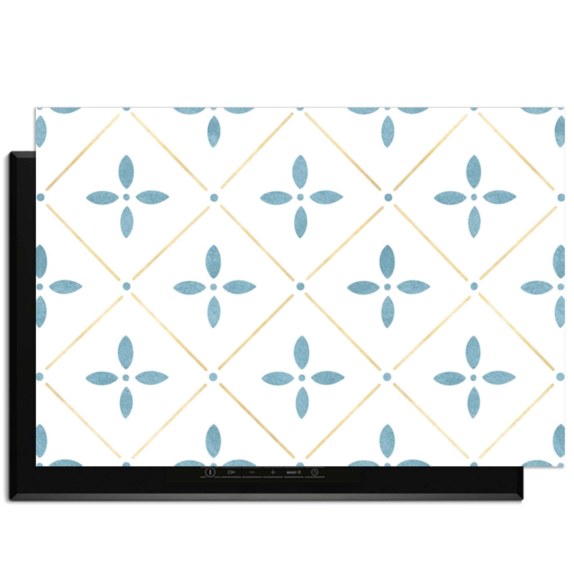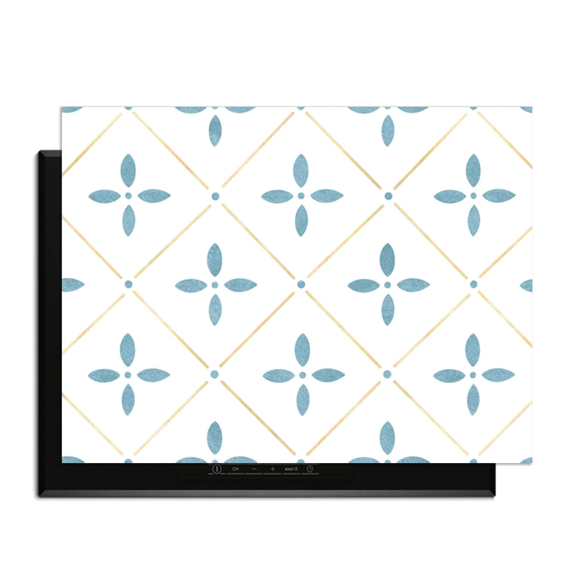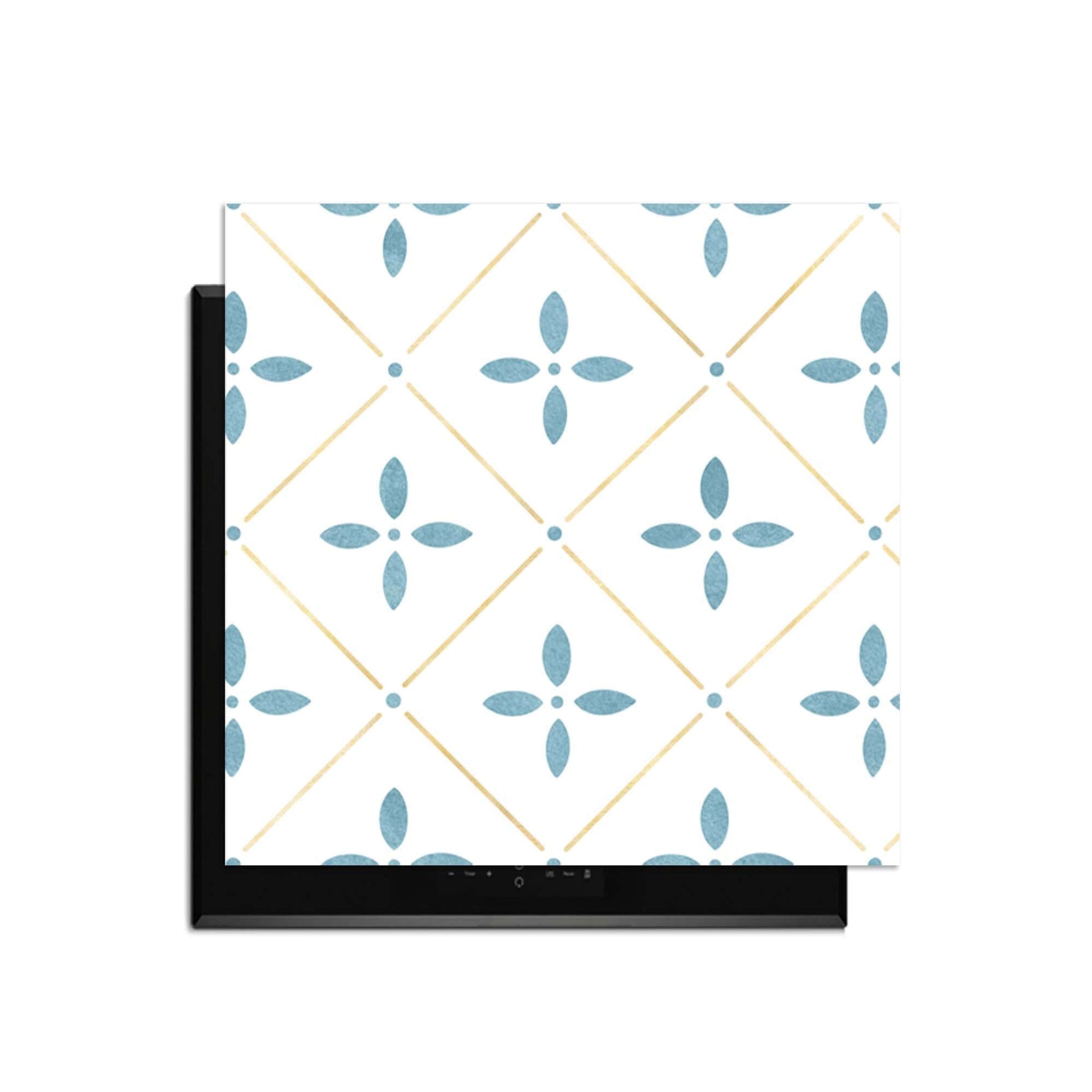 De Starline White Tile inductiebeschermer heeft een licht en fris tegelmotief met blauwe bloemdetails en gouden lijnen. Een elegante, rustige toevoeging aan elke keuken.