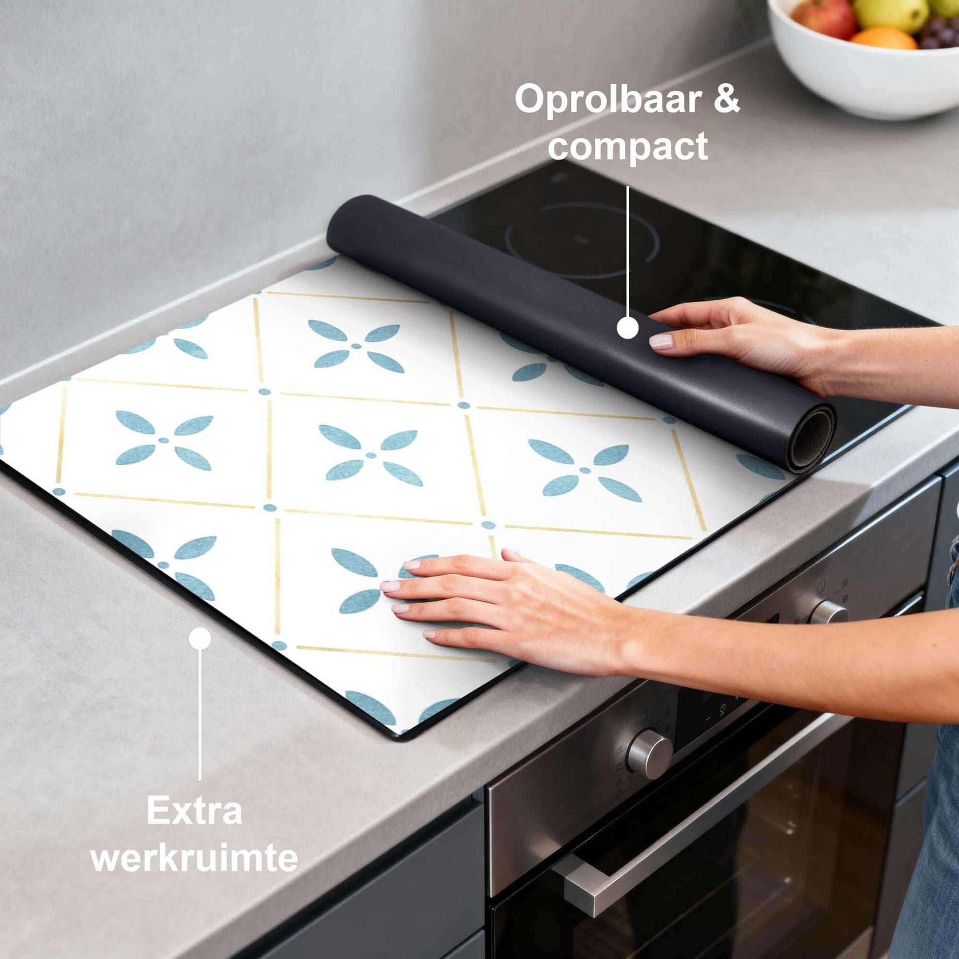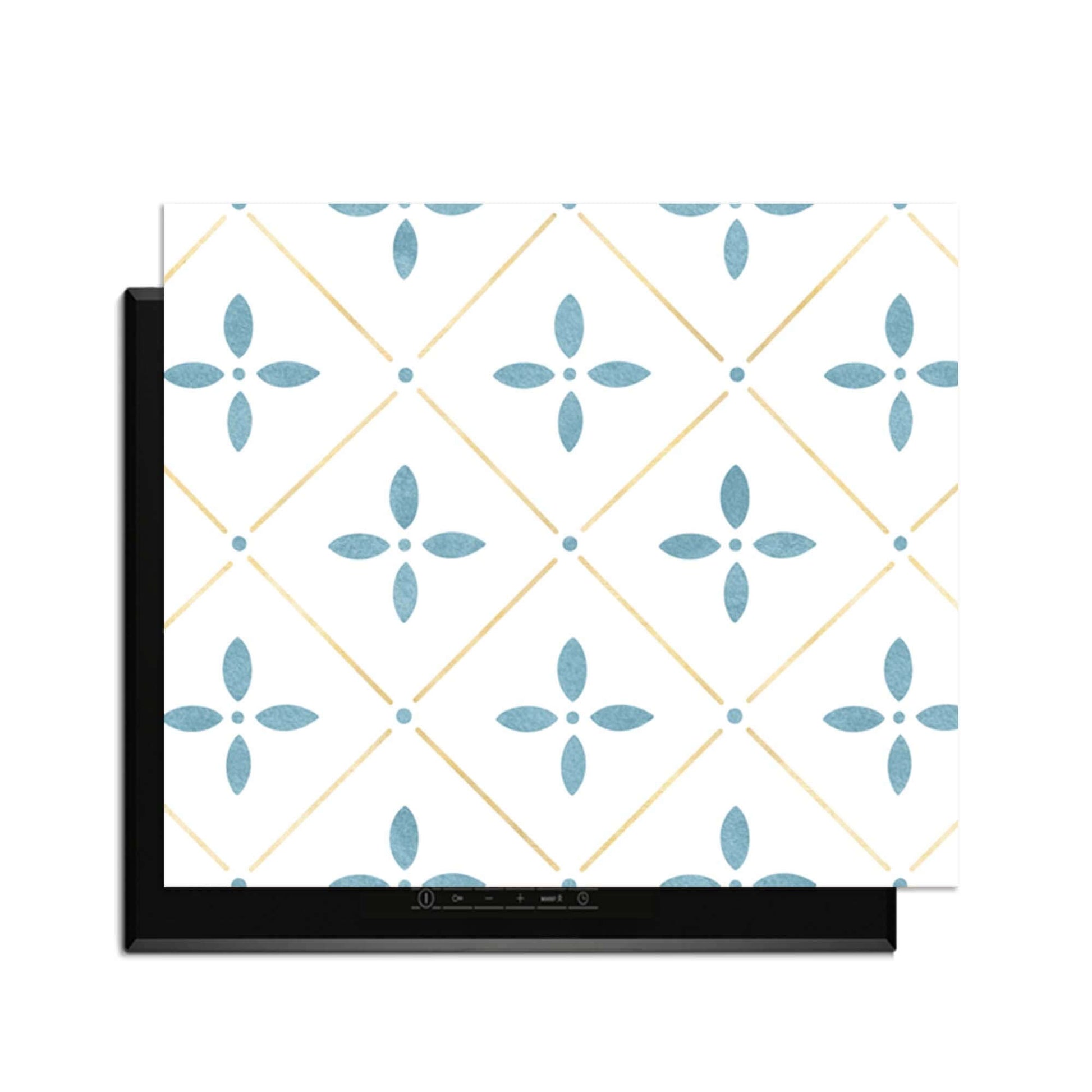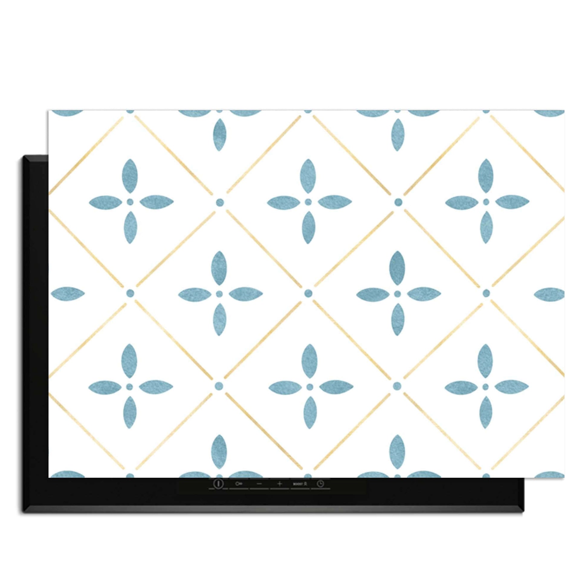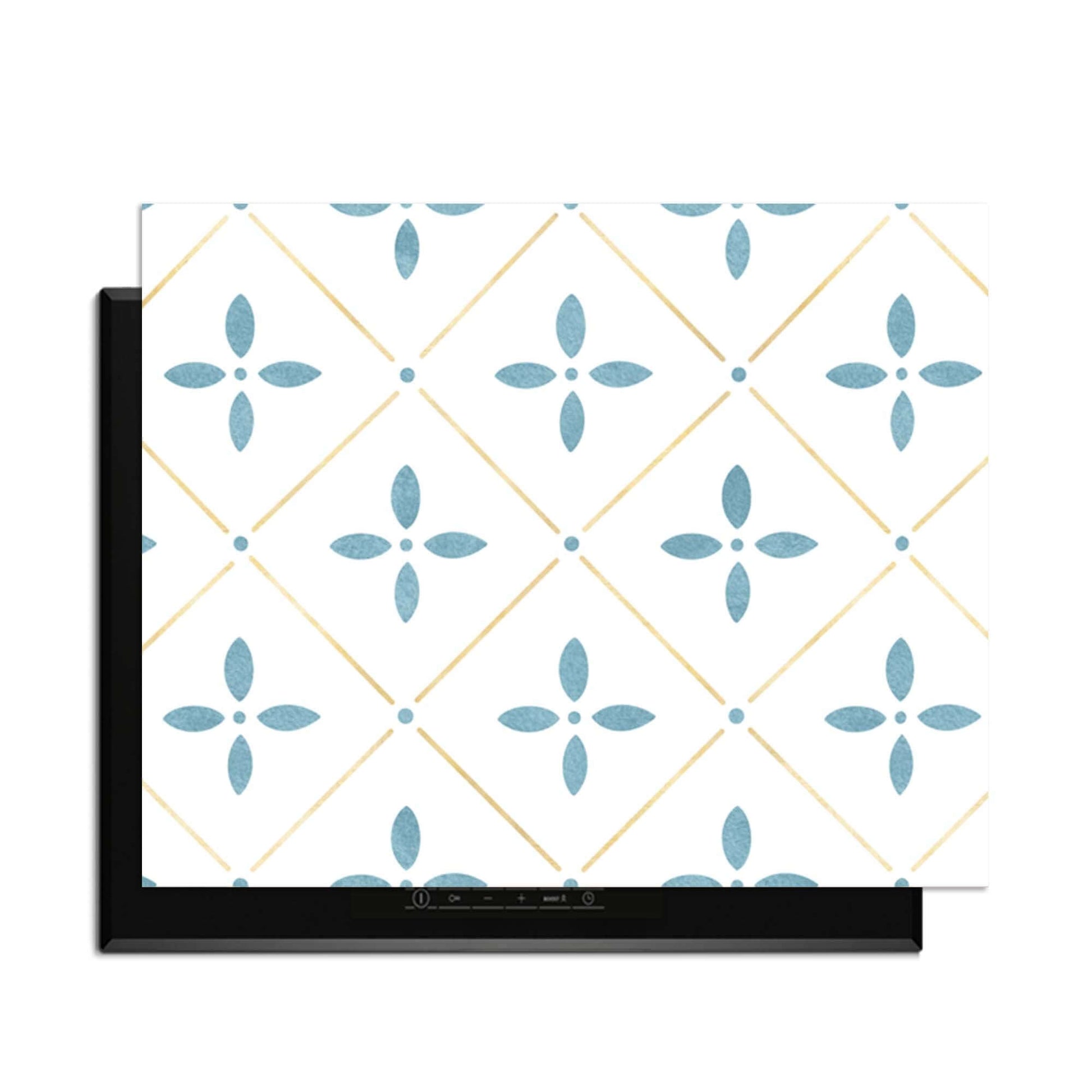 De Starline White Tile inductiebeschermer heeft een licht en fris tegelmotief met blauwe bloemdetails en gouden lijnen. Een elegante, rustige toevoeging aan elke keuken.