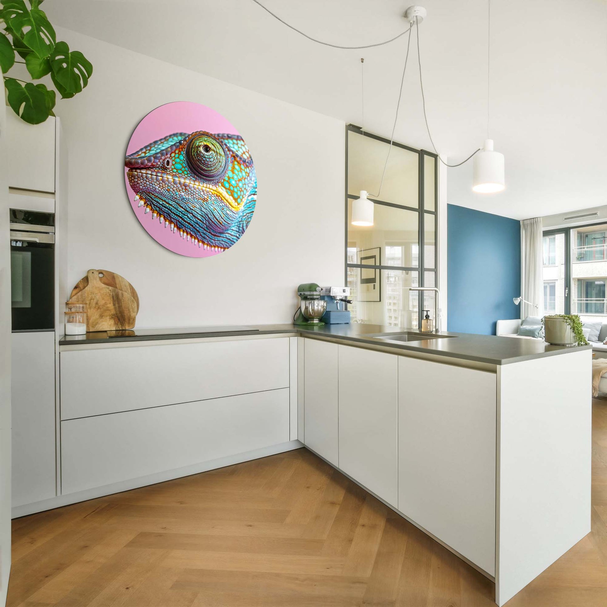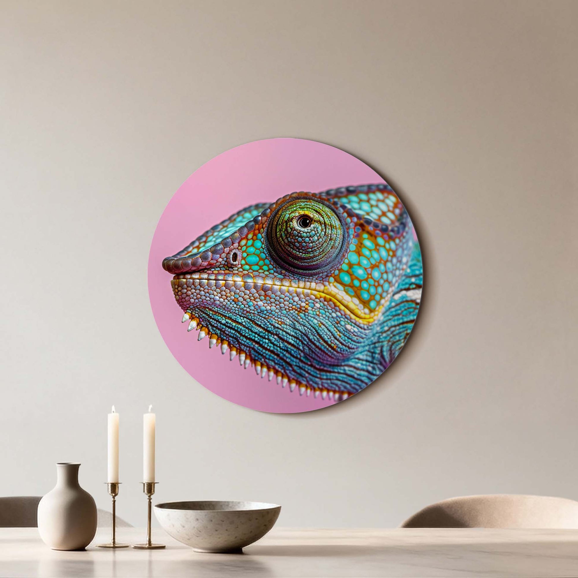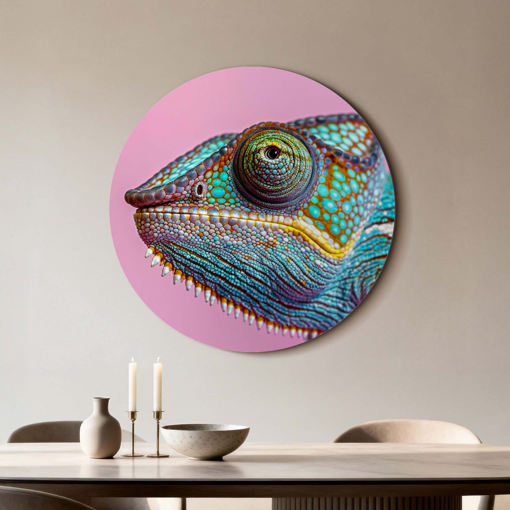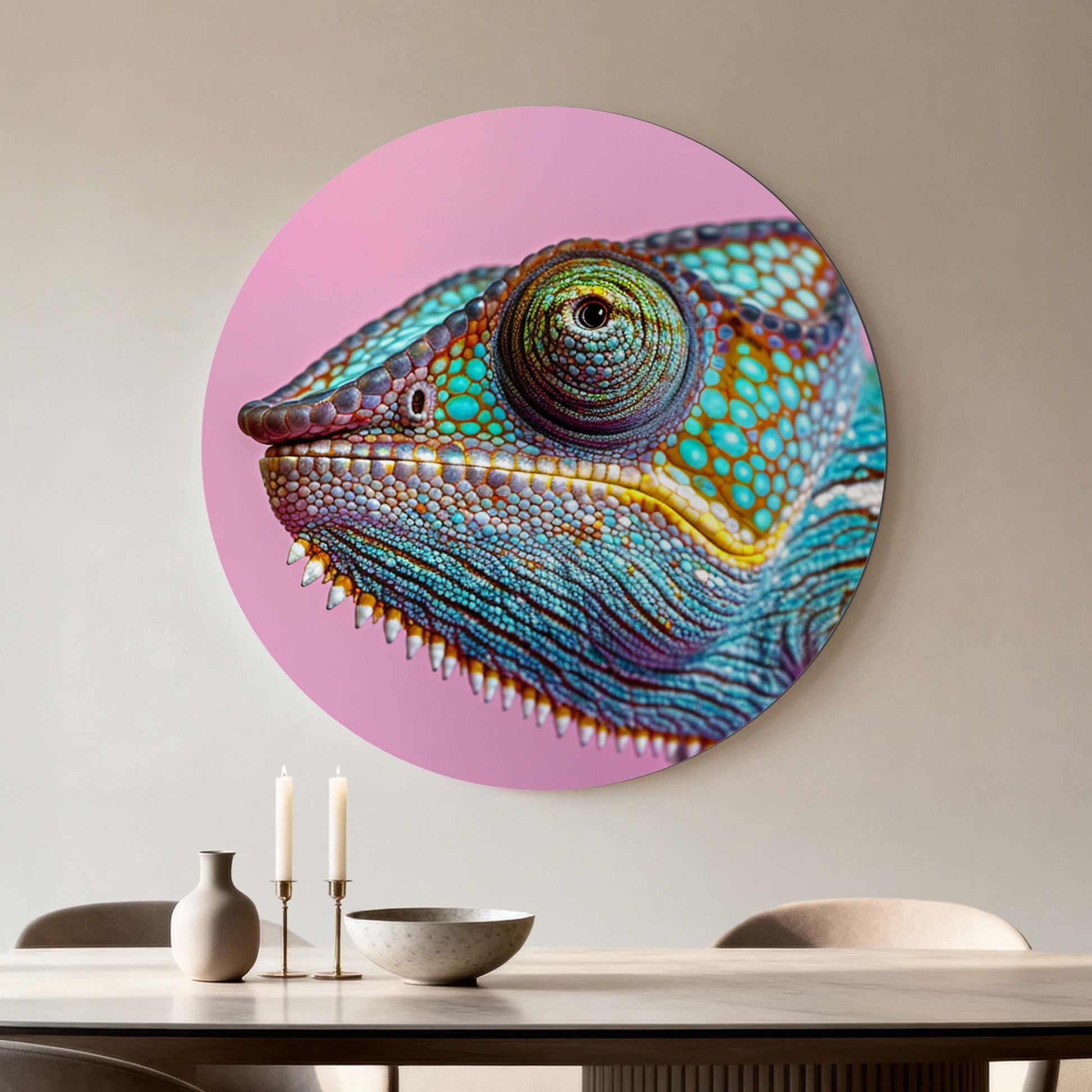 Tropical Gaze brengt een explosie van kleur aan je muur. De kameleon met zijn turquoise en paarse tinten tegen een zachte roze achtergrond vormt een moderne en speelse blikvanger in elk interieur.