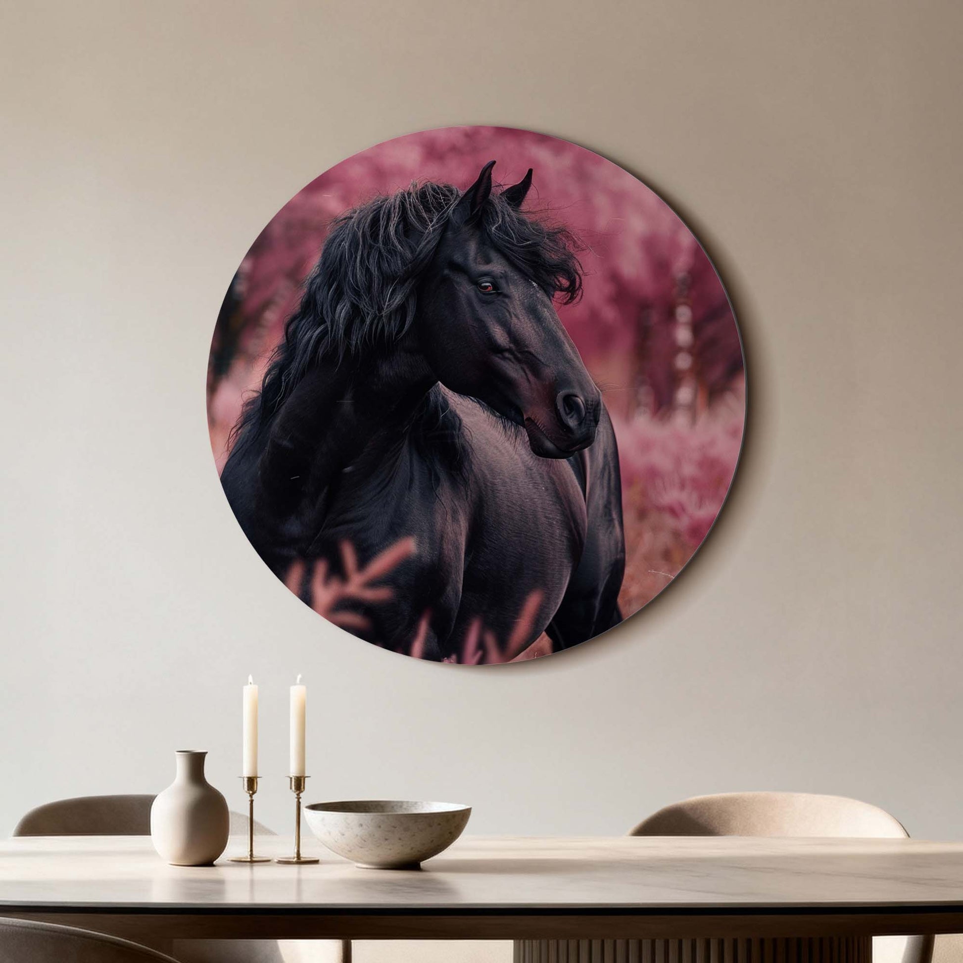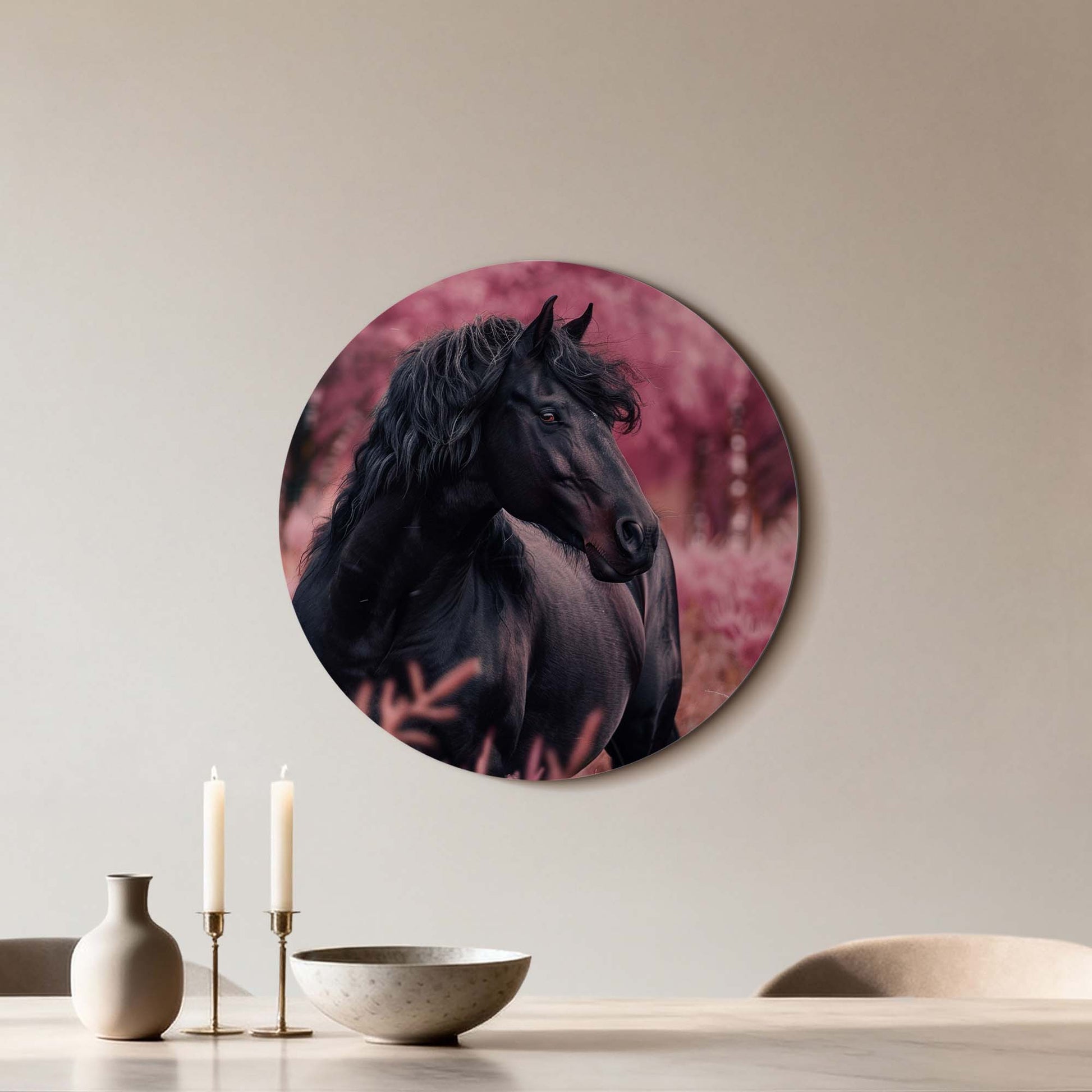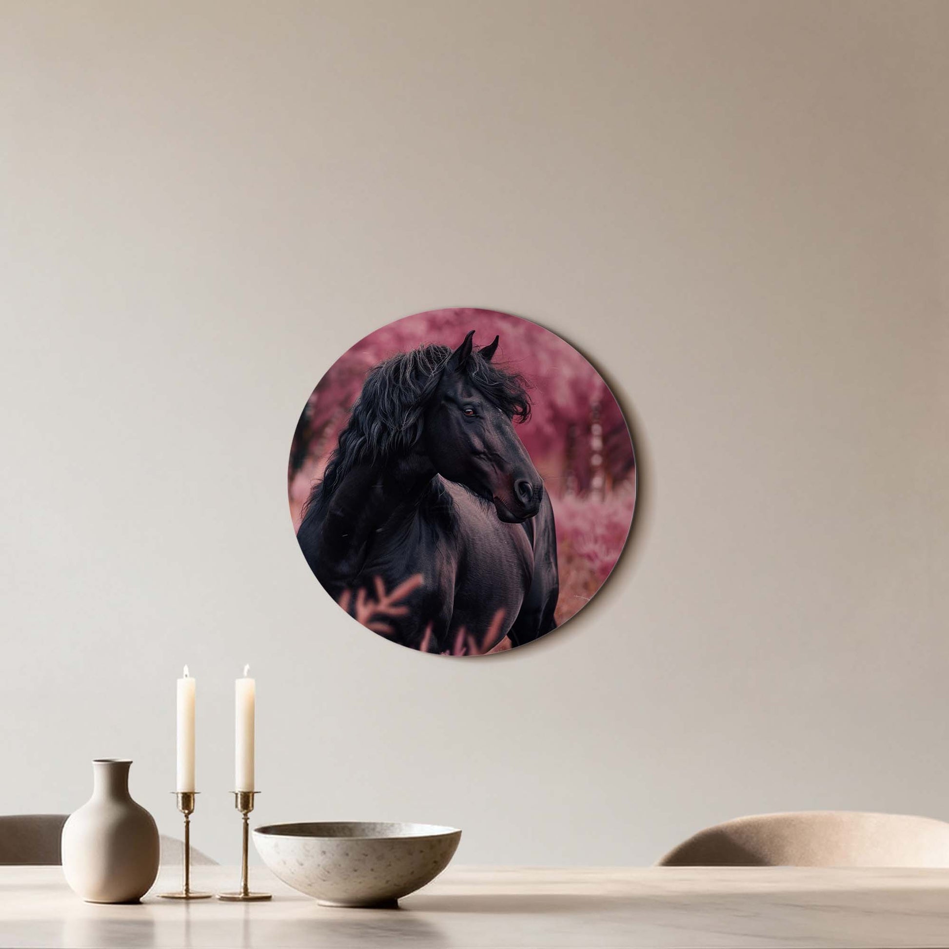 Velvet Spirit toont de kracht en elegantie van een zwart paard in een magisch roze landschap. Een betoverende muurcirkel die rust, mystiek en verfijning samenbrengt in één tijdloos kunstwerk.