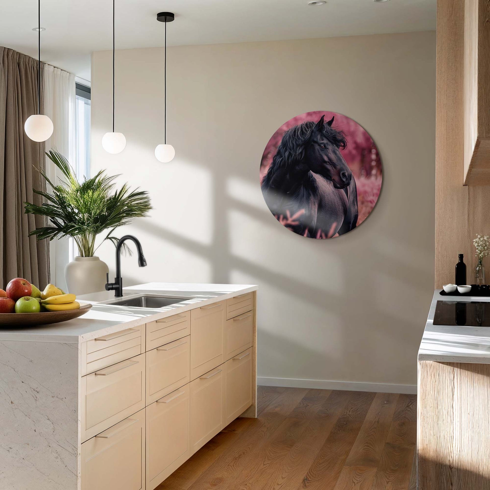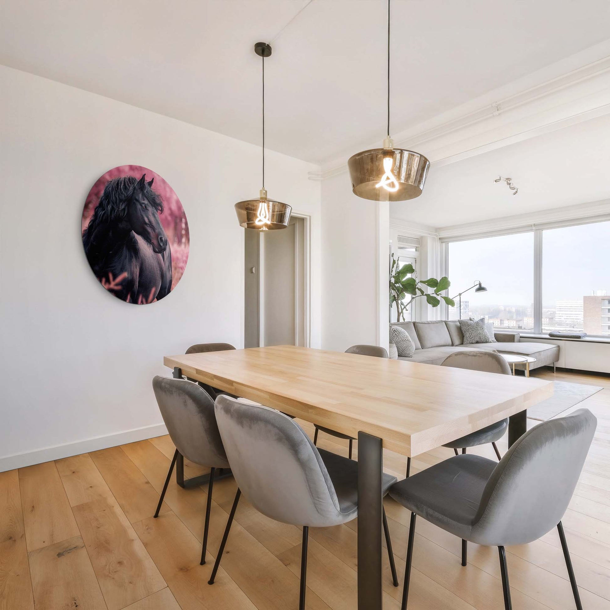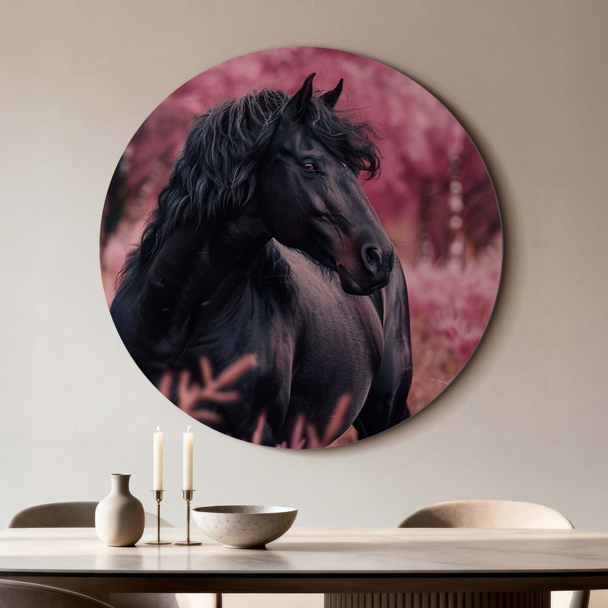 Velvet Spirit toont de kracht en elegantie van een zwart paard in een magisch roze landschap. Een betoverende muurcirkel die rust, mystiek en verfijning samenbrengt in één tijdloos kunstwerk.