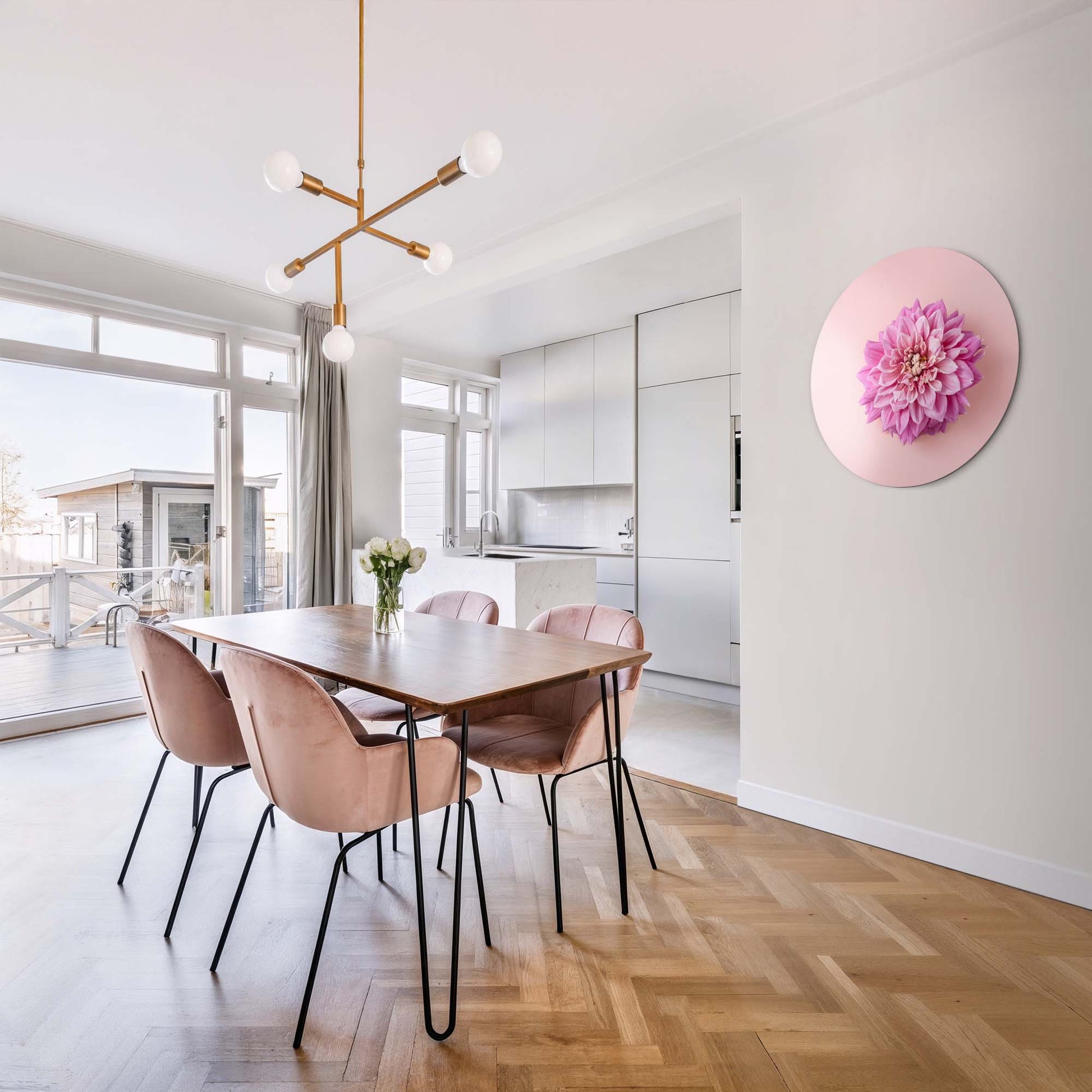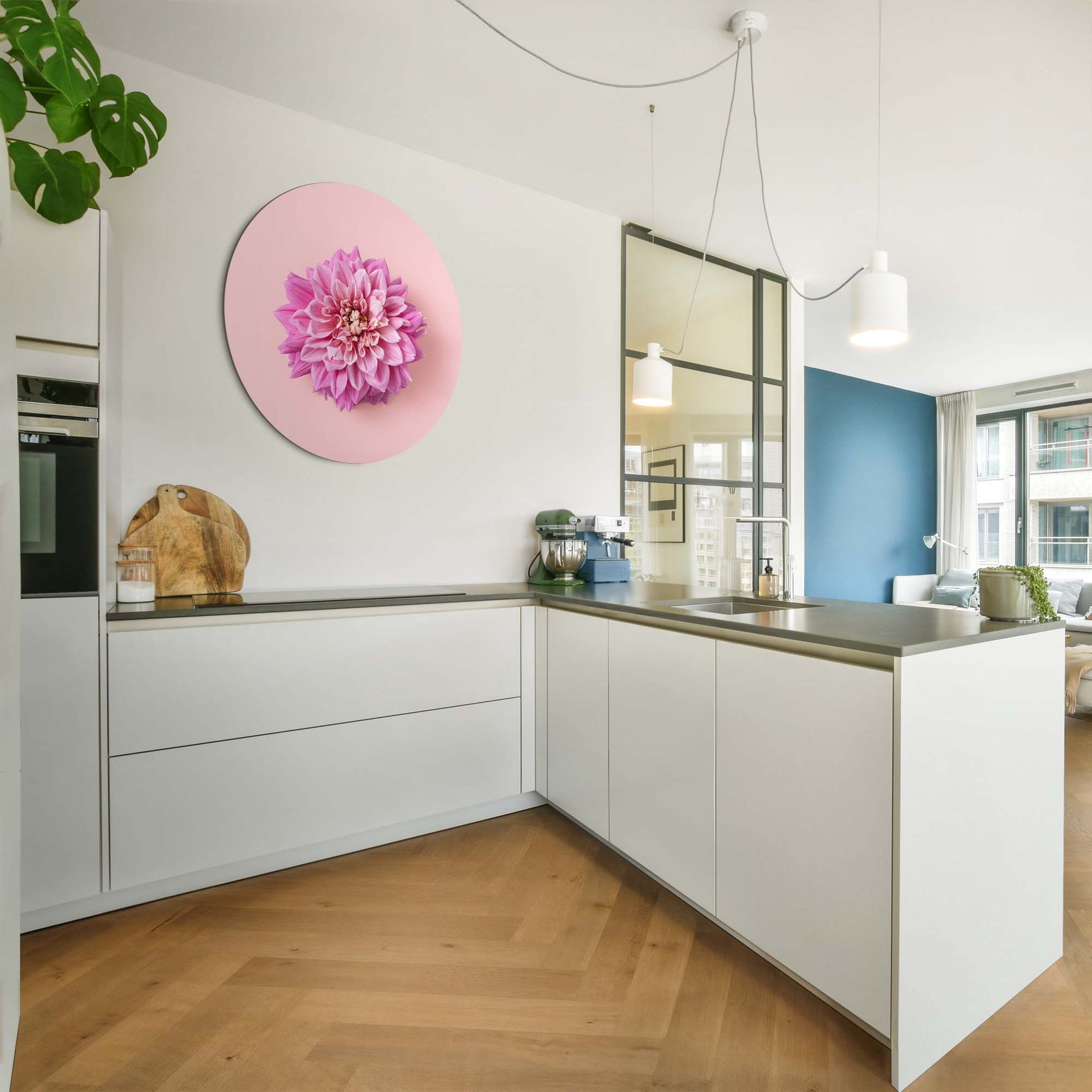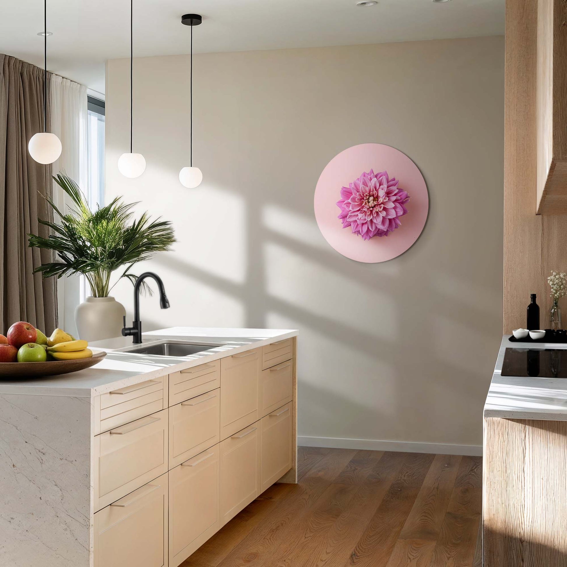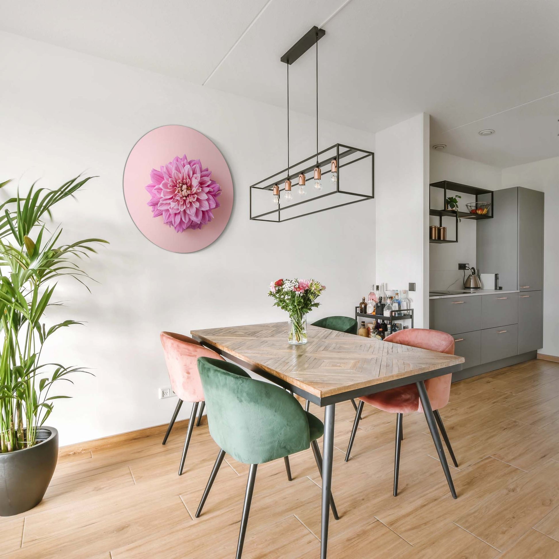 Een dromerige roze dahlia op een zachte pastelachtergrond. De Zachte Dahlia muurcirkel brengt rust, elegantie en warmte in je interieur.